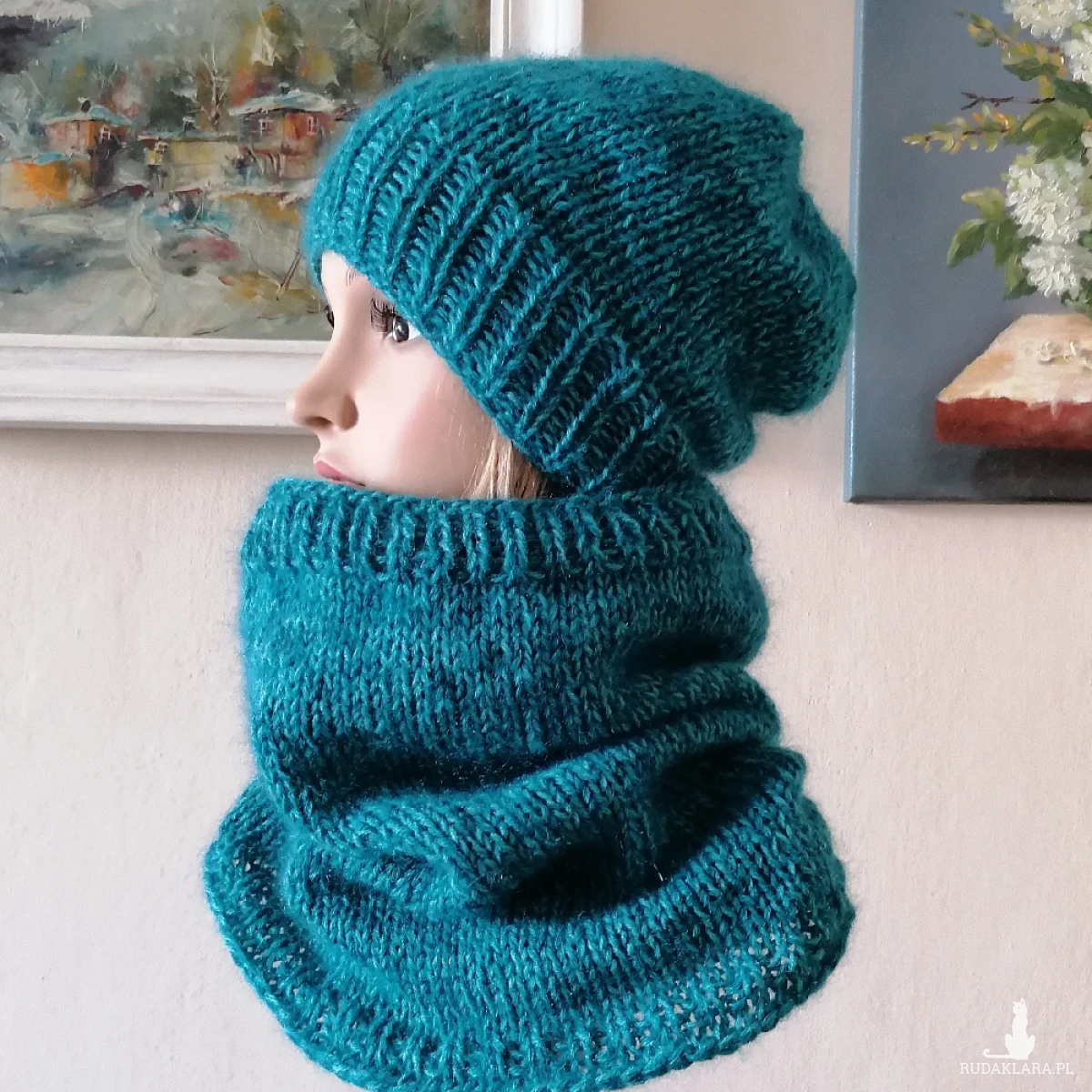 Puszysty, miły, ciepły, lekki, bezszwowy komplet, wykonany ręcznie na drutach z indywidualnie dobranych włóczek o składzie: wełna, jedwab, moher, alpaka, akryl. Sztucznych włókien ok. 10%. Komplet utrzymany w ciekawym, głębokim odcieniu szmaragdu z nutą turkusu. Włóczki są cudownie miękkie, a komplet oryginalny i bardzo twarzowy. Wymiary: czapka dł. 26 cm. polecam dla obwodów głowy 56-57, komin szer. 54 (góra), 62 (dół), dł. 38 cm.
