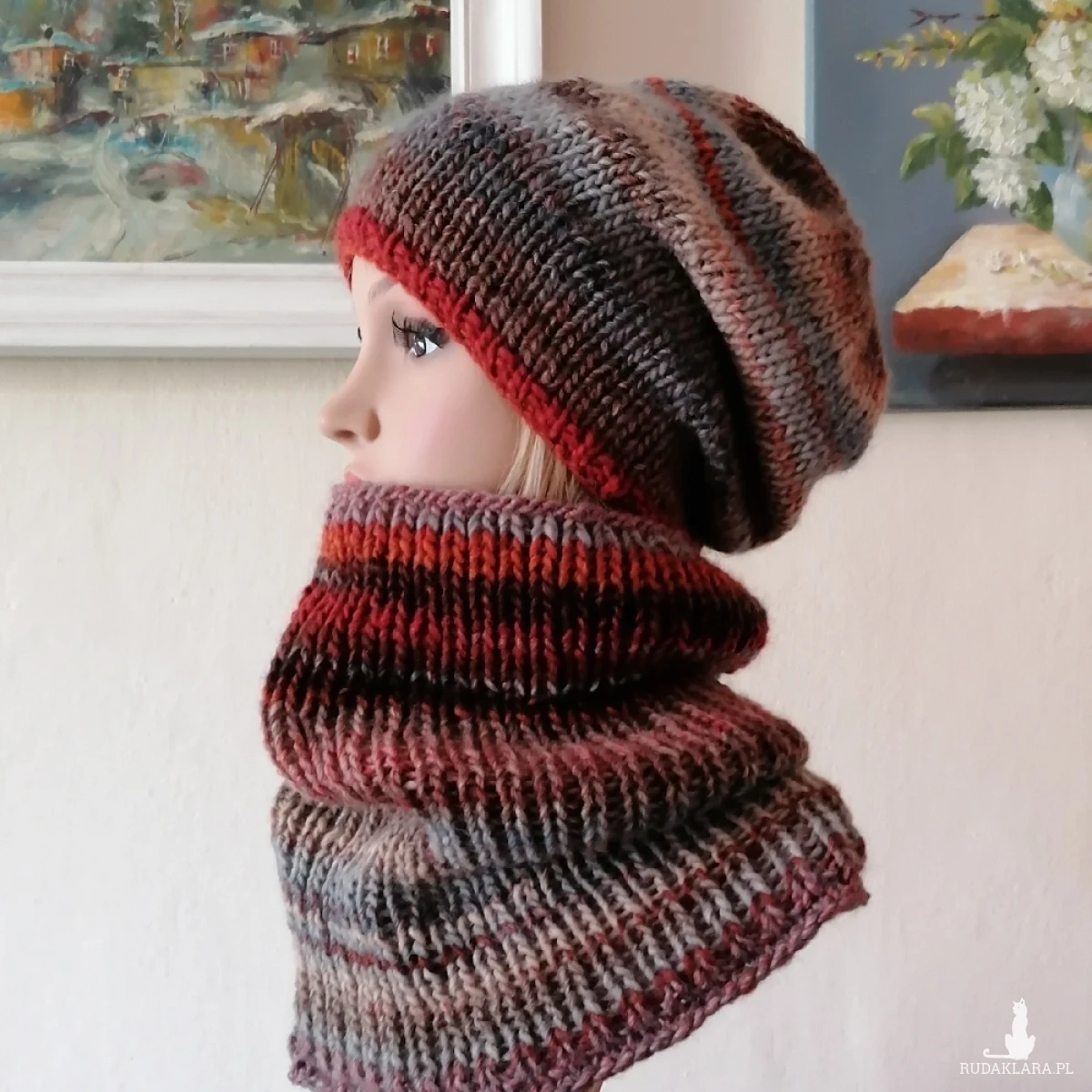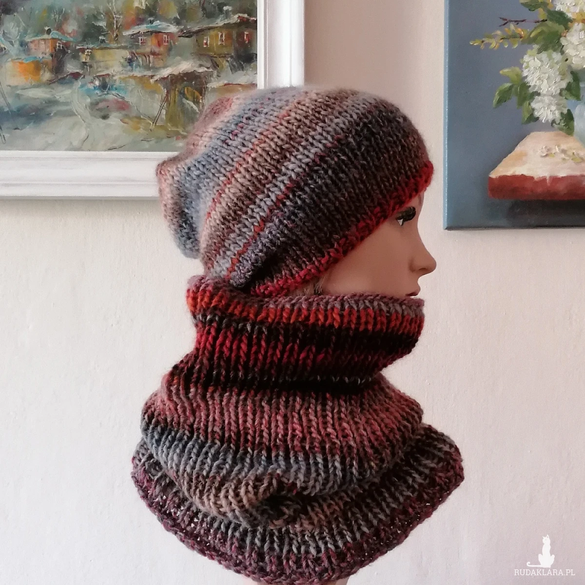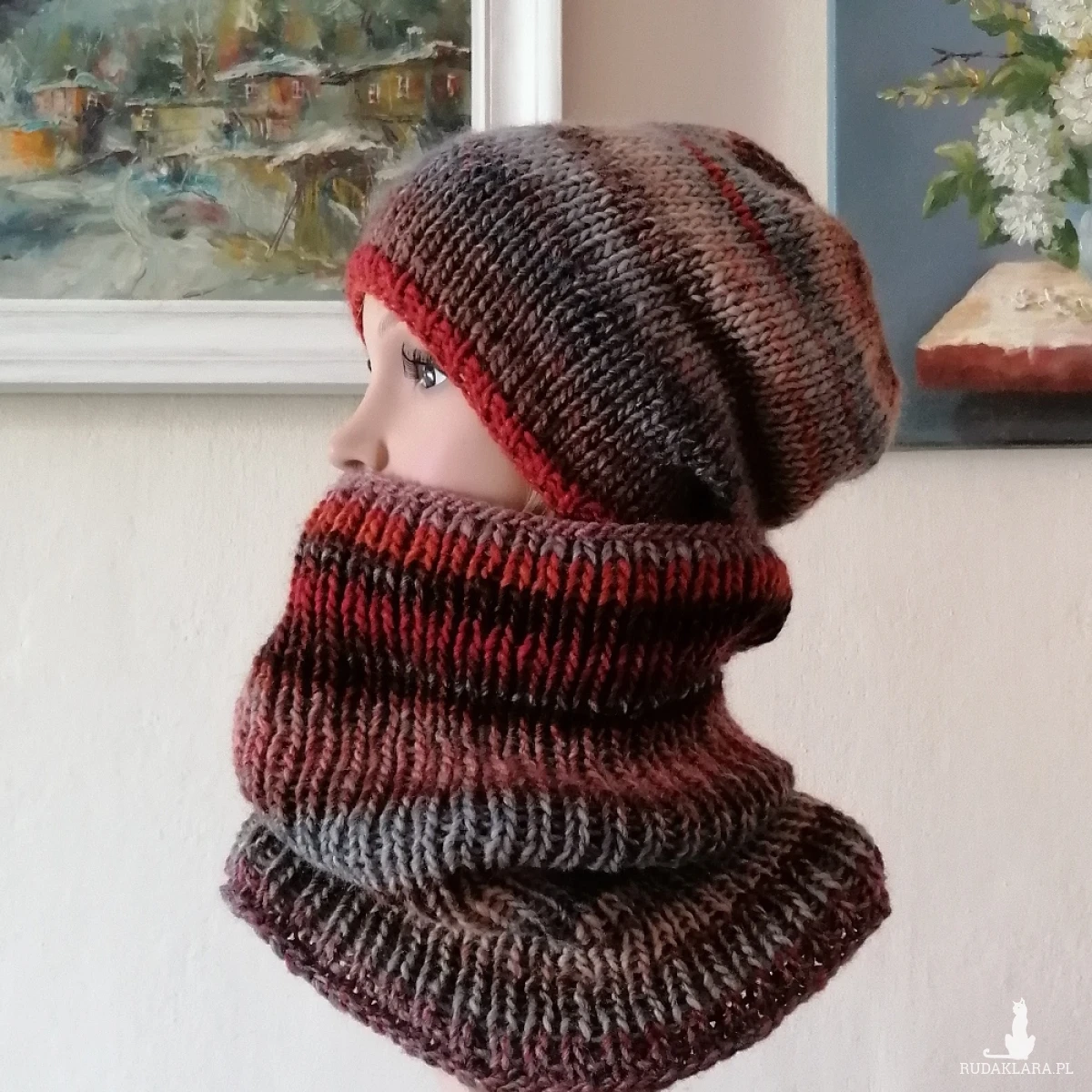 Miły, ciepły, lekki bezszwowy (robiony naokoło, a nie zszywany) komplet, wykonany ręcznie na drutach z doskonałej hiszpańskiej włóczki o składzie: 53% wełna, 47% akryl. Włóczka jest delikatna, przyjemna dla skóry, a kolory interesujące. Komplet doskonale ochroni przed zimnem, doda też charakteru różnym stylizacjom. Wymiary: czapka dł. 26 cm, polecam dla obwodów głowy 56-58 cm., komin szer. 50 cm (góra), 56 (dół), dł. komina 36 cm. Komin wykonany został elastycznym ściegiem i są to wymiary bez jakiegokolwiek rozciągania. Pranie ręczne.
