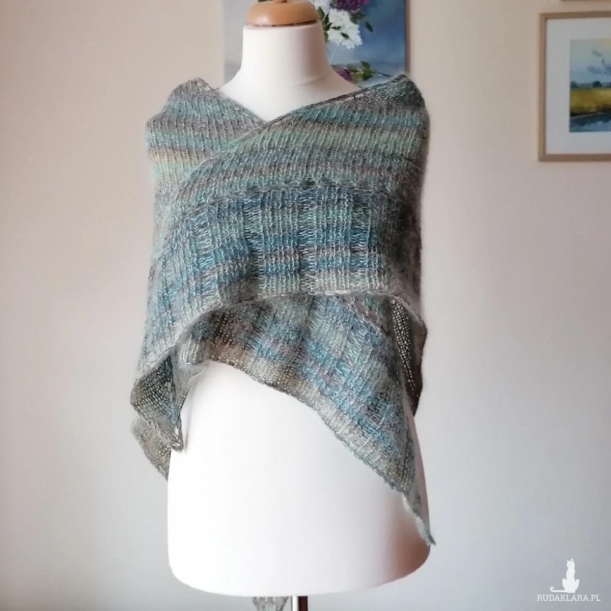 Bardzo duża ekskluzywna chusta wykonana ręcznie na drutach podwójną nitką z najwyższej jakości włóczek: cudownie miękkiego francuskiego moheru z jedwabiem (75%/25%) i niezwykłej, certyfikowanej (niestety znacznie droższej) włóczki niemieckiego producenta (wełenka pochodzi z Patagonii) o składzie: 85% merino, 15% poliamid. Kombinacja włóczek dała nie tylko wyjątkowy efekt kolorystyczny (brak srebrnych nitek!), ale też twarzowe odcienie, pasujące do różnych typów urody. Chusta jest bardzo ciepła, miła, delikatnie puchata i przede wszystkim lekka. Latem z powodzeniem zastąpi wierzchnie okrycie, a w chłodniejszych miesiącach będzie świetnym dodatkiem do dowolnych stylizacji. Chustą można otulić nią cała sylwetkę. Wymiary: 202 cm. bok najdłuższy, 102 wysokość trójkąta. Pranie wyłącznie ręczne.