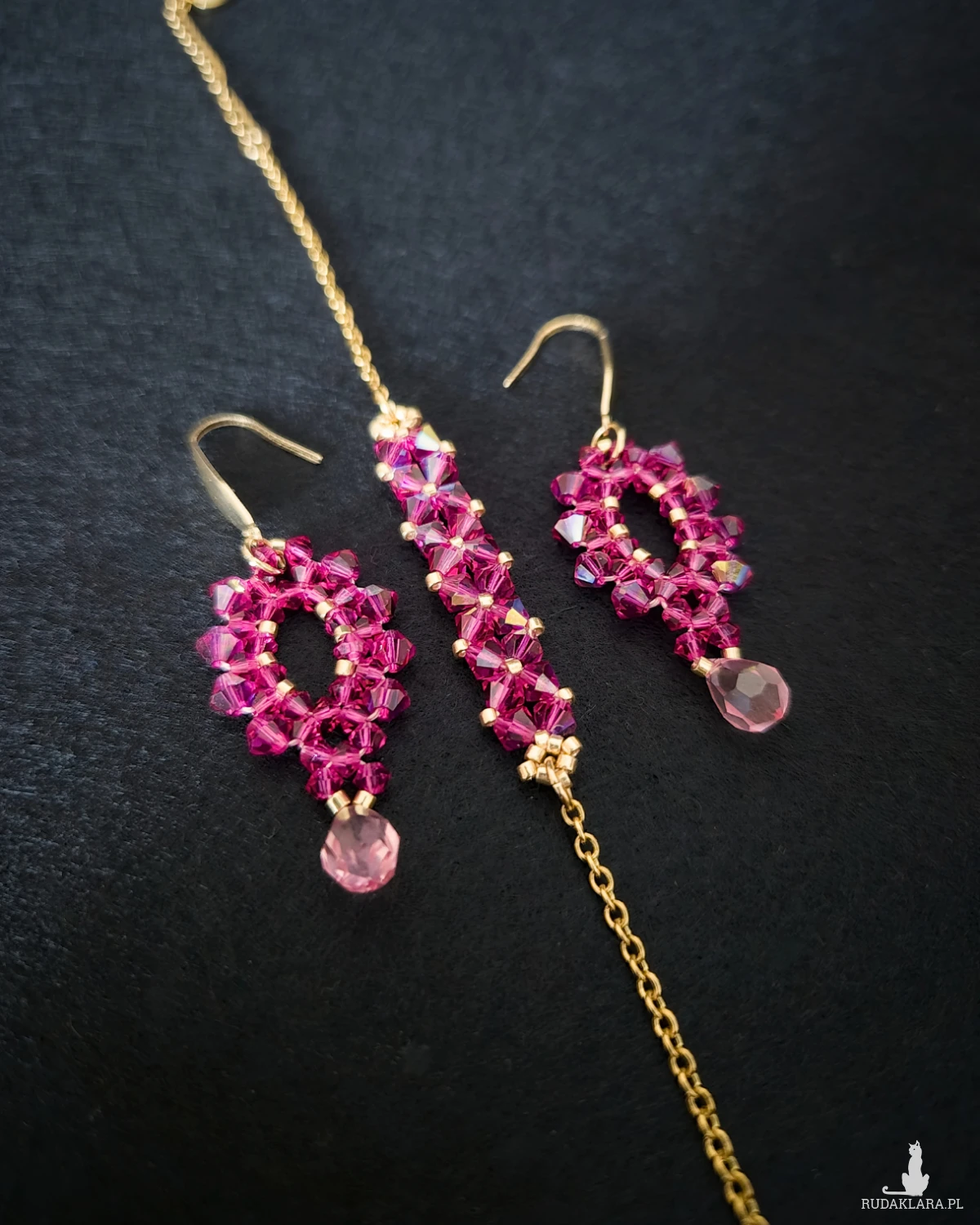 Na końcu kolczyków - fasetowana łezka w kolorze Rose, która łagodzi intensywność fuksji i nadaje całości bardziej miękki rytm.