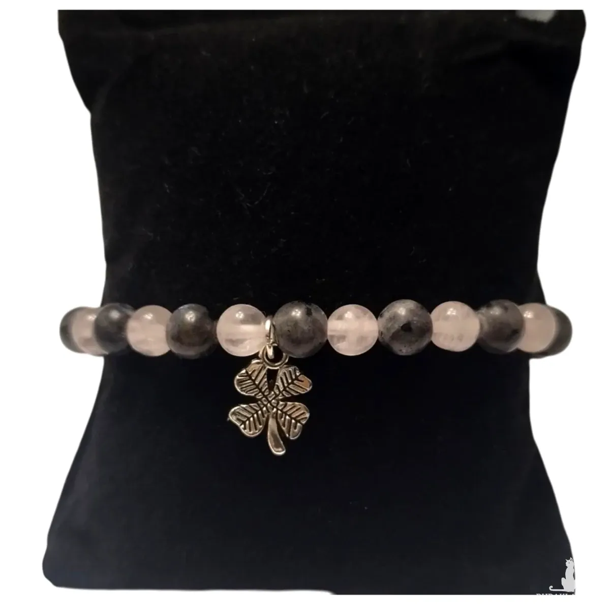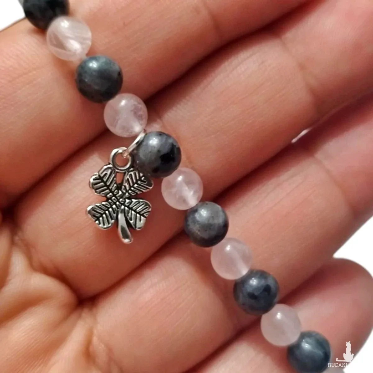 Bransoletka na gumce wykonana z kulek kamieni labradorytu i różowego kwarcu w rozmiarze 6mm, Każdy kamyczek labradorytu to odcienie szarości zaś różowy kwarc to kamyczki jasne z bardzo delikatnym odcieniem koloru różowego. Bransoletka została ozdobiona zawieszką w kształcie czterolistnej koniczyny.