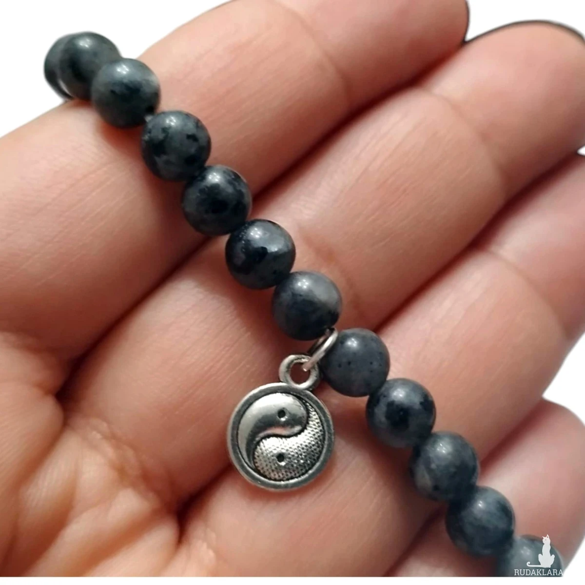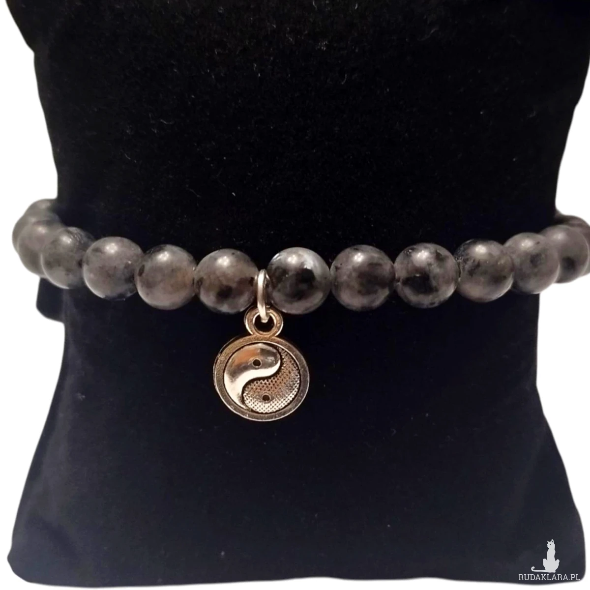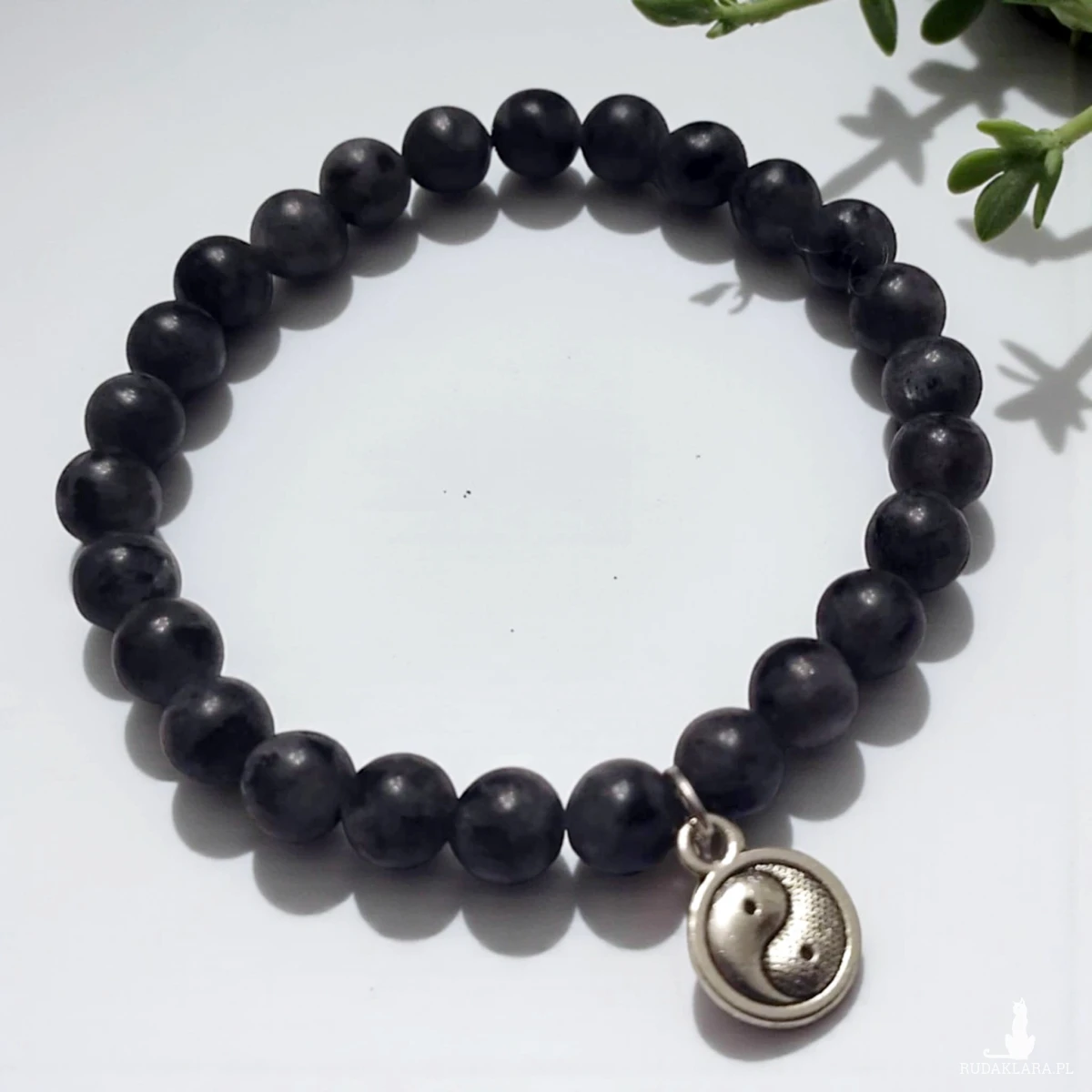 Bransoletka na gumce wykonana z kulek kamieni labradorytu w rozmiarze 6mm, Każdy kamyczek labradorytu to odcienie szarości z czernią. Bransoletka została ozdobiona zawieszką.