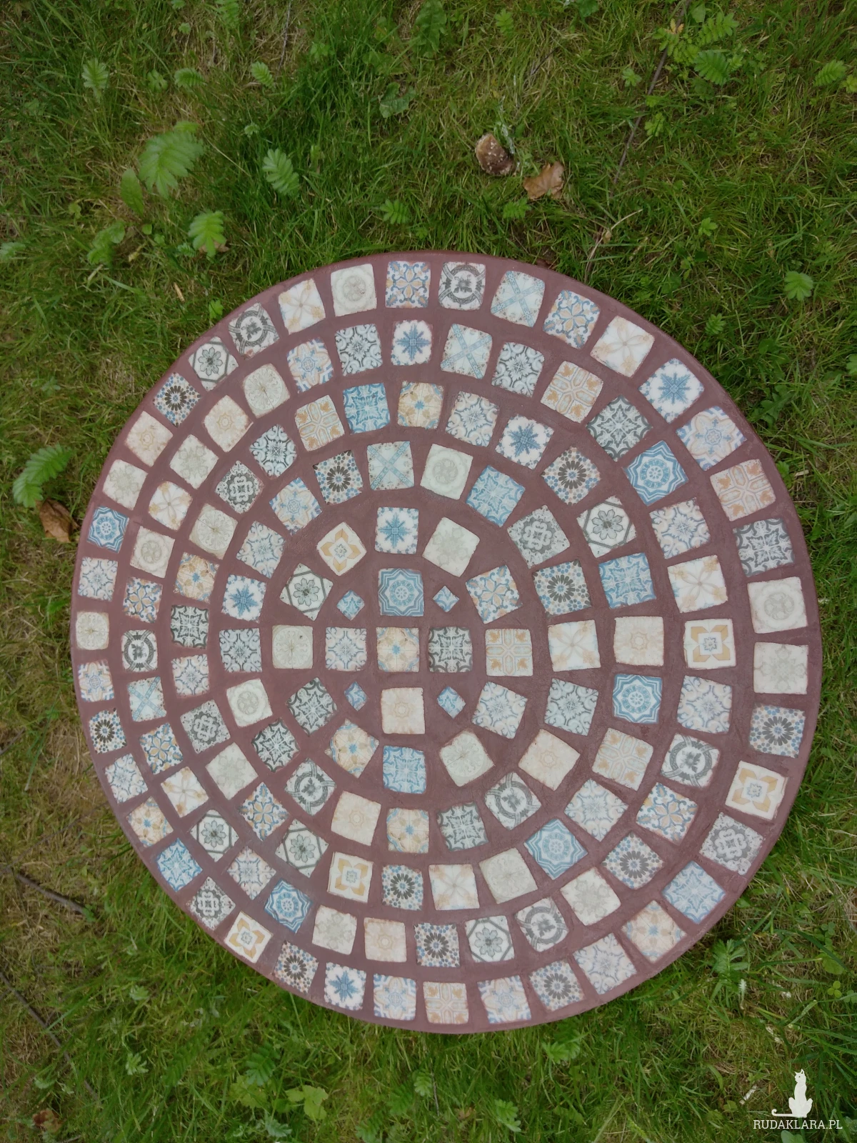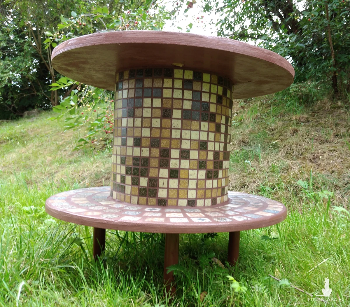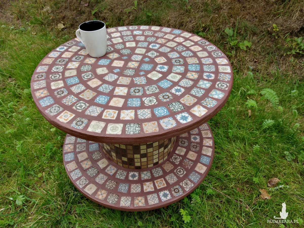Szpula sklejkowa pokryta mozaiką ceramiczną i fugą na wierzchu i na trzonie oraz malowana od spodu blatu. Styl hiszpański. Średnica 60 cm. Wysokość 55,5 cm, w tym 20 cm metalowe nóżki pomalowane na brązowy kolor. Nadaje się do ogrodu czy na taras. Materiał zabezpieczony przed warunkiem pogody. Takiego stolika nie znajdzie się w sklepie. Stolik zrobiony wg weny artystki.