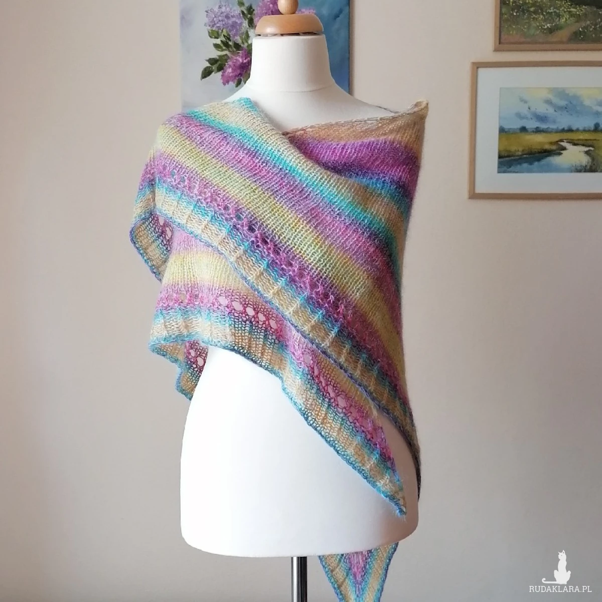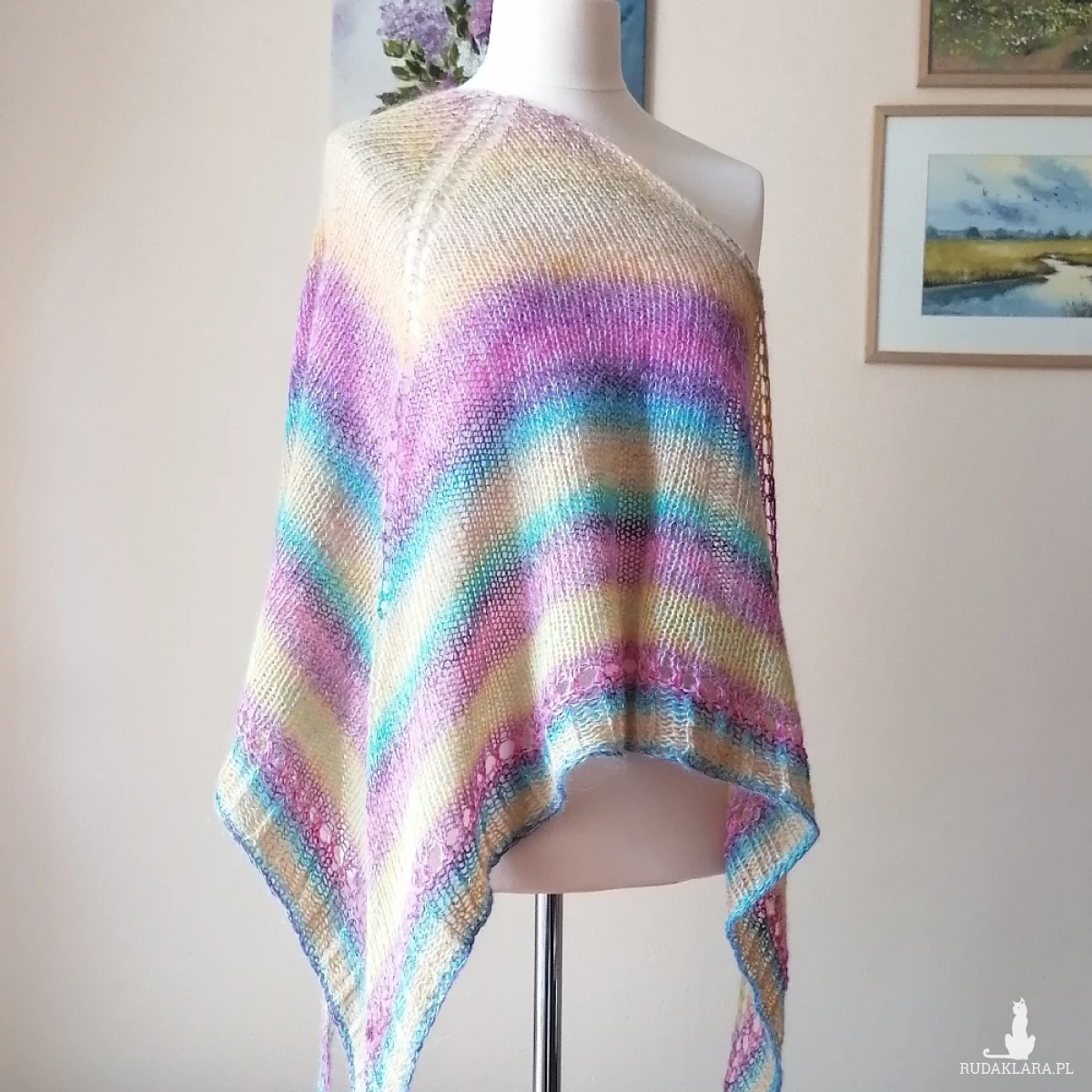 Bardzo duża chusta wykonana ręcznie na drutach podwójną nitką z uroczych włóczek: moheru z poliamidem (75%/25%) i włóczki niemieckiego producenta, utrzymanej w uroczo-pastelowej (ale nie mdłej) tonacjach o składzie: wełna, wełenka merino i niewielka ilość akrylu. Kombinacja włóczek dała ciekawy efekt kolorystyczny. Chusta jest bardzo ciepła, puchata, a przy tym lekka. Jest lejąca i pięknie się układa. To ciepła chusta, która otulając latem i wiosną sylwetkę, zastąpi okrycie wierzchnie, a zimą i jesienią przytulnie ogrzeje. Wymiary: 224 cm. bok najdłuższy, 108 wysokość trójkąta. (Brak jakichkolwiek srebrnych nitek, jeśli są widoczne, to efekt odbicia światła w soczewce aparatu). Pranie wyłącznie ręczne.