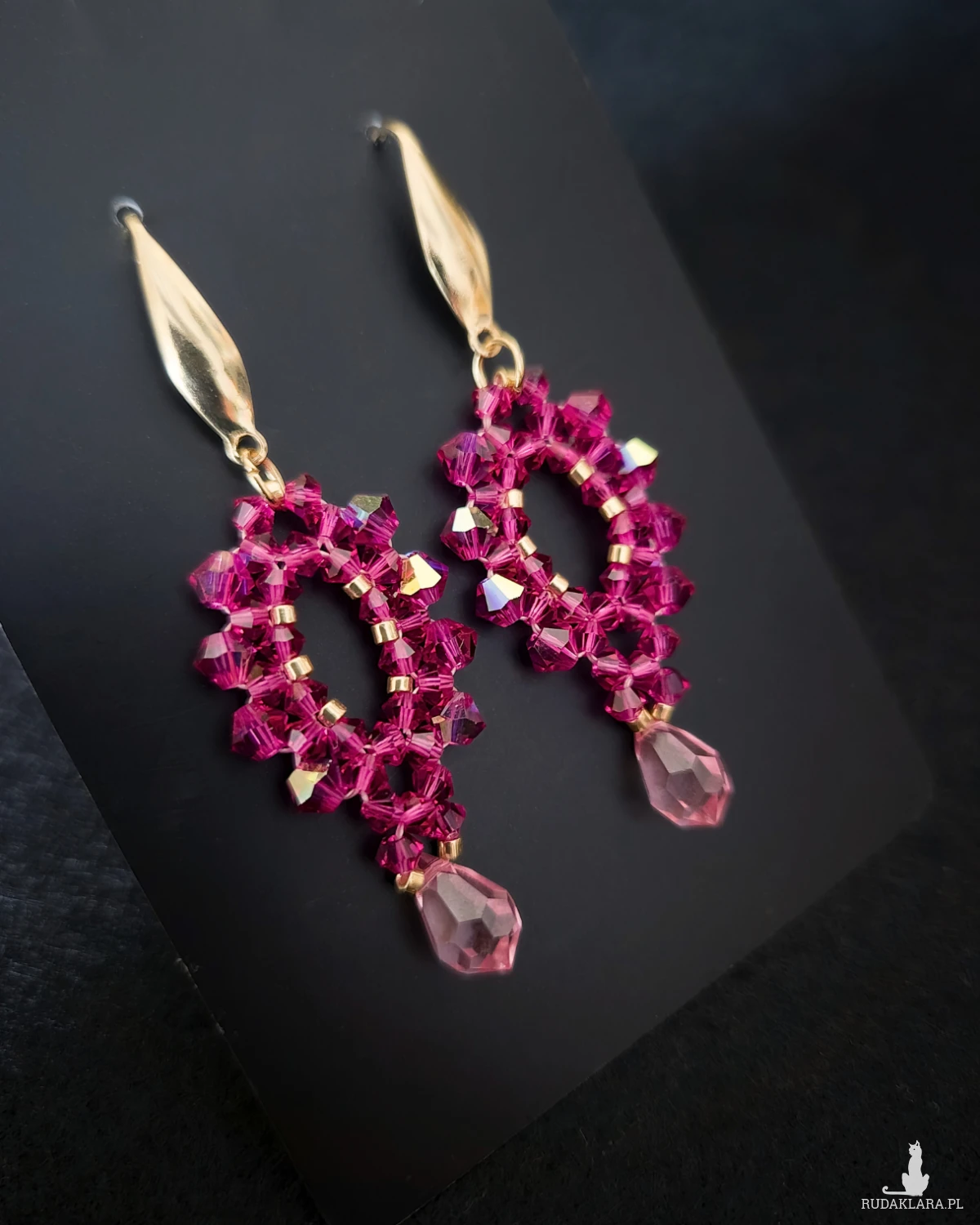 Na końcu kolczyków - fasetowana łezka w kolorze Rose, która łagodzi intensywność fuksji i nadaje całości bardziej miękki rytm.