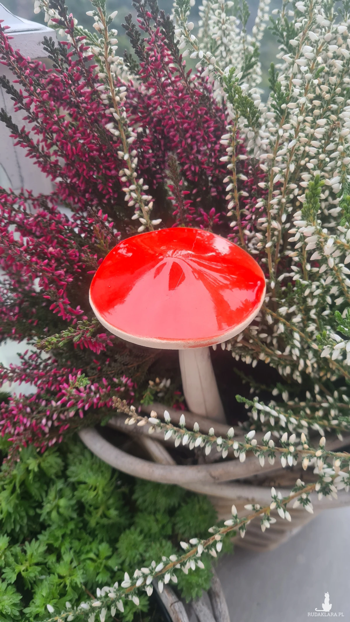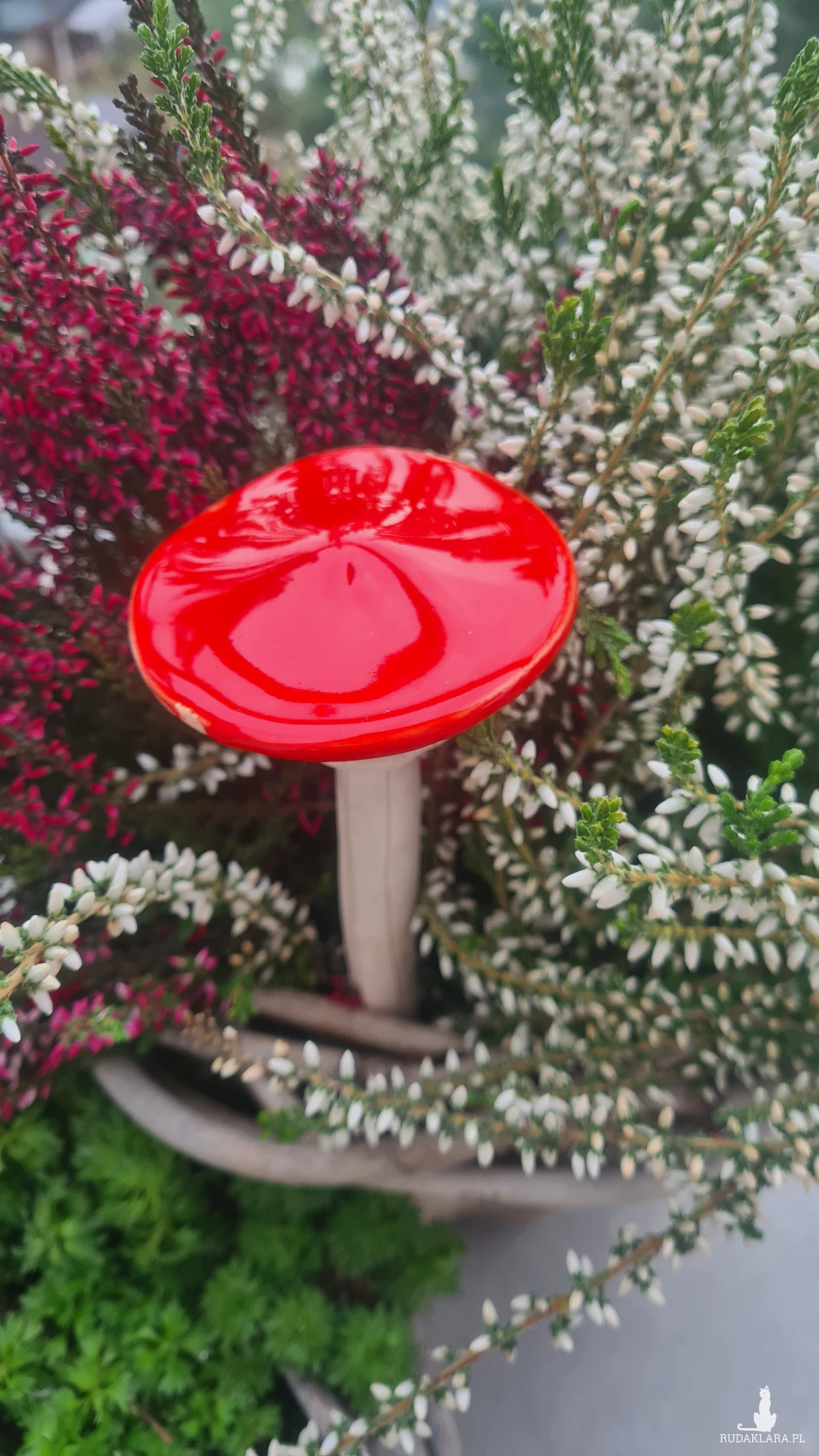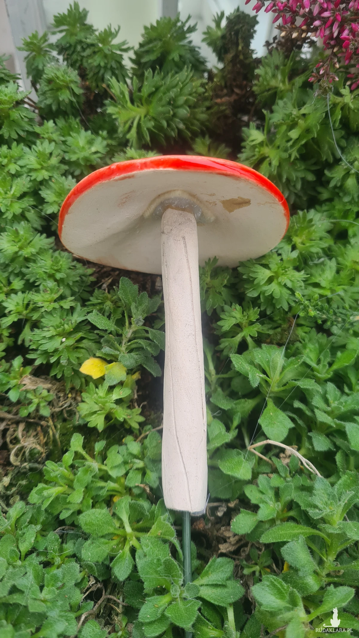 Ręcznie wykonany grzybek ceramiczny na druciku do wbicia np. w doniczkę, szkliwiony i dwukrotnie wypalany w piecu ceramicznym. Wielkość około 10 - 15 cm, średnica kapelusza około 8 cm.