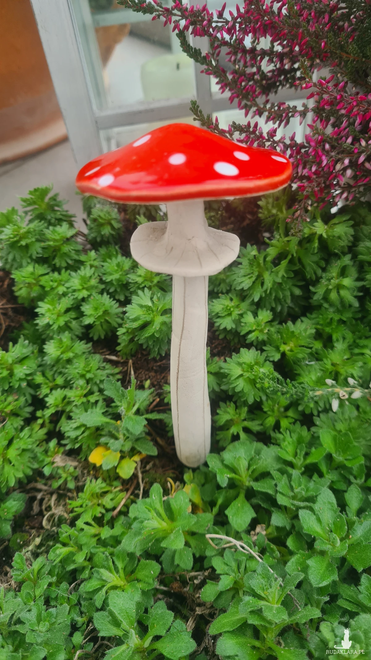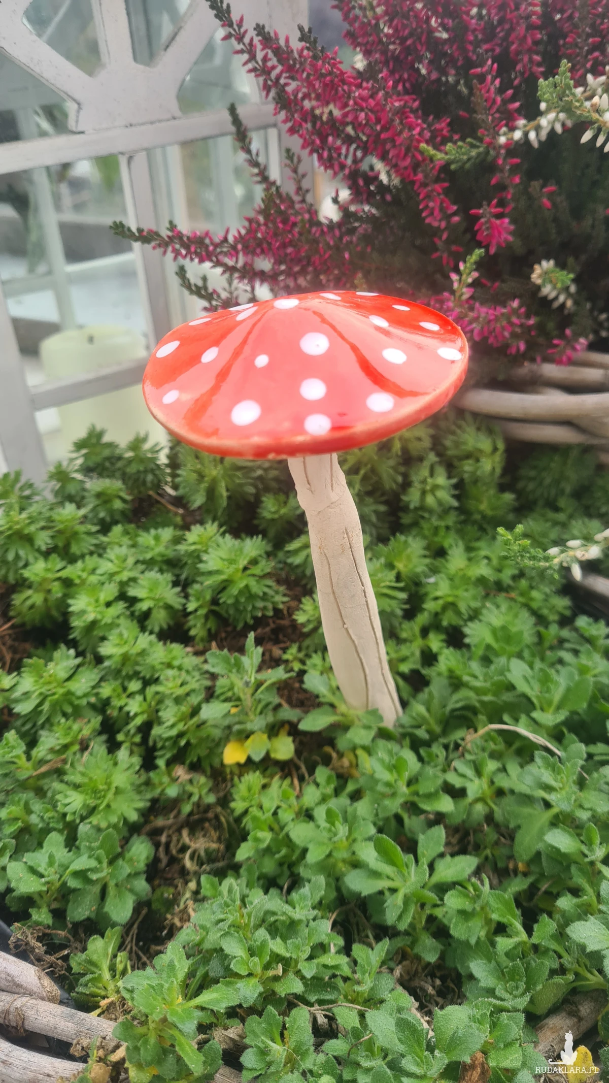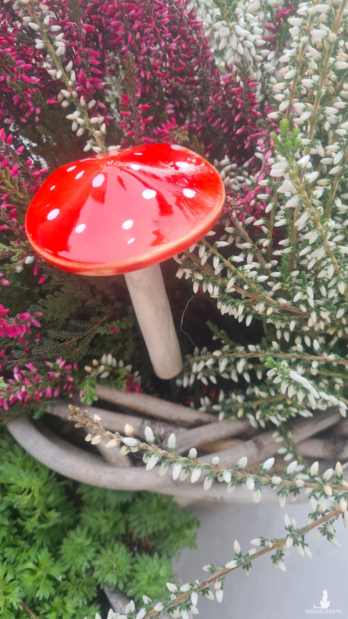 Ręcznie wykonany grzybek ceramiczny na druciku do wbicia np. w doniczkę, szkliwiony i dwukrotnie wypalany w piecu ceramicznym. Wielkość około 10 - 15 cm, średnica kapelusza około 8 cm.