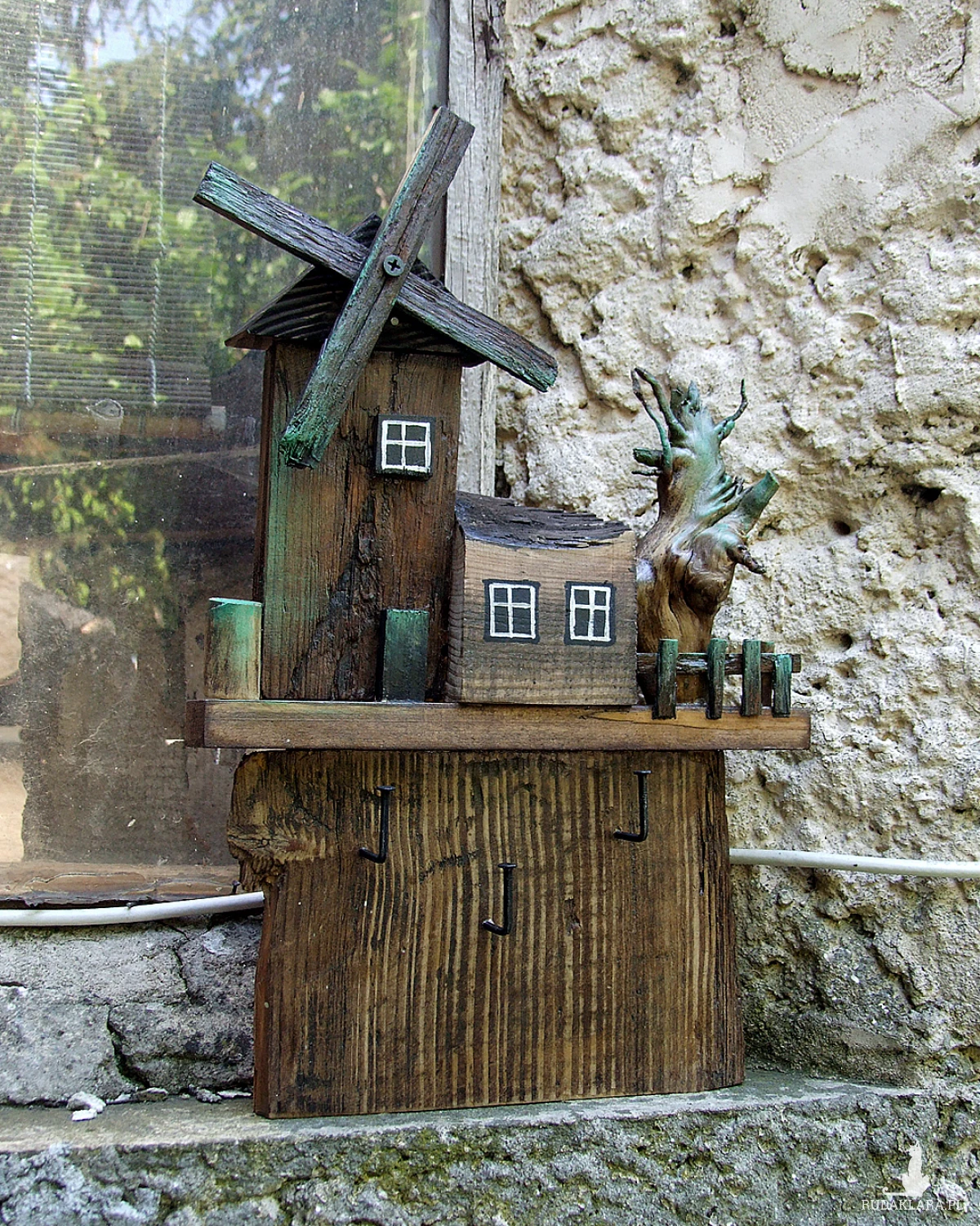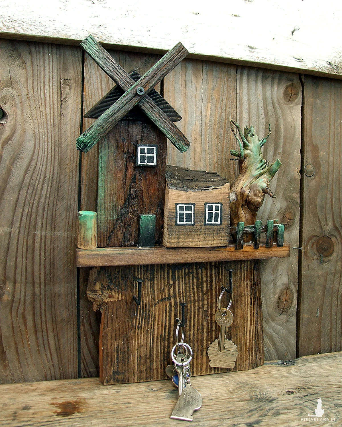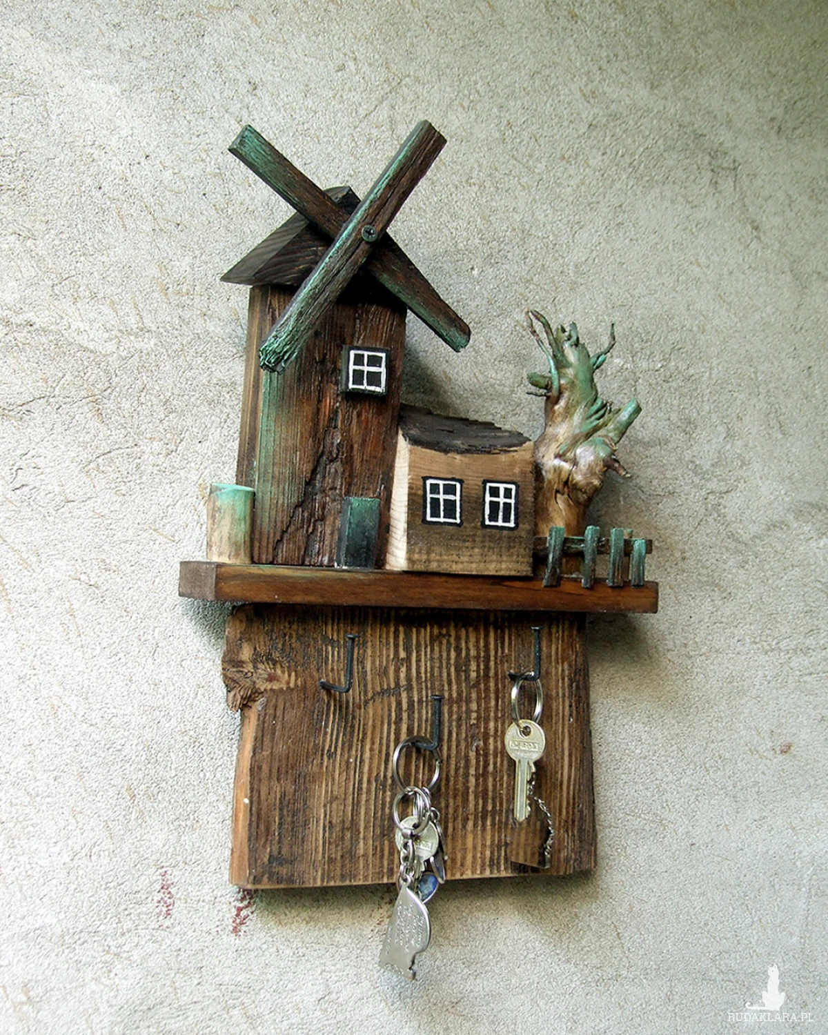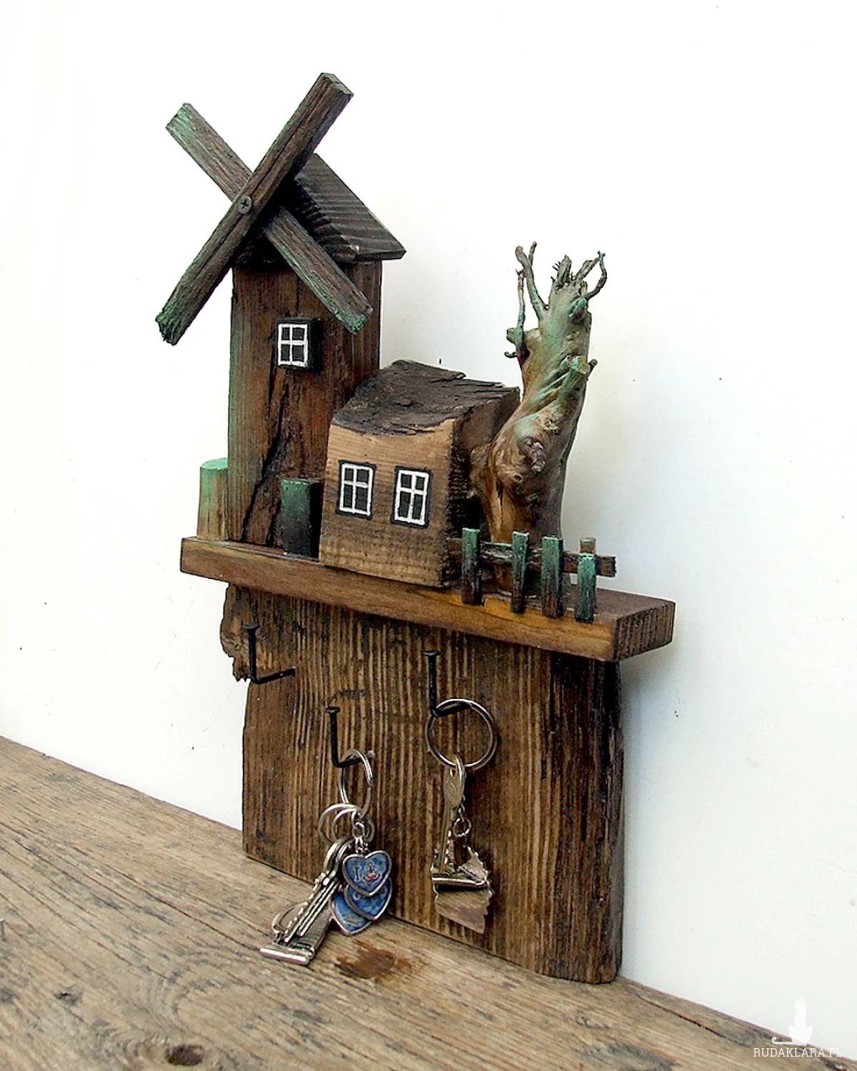 Drewniany wieszaczek na klucze, z młynem i starą wierzbą.