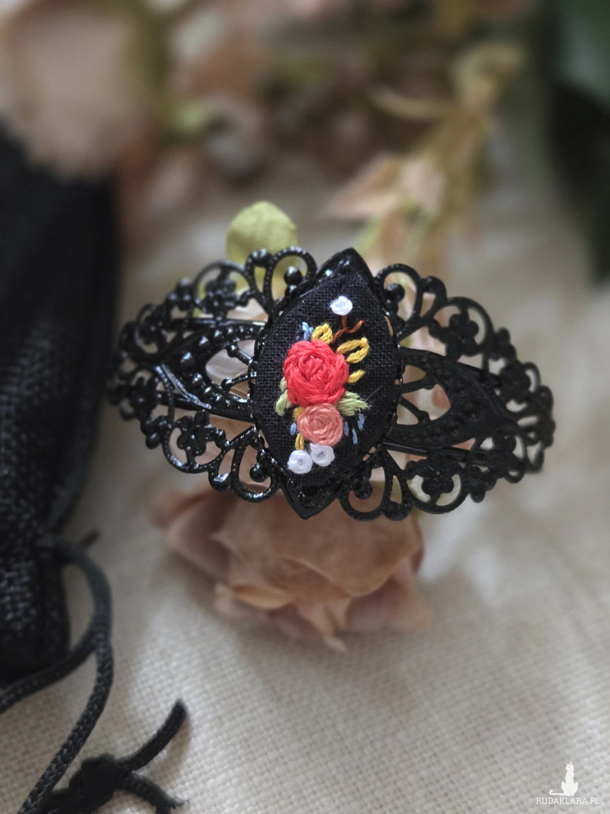 Ręcznie wyszywana bransoletka o średnicy 6,5 cm. Wykonana z czarnego, ażurowego metalu w formie otwartej obręczy nakładanej na nadgarstek. W centralnej części znajduje się owalna ozdoba z delikatnym haftem przedstawiającym kwiaty w odcieniach czerwieni, różu, żółci i zieleni. Bransoletka łączy w sobie styl vintage z romantycznym, rękodzielniczym charakterem, stanowiąc wyjątkowy dodatek do eleganckich i codziennych stylizacji.