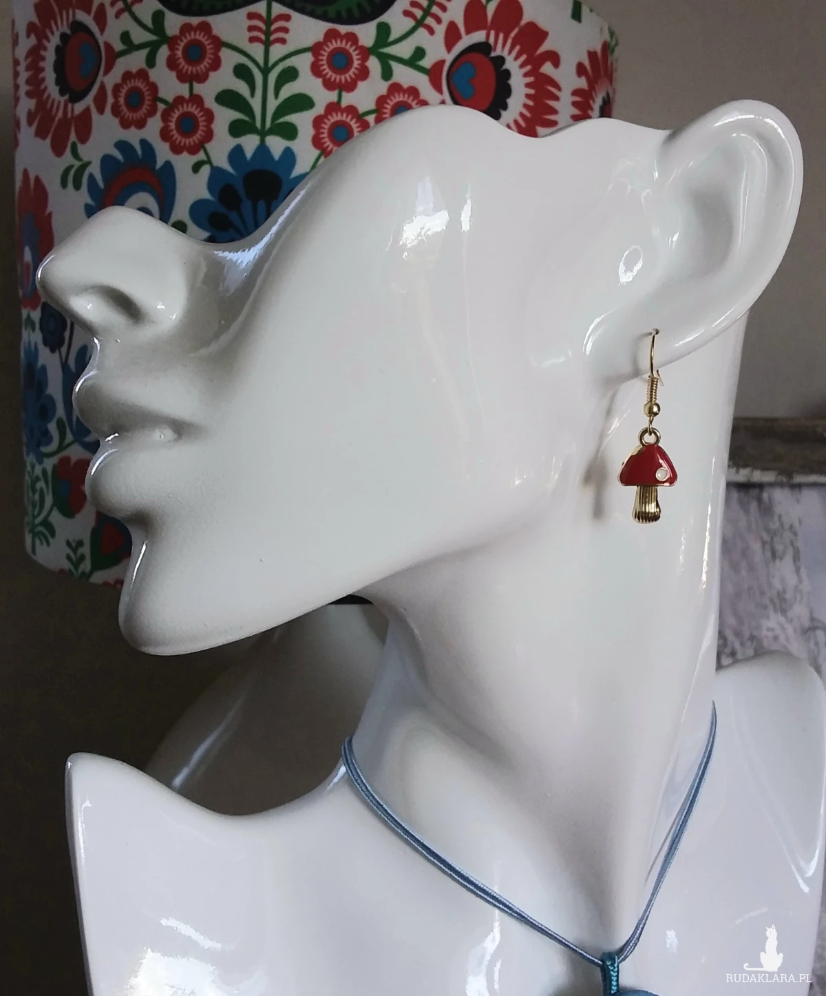 Kolczyki z motywem muchomorków, stal chirurgiczna. Dł. z biglem ok. 3,5 cm