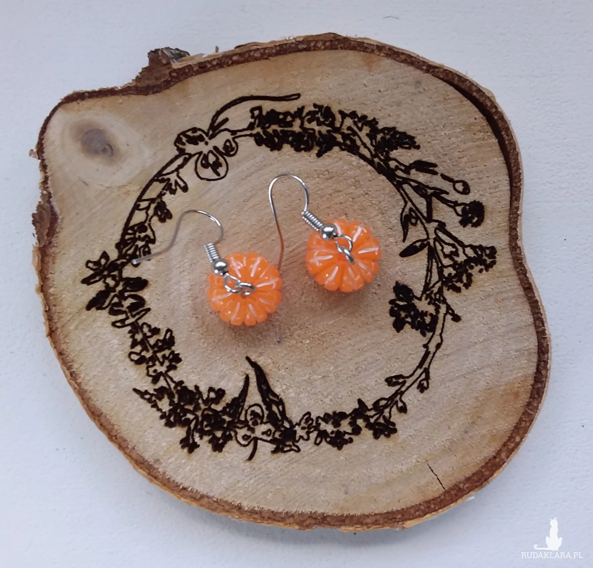 Kolczyki z motywem mandarynek, bigle ze stali chirurgicznej. Dł. z biglem ok. 3 cm