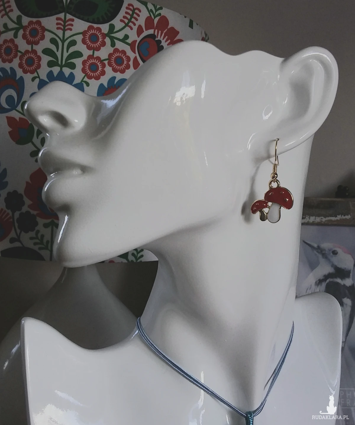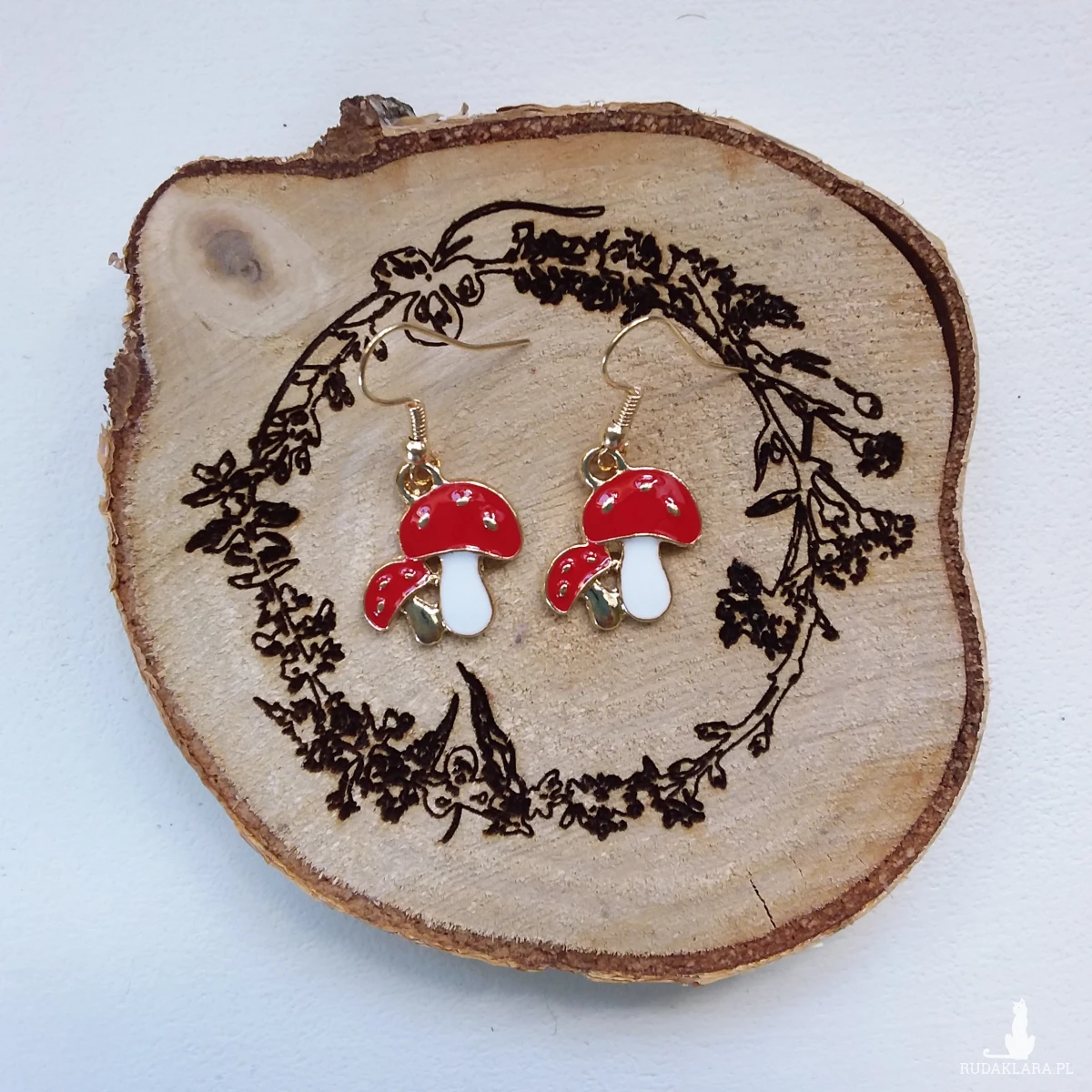 Kolczyki z motywem muchomorków, stal chirurgiczna. Dł. z biglem ok. 3, 5 cm
