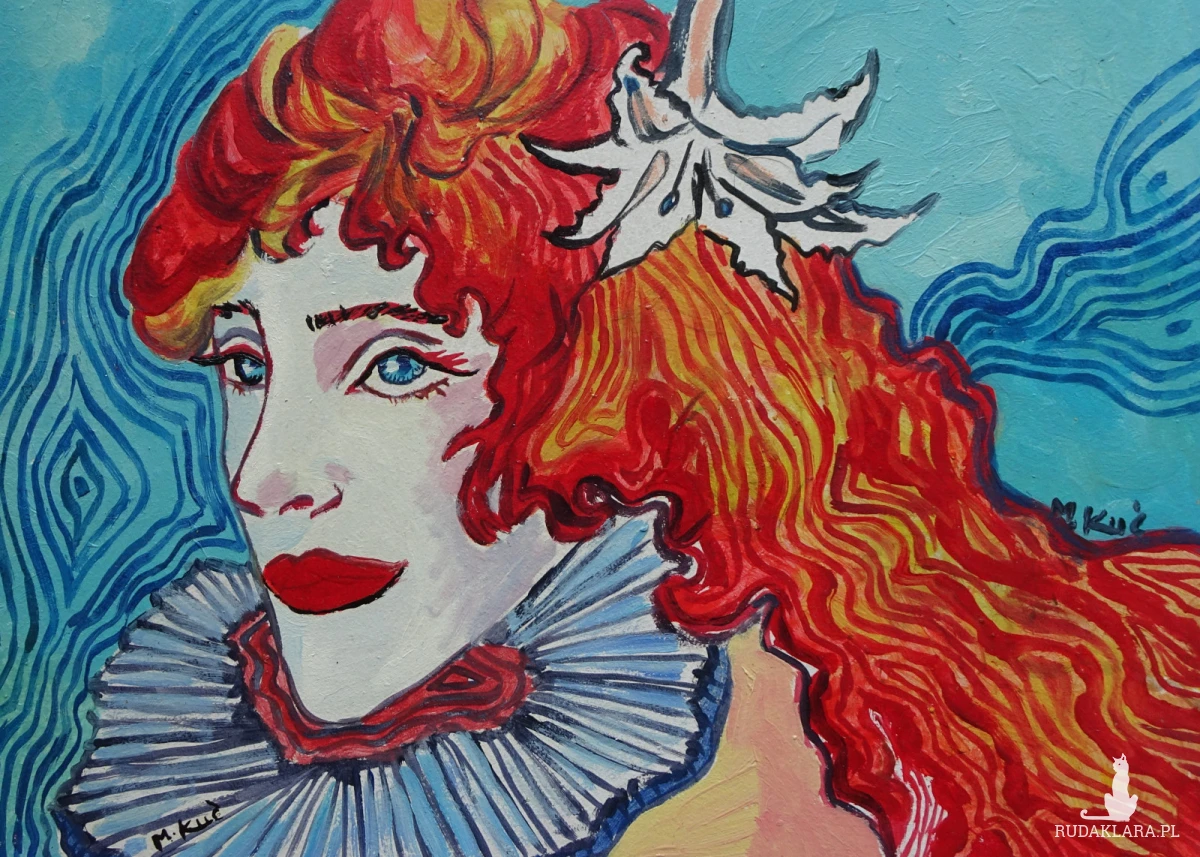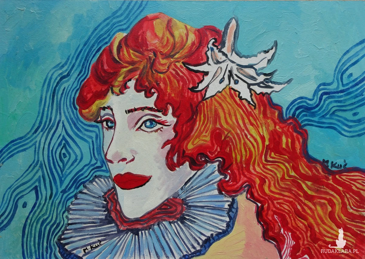 Kolor odgrywa w tej pracy kluczową rolę. Czerwień włosów jest niemal ogniem – symbolizuje pasję, energię, siłę wewnętrzną, ale też pewien dramatyzm. Z kolei tło w chłodnych tonach niebieskiego i zieleni wprowadza równowagę, stanowiąc kontrapunkt dla ciepłych barw postaci. W ten sposób artystka osiąga harmonię pomiędzy emocją a spokojem, między ekspresją a kontemplacją.