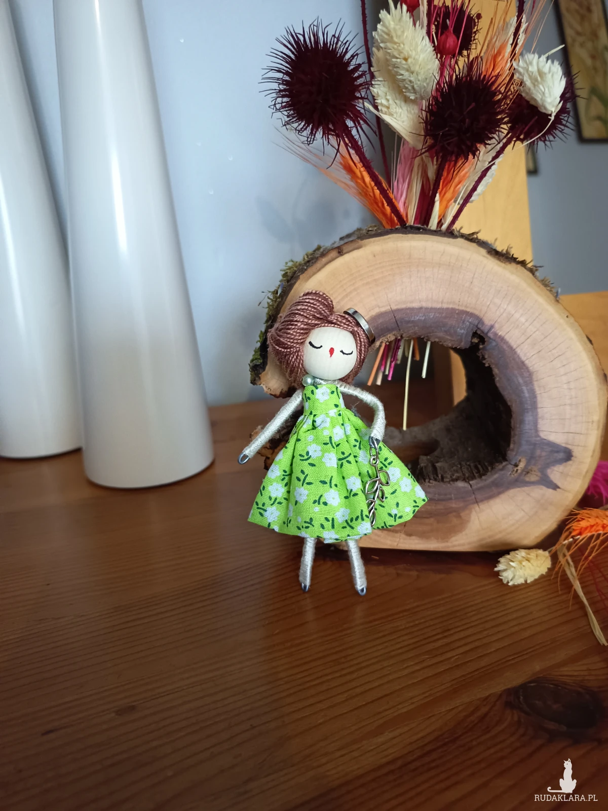 Ta unikalna broszka w kształcie mini laleczki przedstawia mini damę, wykonaną na bazie drutu i ozdobioną różnorodnymi tkaninami oraz dodatkami.