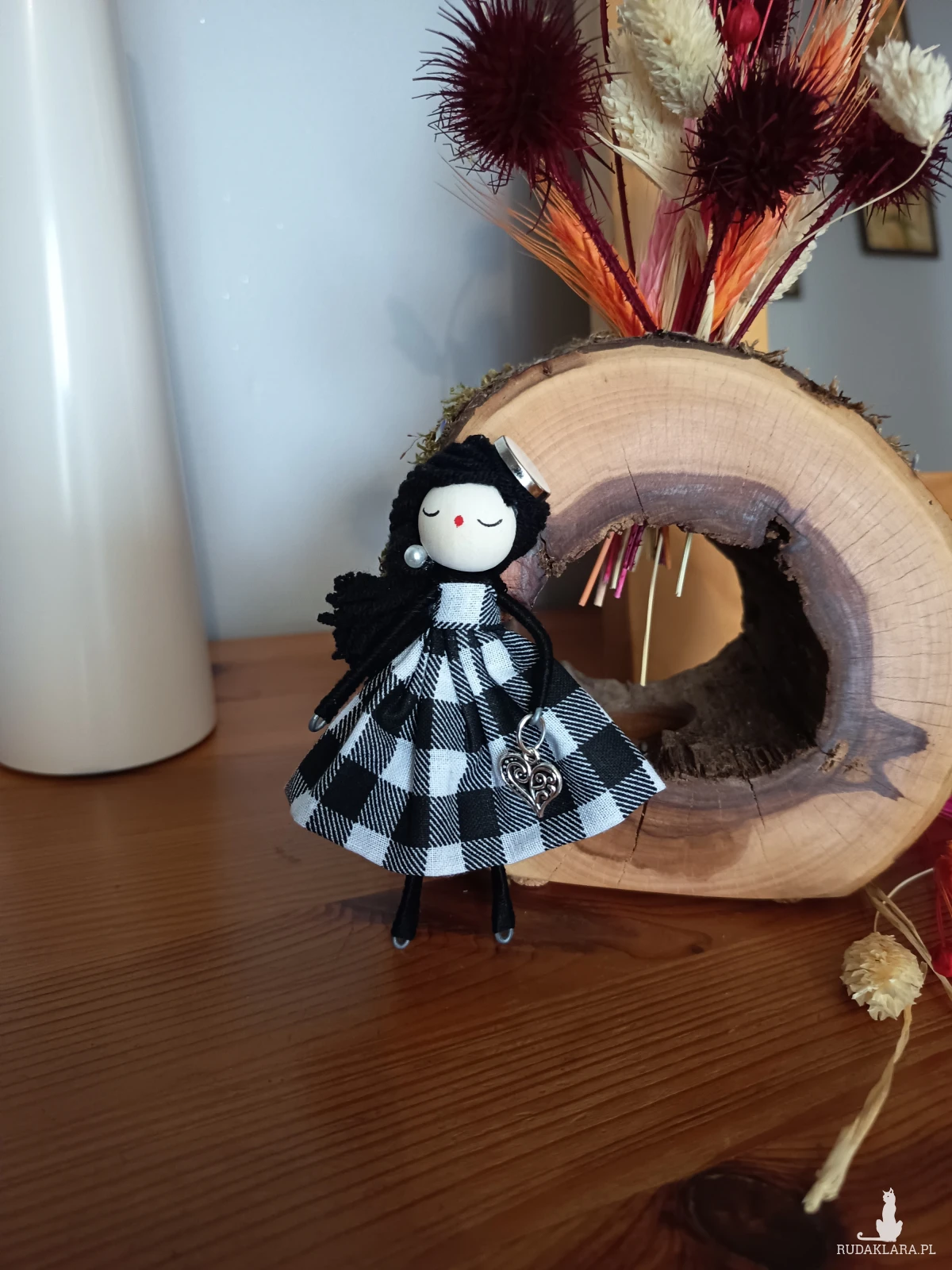 Ta unikalna broszka w kształcie mini laleczki przedstawia mini damę, wykonaną na bazie drutu i ozdobioną różnorodnymi tkaninami oraz dodatkami.