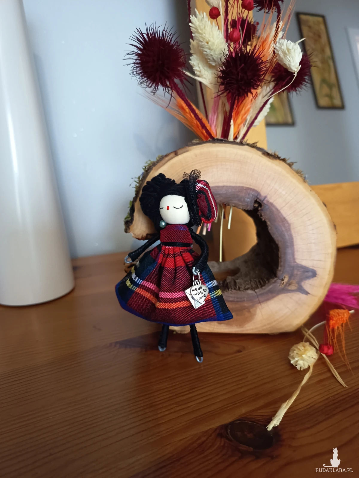 Ta unikalna broszka w kształcie mini laleczki przedstawia mini damę, wykonaną na bazie drutu i ozdobioną różnorodnymi tkaninami oraz dodatkami.