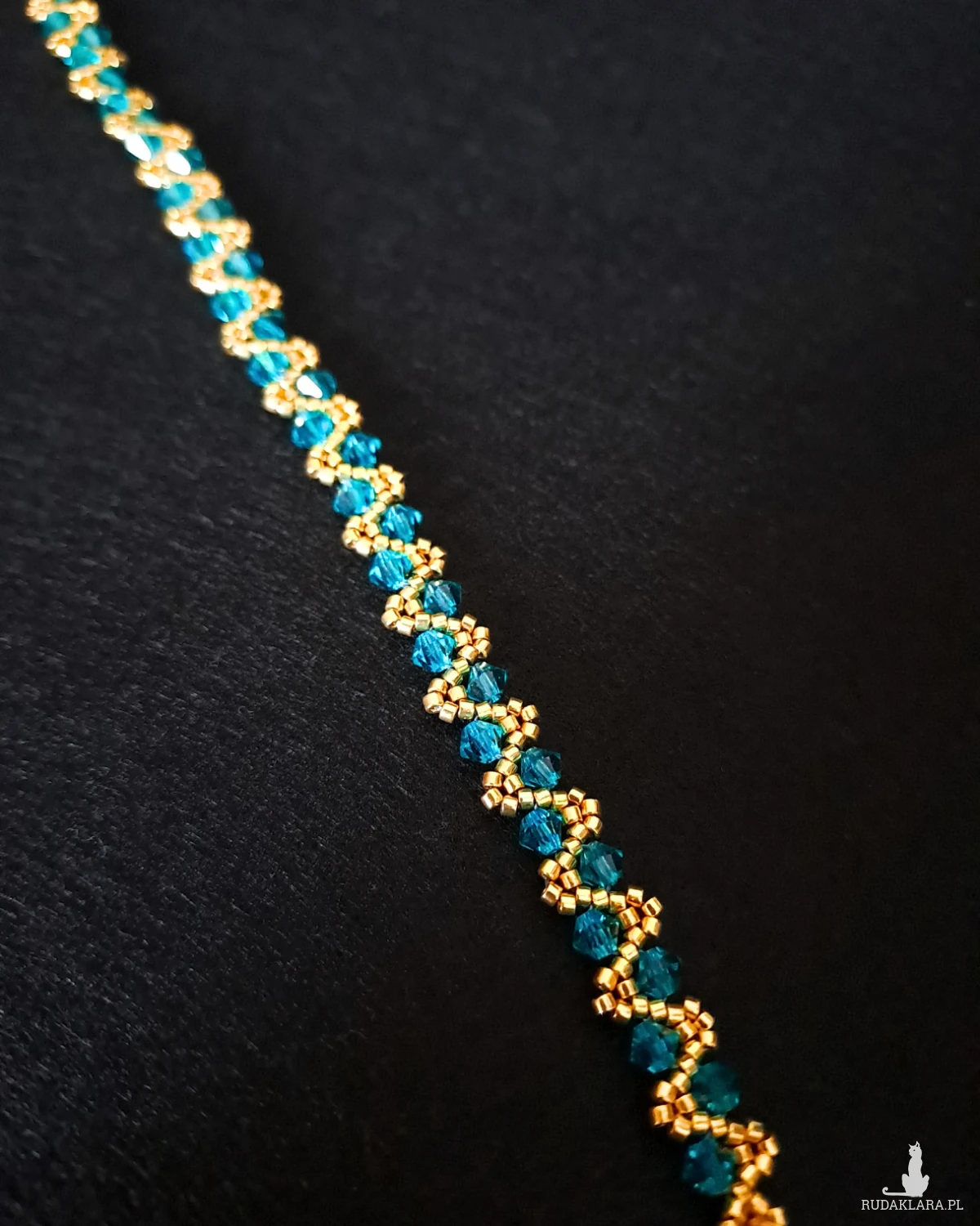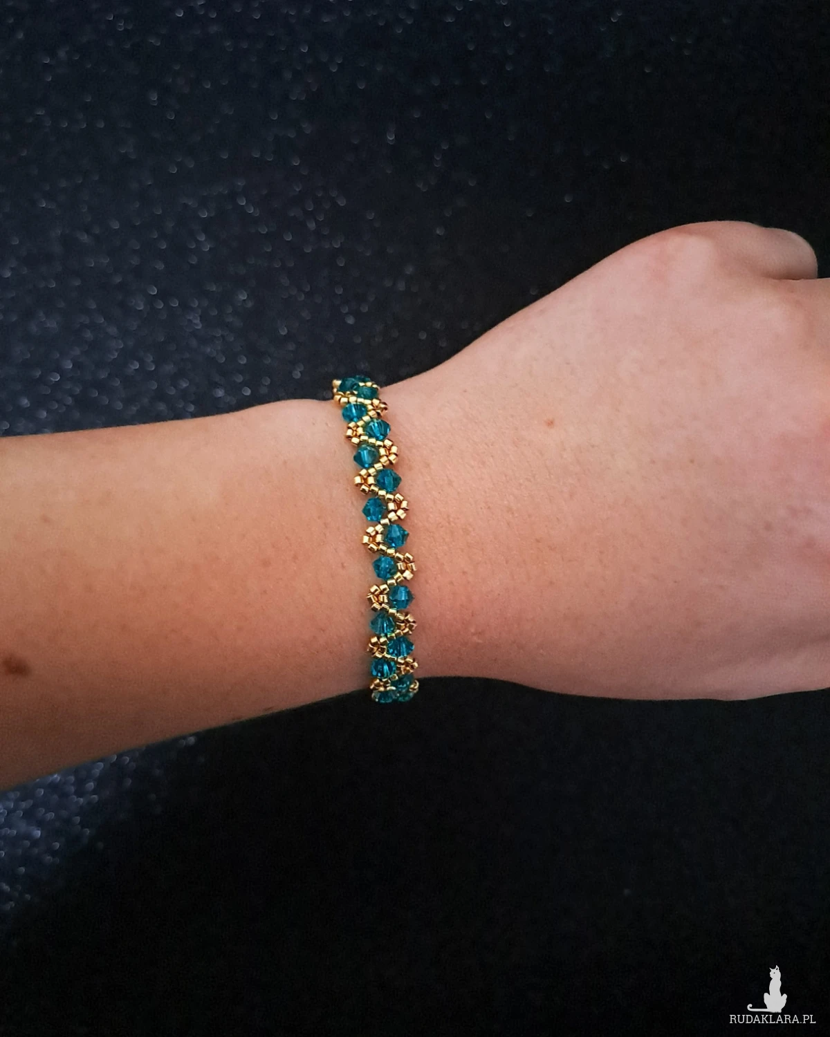 Bransoletka została wykonana ręcznie z kryształków Preciosa Bicone (4 mm) w odcieniu Blue Zircon – głębokim, lekko turkusowym błękicie o delikatnym połysku.