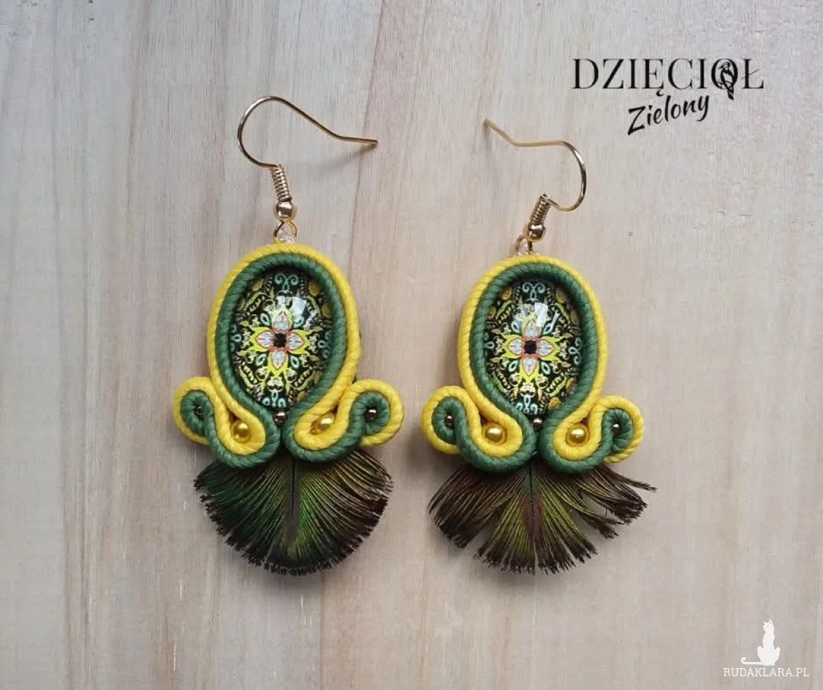 Żółto -zielone kolczyki sutasz z pawim piórkiem, bigle antyalergiczne.