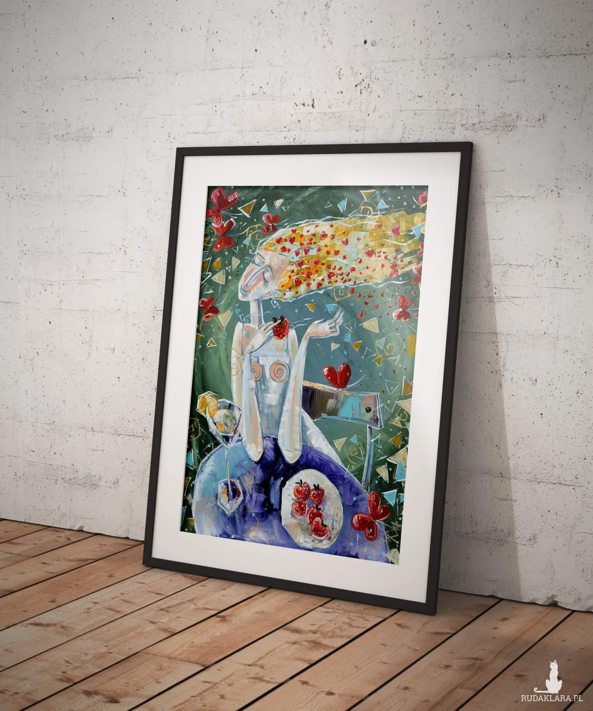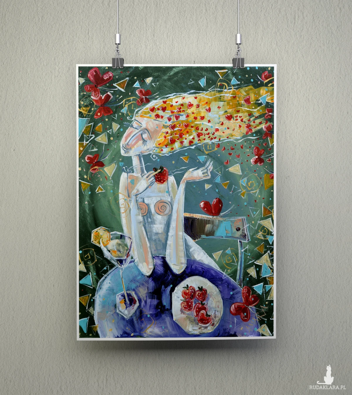 Reprodukcja pracy własnej, noszącej tytuł "Myśli kobiety", wykonana na wysokiej jakości papierze satynowanym o gramaturze 200-220 g/m². Do jej wyprodukowania użyta została technologia druku pigmentowego, która zapewnia doskonałe odwzorowanie kolorów oraz trwałość. Plakat sprzedawany jest bez obramowania, a jego rzeczywiste kolory mogą się nieznacznie różnić w zależności od ustawień monitora.