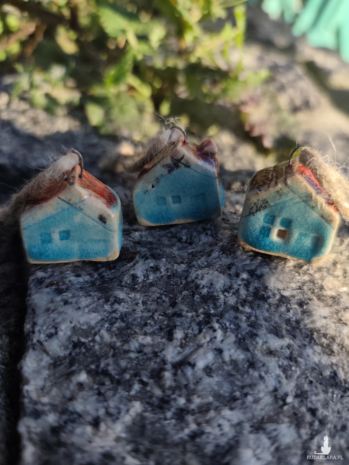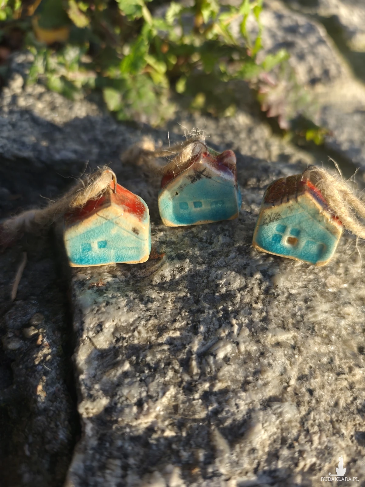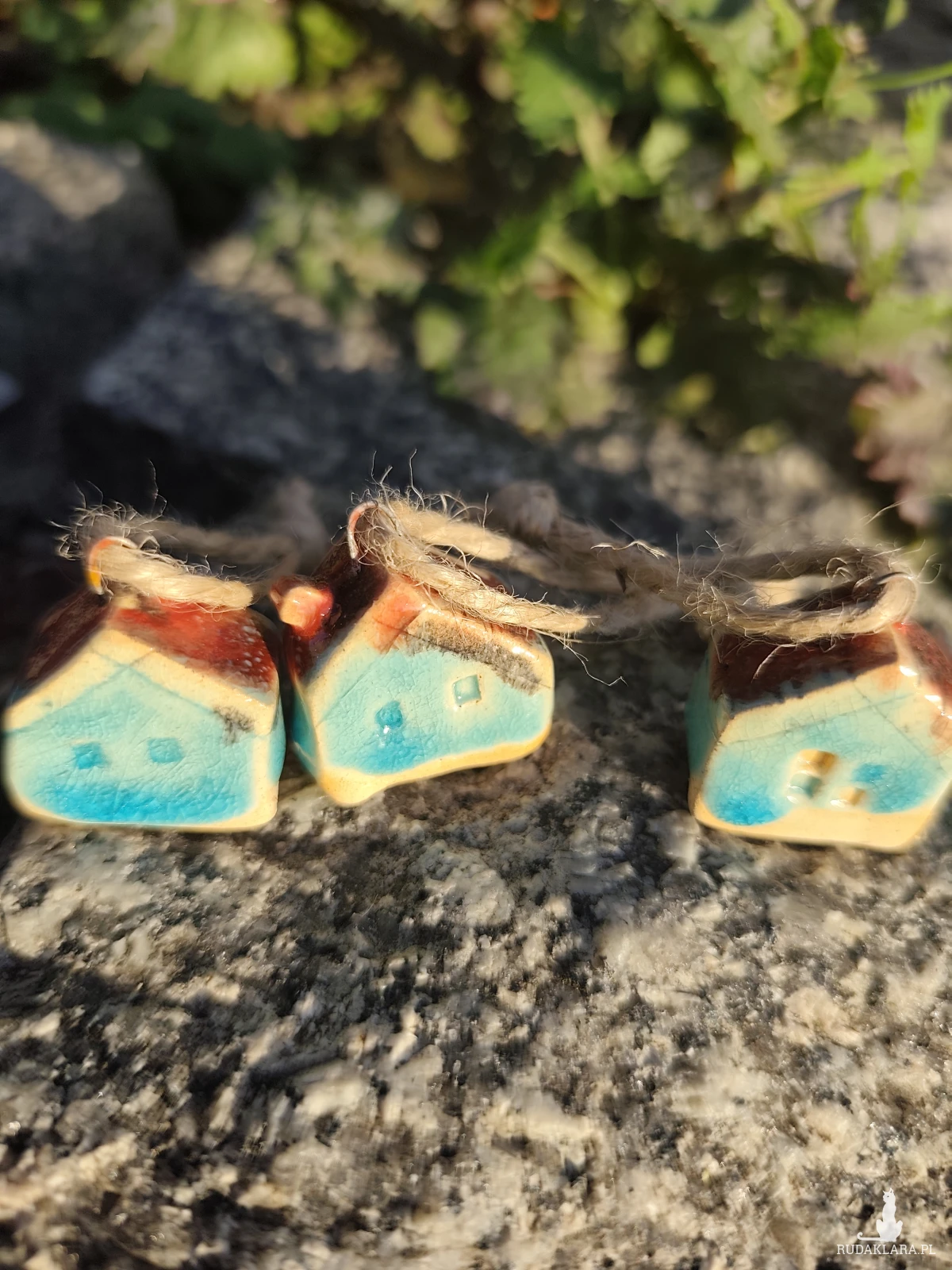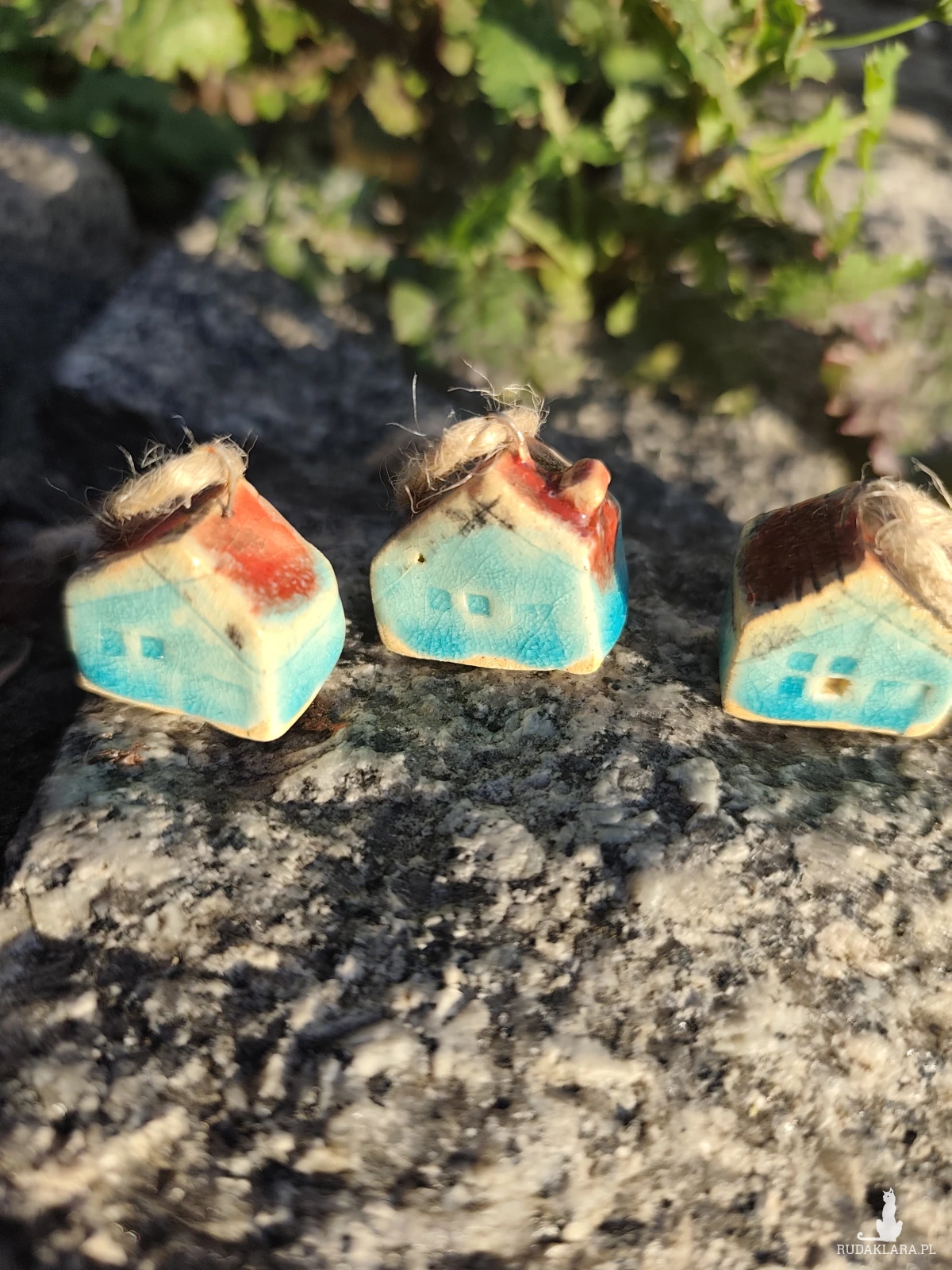 Domki ceramiczne mini 3 szt. z zawieszką, ręcznie wykonane, szkliwione i dwukrotnie wypalane w piecu ceramicznym na wysoką temperaturę. Piękna ozdoba na choinkę lub na prezent.