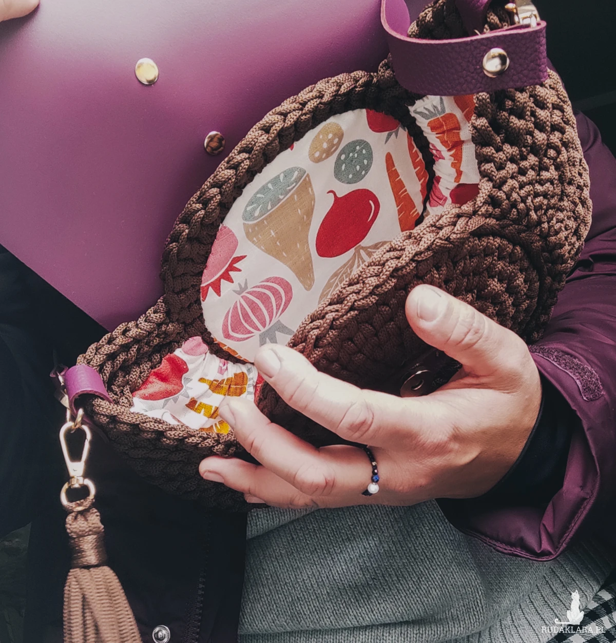 Torebka oreo maxi średnica ok 30 cm. Bardzo pojemna. Torebka z podszewką. Kolor mleczna czekolada plus naturalna skóra w kolorze śliwka (klapka, uchwyty,pasek).