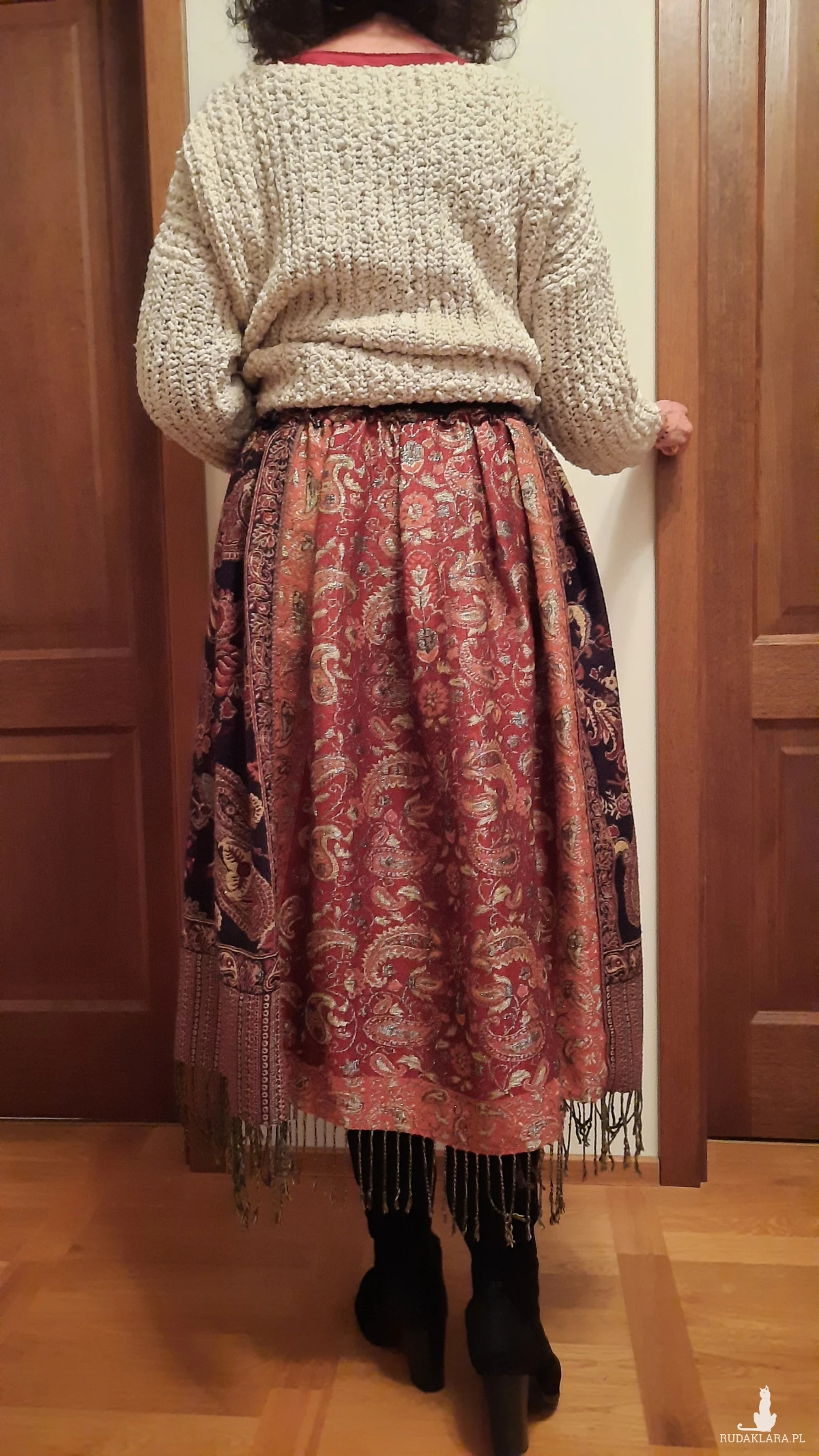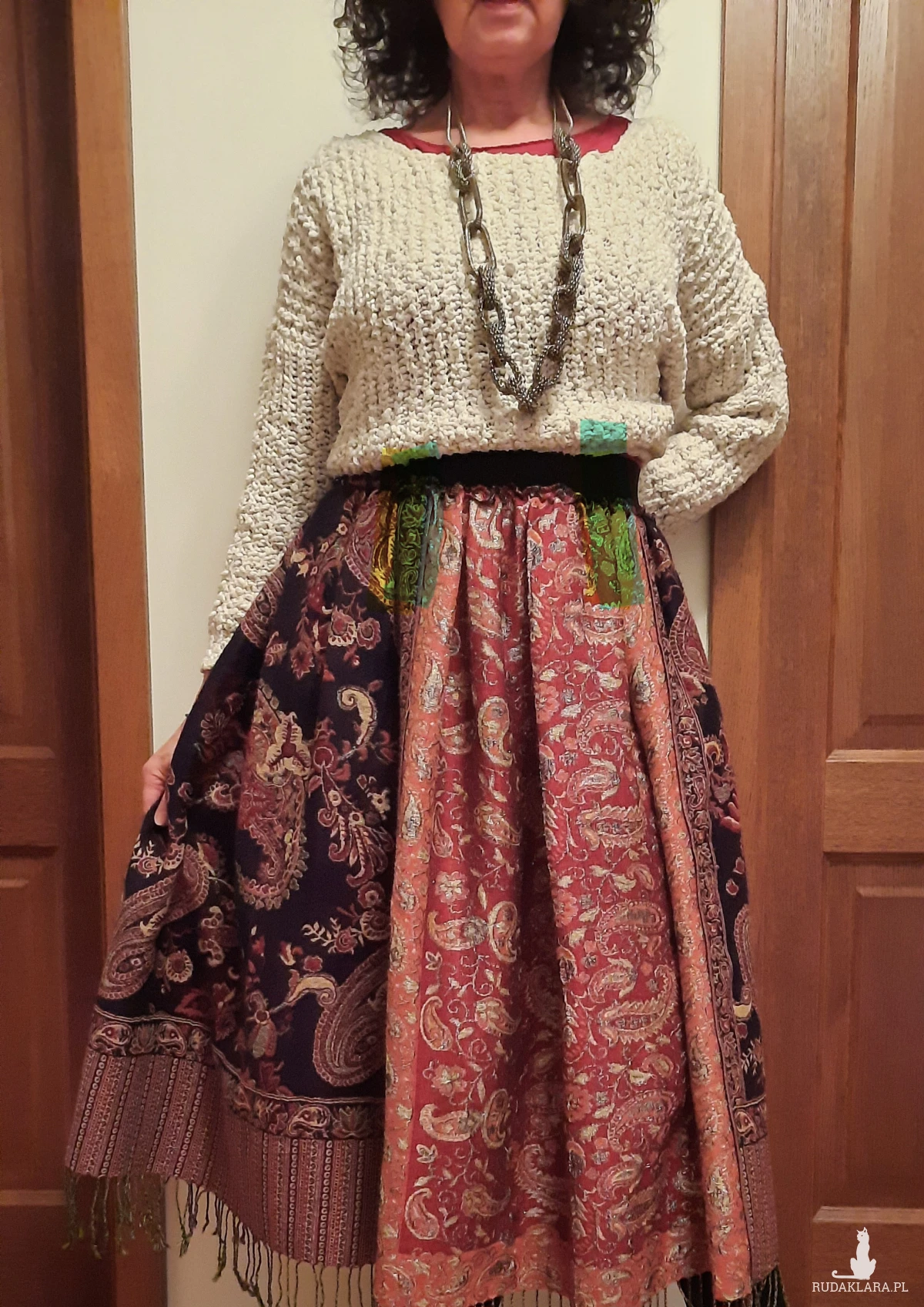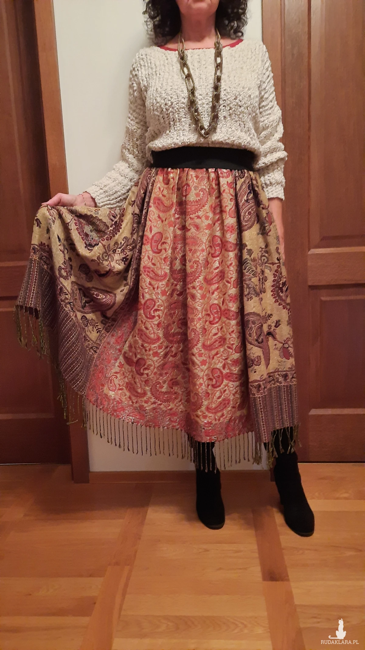 Sprzedam autorską spódnicę uszytą z dwóch cudownych szali ze złotą nitką i frędzlami. Spódnica jest DWUSTRONNA! . Jest na gumie ,guma 2x39, długość 86+5cm guma. Oryginał, jedyna, bardzo polecam! Zrób sobie prezent! Piękne kolory ! DAJĘ RZECZOM DRUGIE ŻYCIE!!!