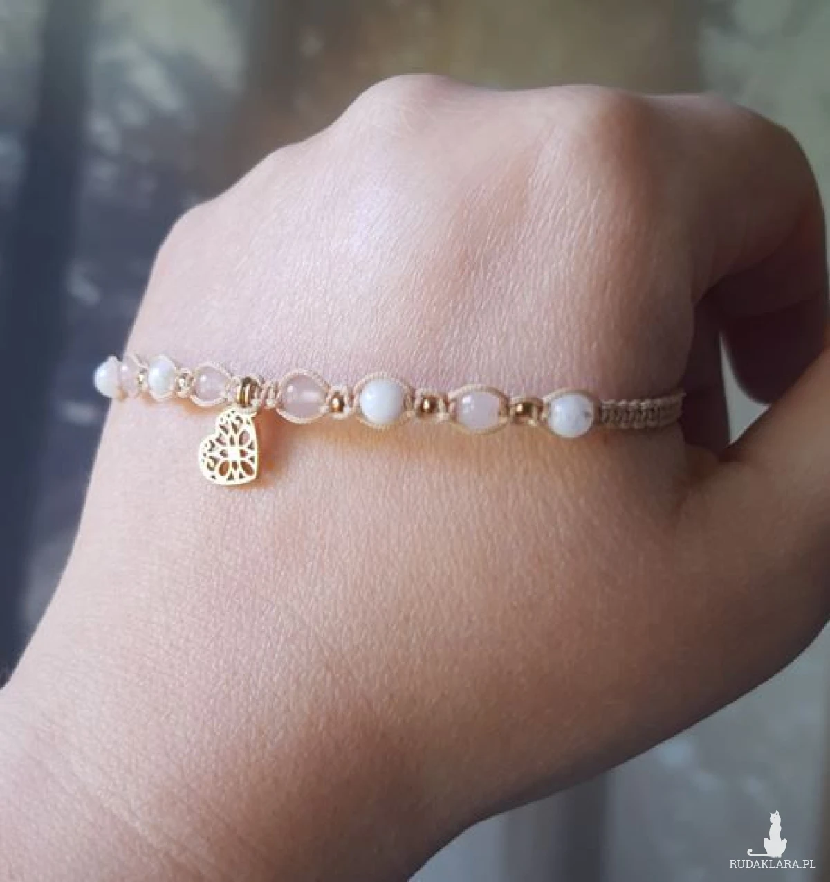 Ręcznie wykonana, na nylonowym sznurku w kolorze beżowym, oplecione koraliki z kamieni naturalnych i przekładki ze złotej stali szlachetnej. Serduszko ażurowe ze stali. Kamienie: kwarc różowy i kamień księżycowy o średnicy 4mm. Długość regulowana. W zestawie karta właściwości i opakowanie na prezent.