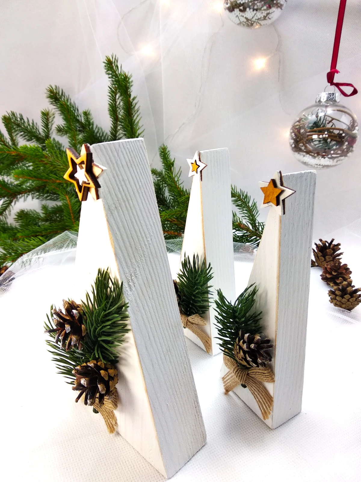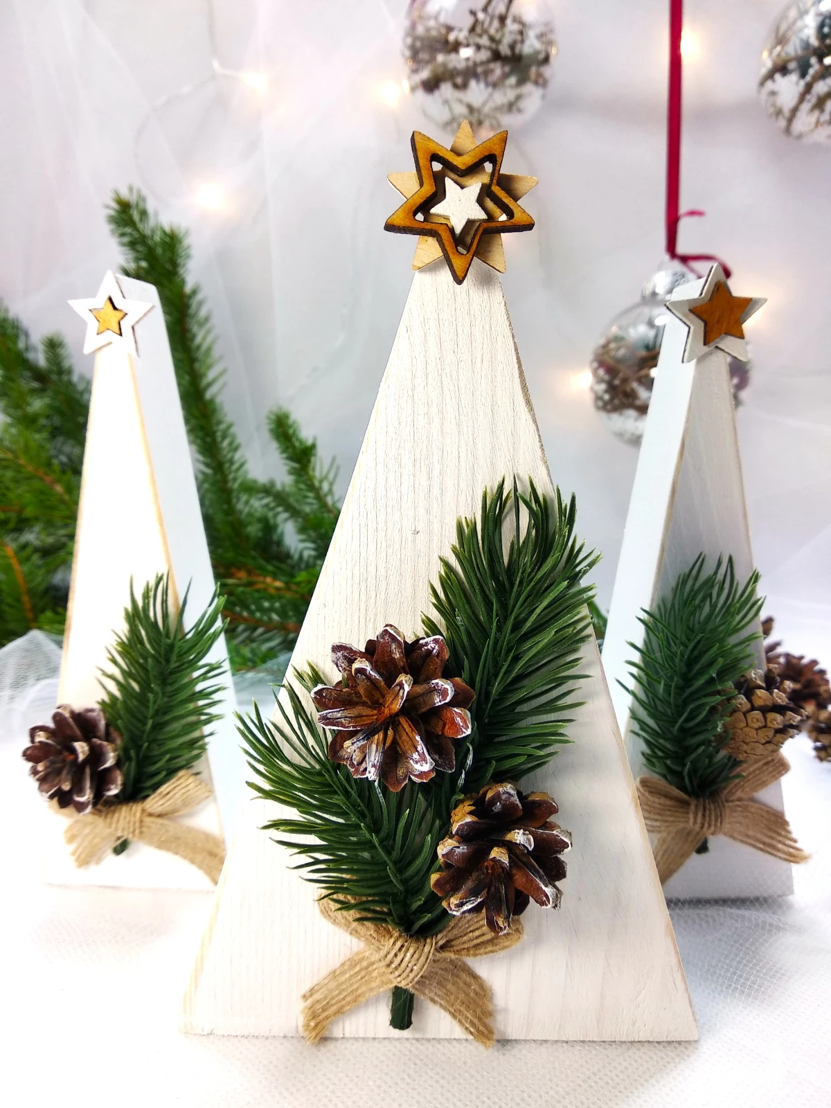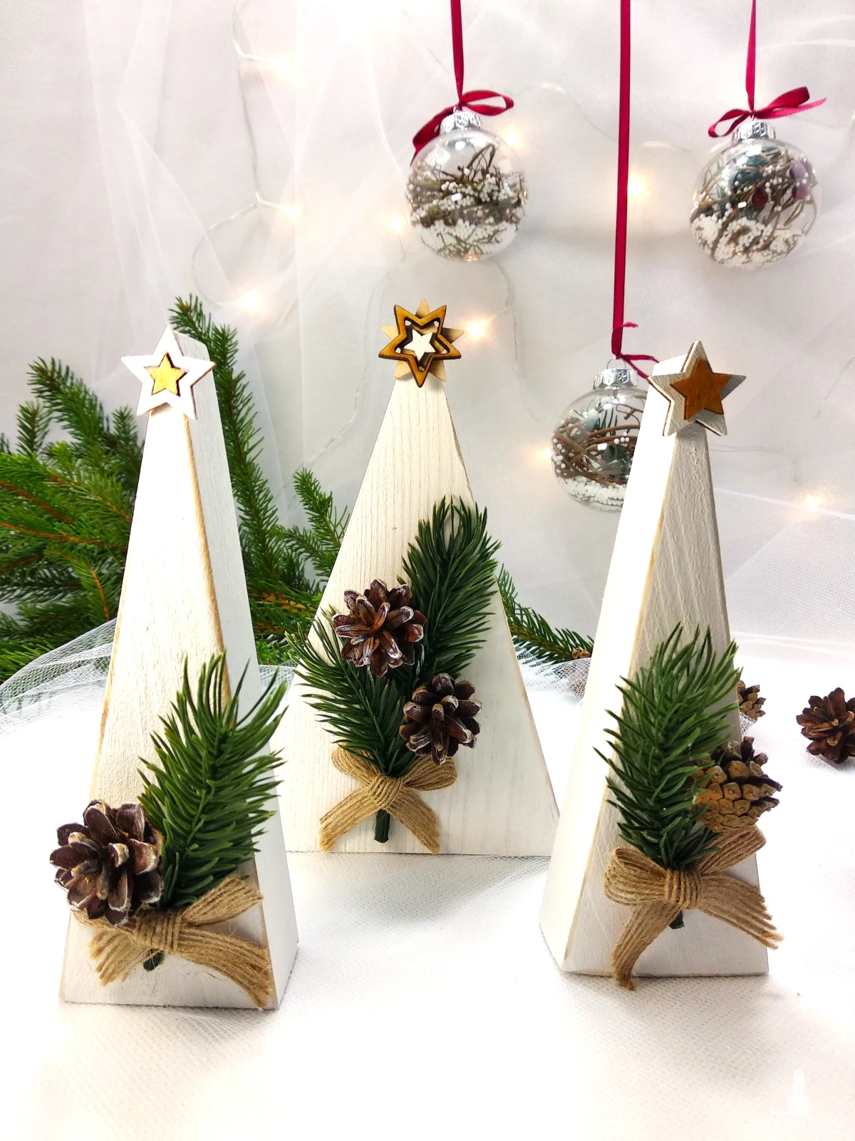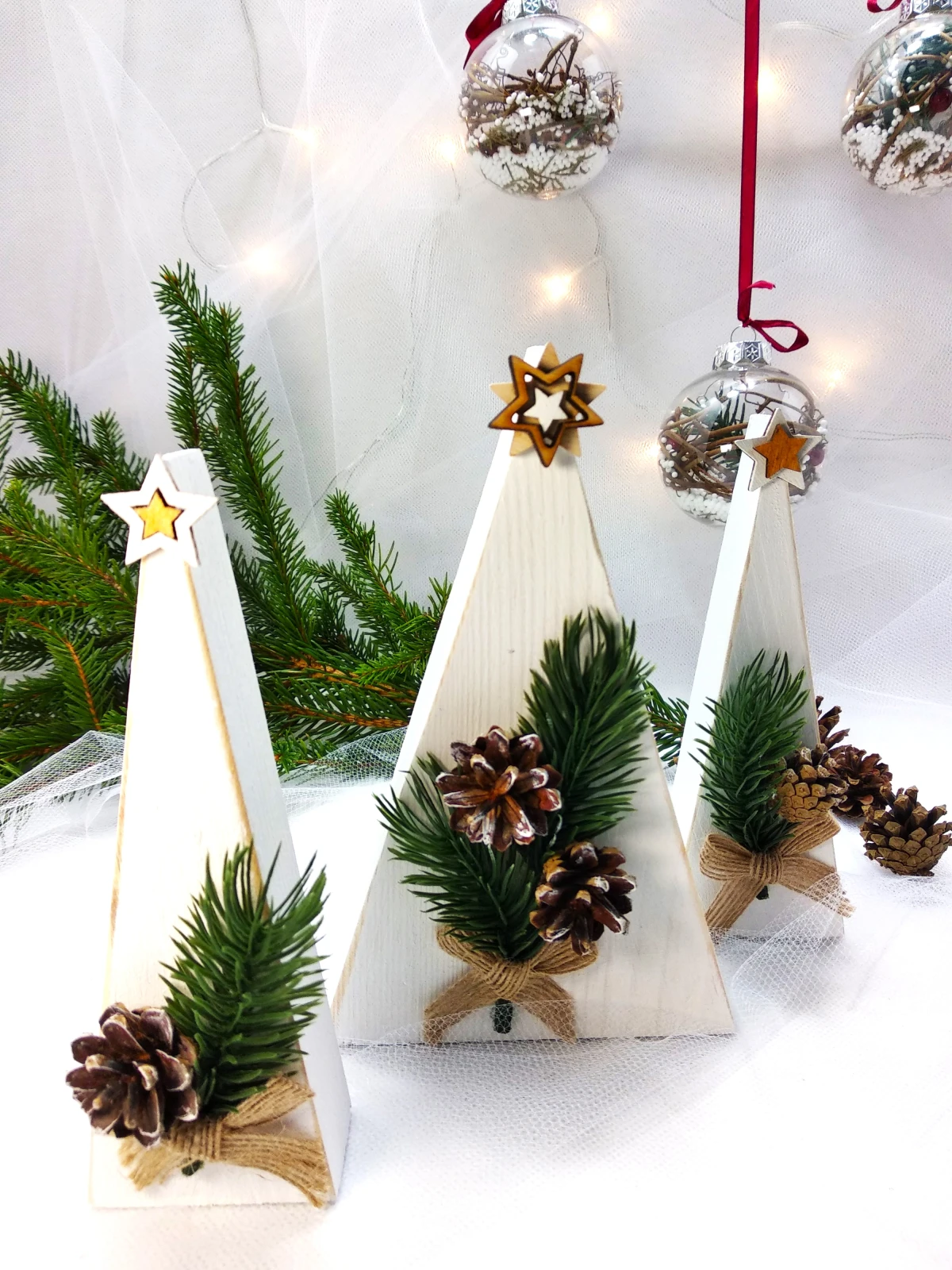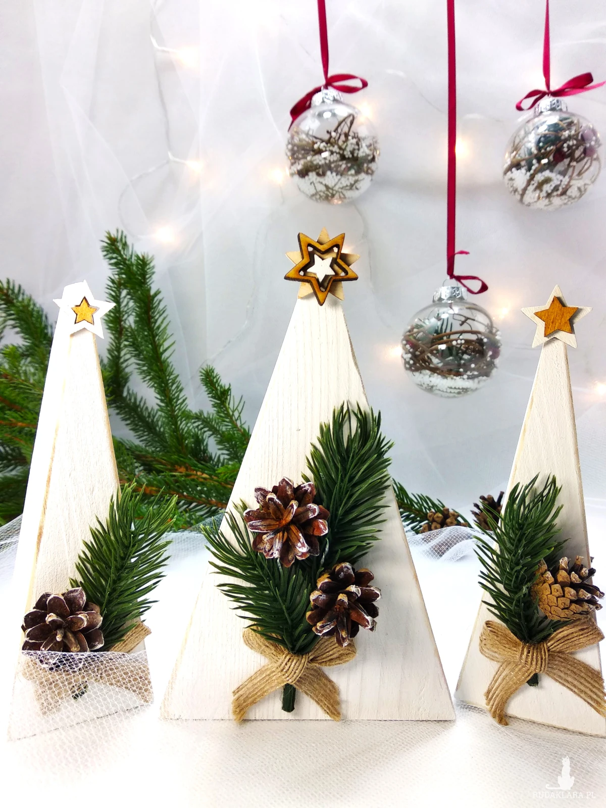 Minimalistyczne drewniane choinki to doskonały wybór dla osób, które cenią sobie prostotę i elegancję. Ich prosty design pozwala na łatwe wkomponowanie ich w każde wnętrze. Naturalne materiały, z których zostały wykonane, dodają im ciepła i przytulności. To doskonała propozycja dla osób, które chcą stworzyć w swoim domu wyjątkową atmosferę świąteczną. Drewno i szyszki nadają choinkom rustykalnego charakteru i sprawiają, że są przyjazne dla środowiska. Biel i brąz i zieleń to klasyczna kolorystyka tworzy harmonijną kompozycję a jutowe wstążki subtelnie podkreślają naturalny charakter dekoracji i dodają im elegancji.