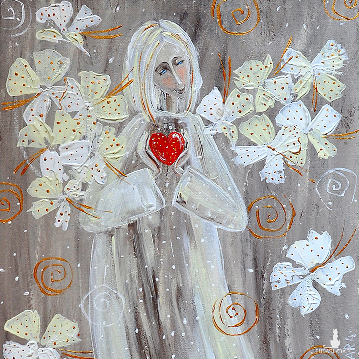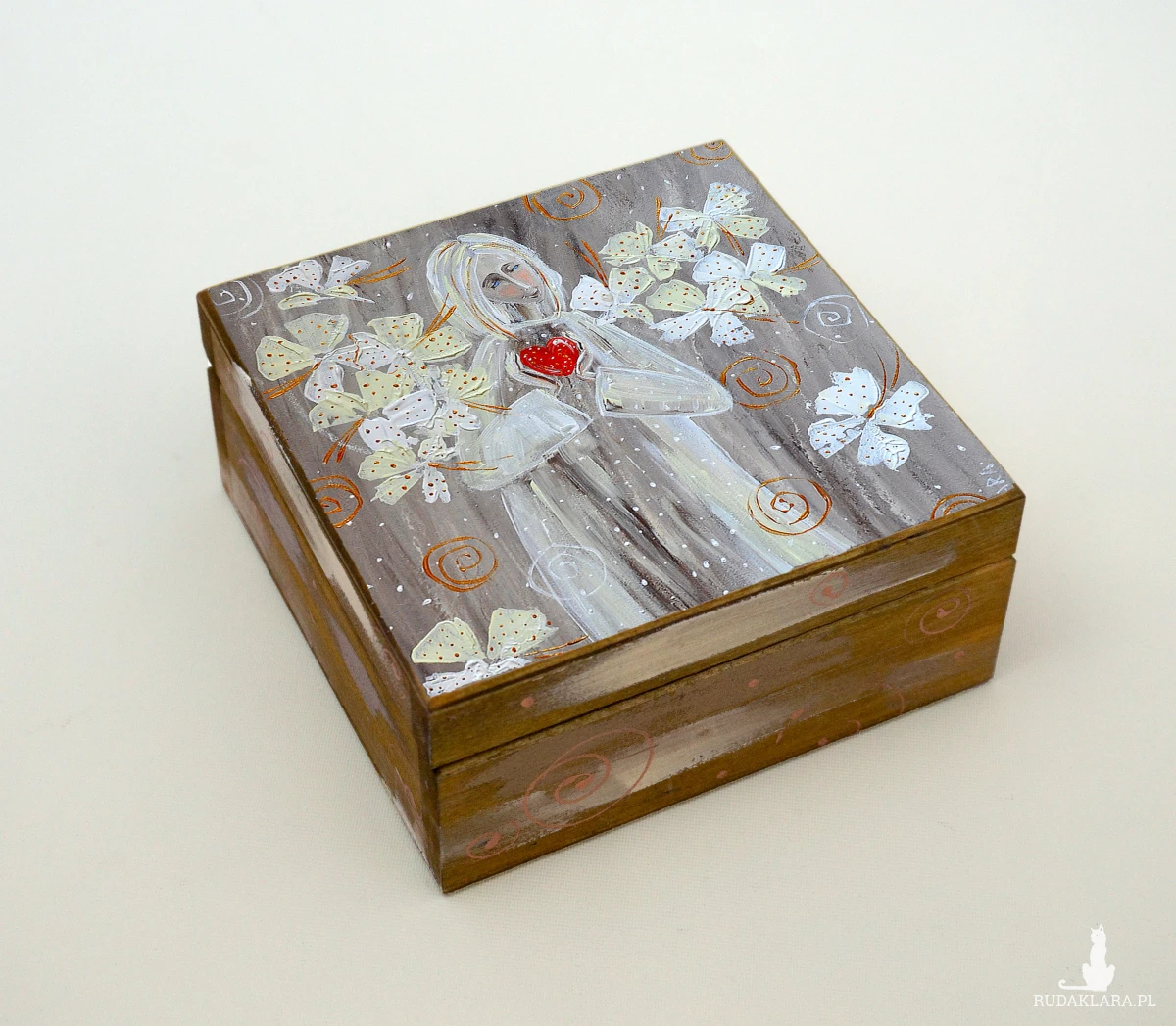 Drewniane pudełko na różności z reprodukcją obrazu autorskiego zatytułowanego "Z całego serca". Obraz umieszczony jest metodą decoupage na wierzchniej części szkatułki, jej boki natomiast malowane są ręcznie. Całość zabezpieczona została bezbarwnym lakierem.