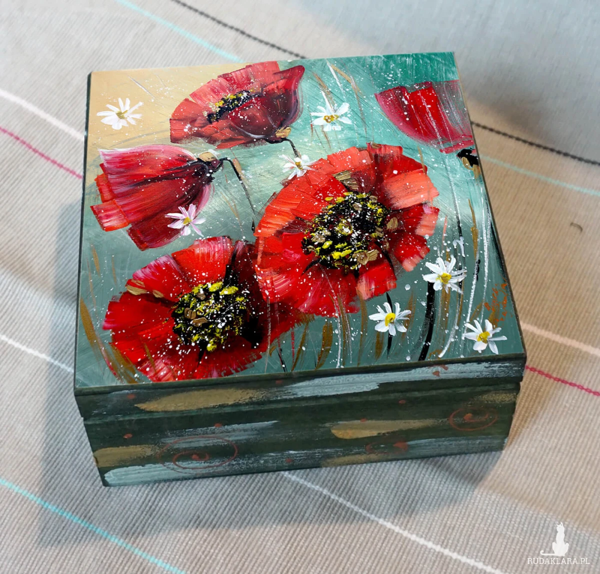 Drewniana, dekoracyjna szkatułka, idealna do przechowywania biżuterii, bądź też innych różności. Na wierzchniej części szkatułki metodą decoupage umieszczona została reprodukcja obrazu własnego autorstwa, zatytułowanego "Maki". Boki szkatułki malowane są ręcznie, a całość zabezpieczona została bezbarwnym lakierem.