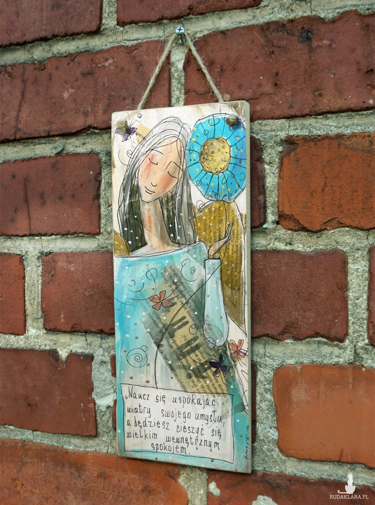 Reprodukcja autorskiej pracy, umieszczona na płycie MDF o grubości 6 mm, z zawieszką w postaci ekologicznego sznurka.