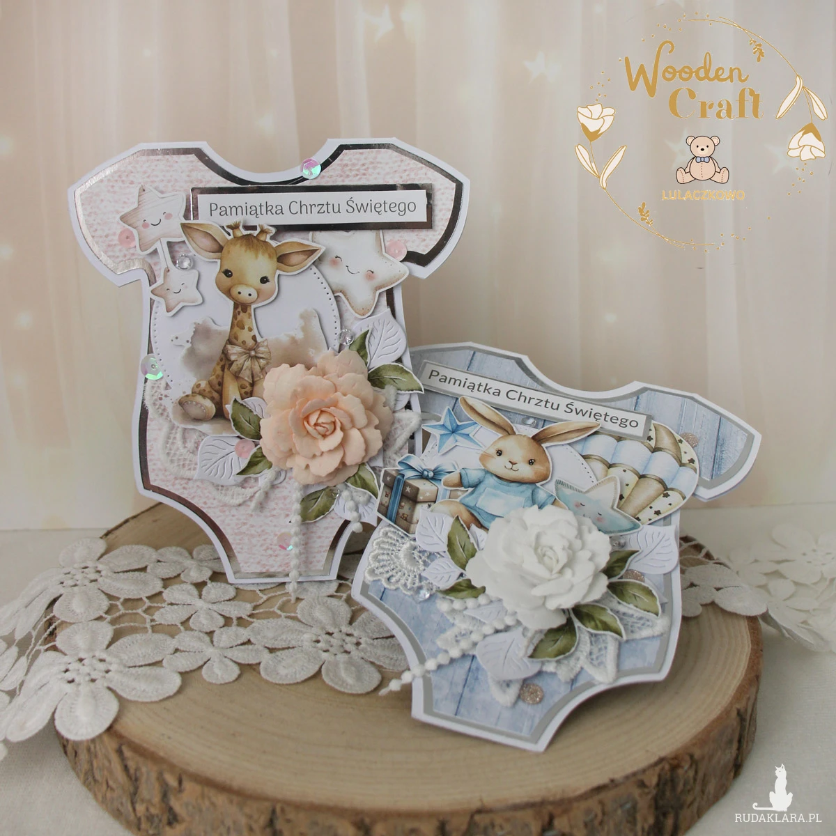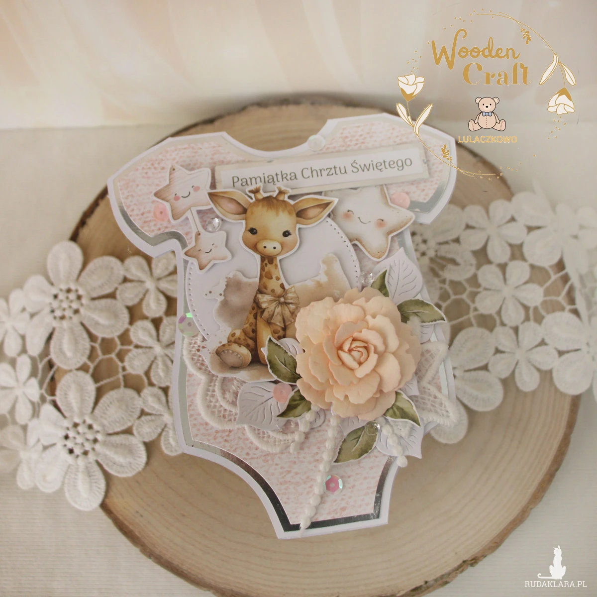 Urocza i nietuzinkowa kartka z okazji Chrztu Świętego, w kształcie dziecięcego body, wykonana z mixu dziecięcych kolekcji papierów, utrzymana w odcieniach bieli, beżu i delikatnego, pudrowego różu, z dodatkiem błyszczących, srebrnych akcentów. Kartka wykonana ręcznie z dbałością o każdy szczegół. Na środku znajduje się grafika słodkiej żyrafki, ozdobiona kompozycją kwiatową z ręcznie robioną różyczką, dodatkowo zdobiona grafikami gwiazdki, balonika i prezentu, kryształkami oraz połyskującymi cekinami, a także napisem "Pamiątka Chrztu Świętego" (na życzenie mogę dodać również imię dziecka, bądź całkowicie zmienić napis na dowolny - w zależności od okazji).