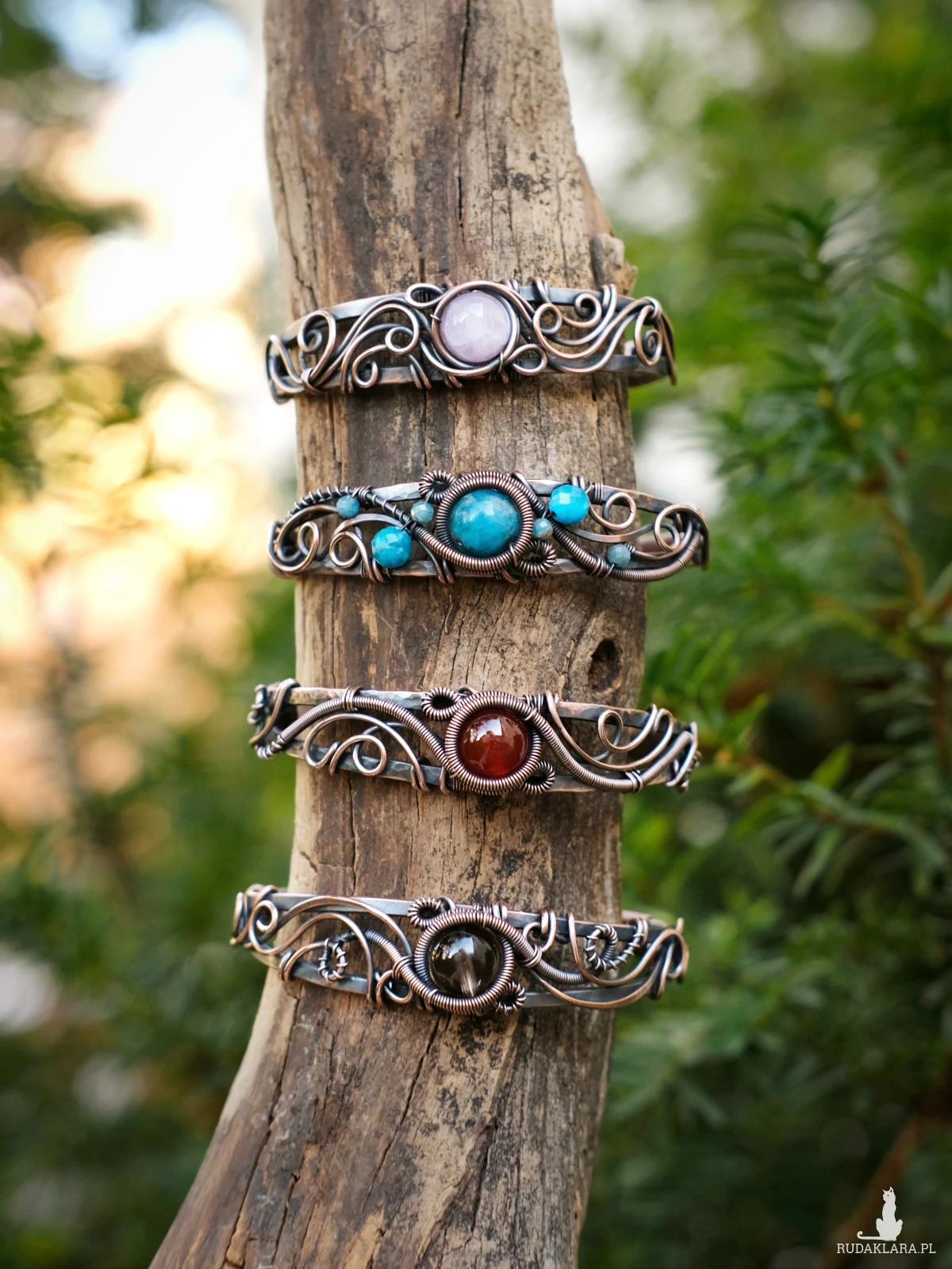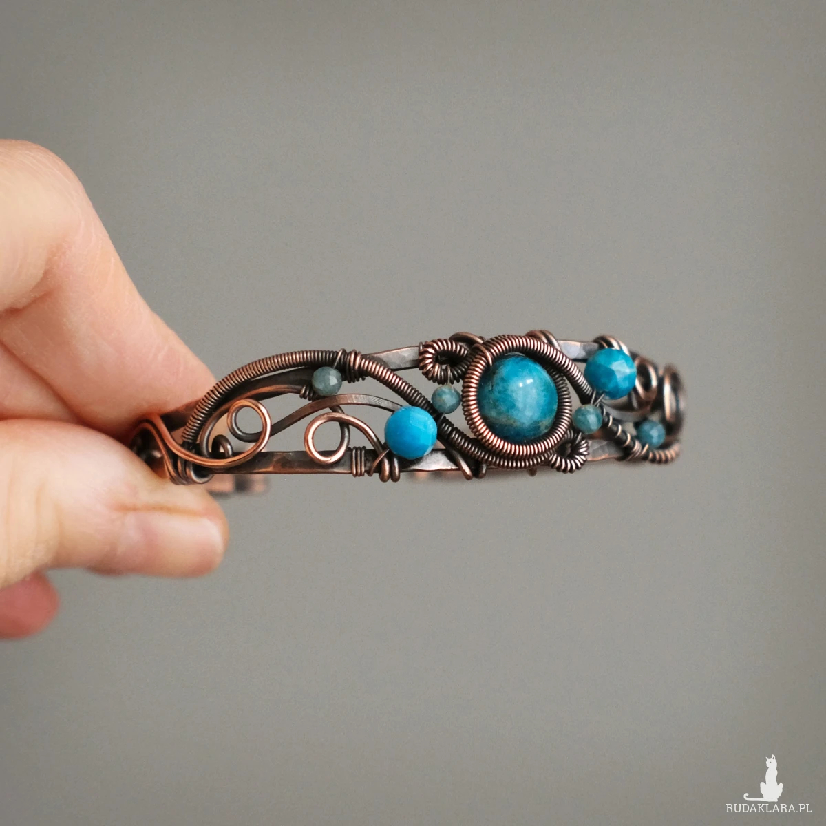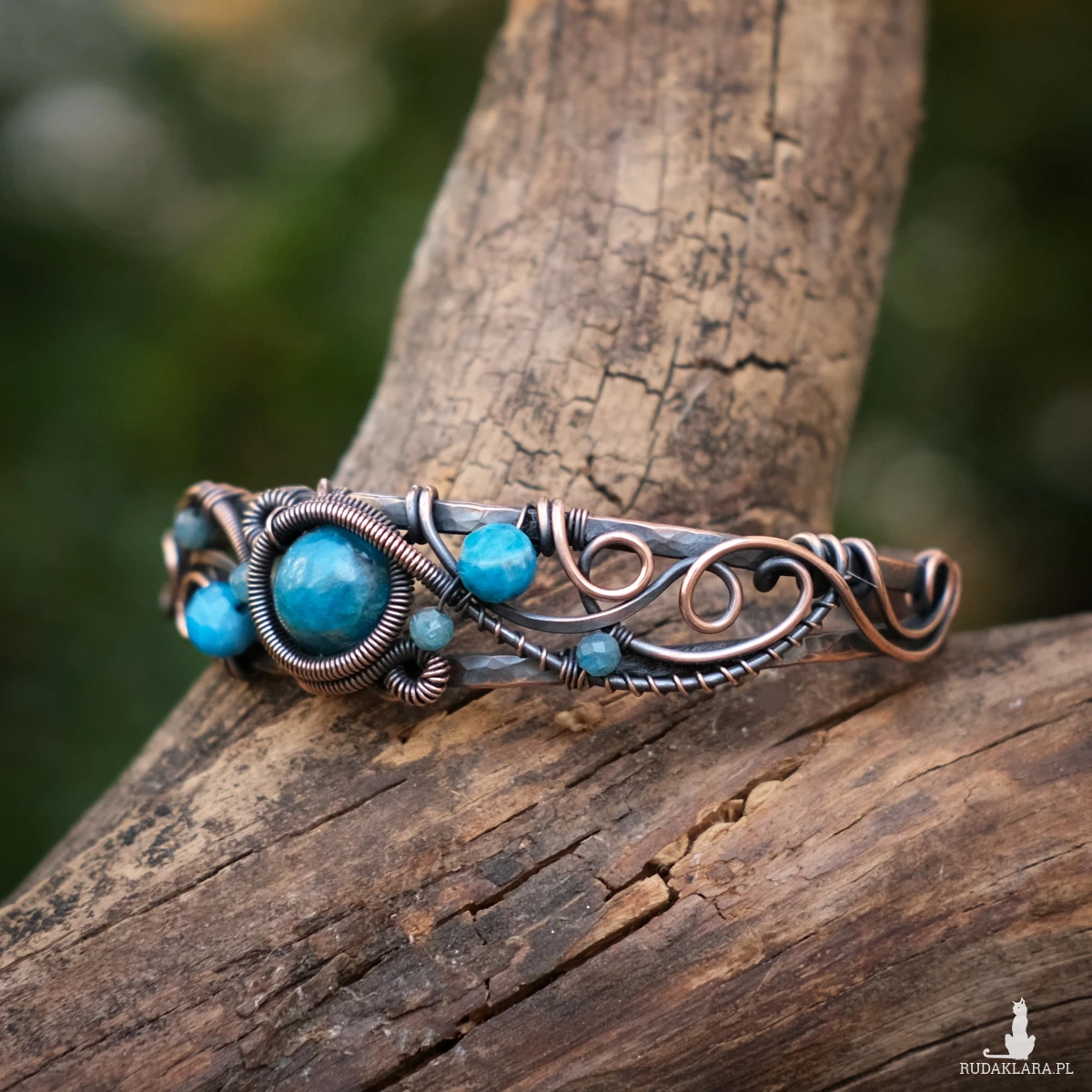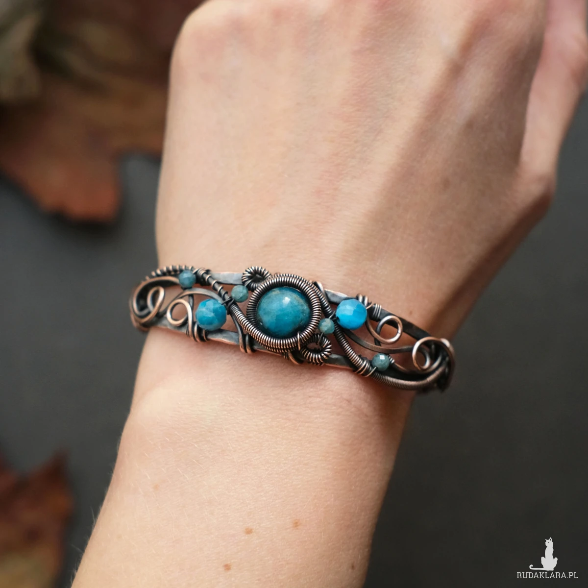 Miedziana bransoletka w elfickim stylu mieści w sobie kamienie apatytu. Oplatają ją sploty miedzianego drutu nadające baśniowego klimatu.