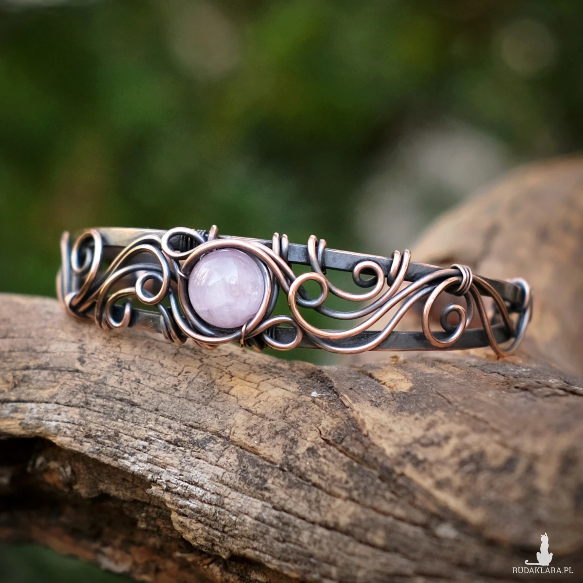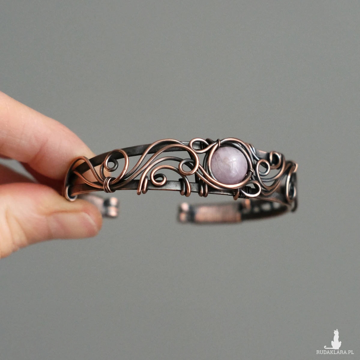 Miedziana bransoletka w elfickim stylu mieści w sobie kamień kunzytu. Oplatają ją sploty miedzianego drutu nadające baśniowego klimatu.