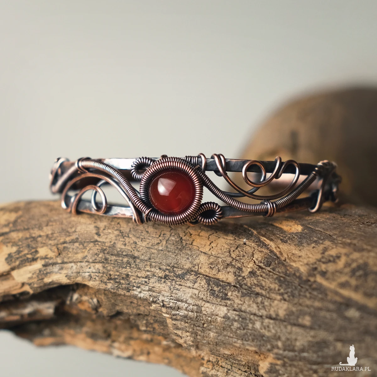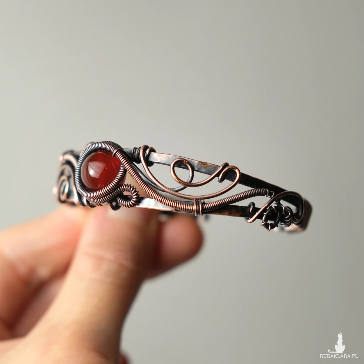Miedziana bransoletka w elfickim stylu mieści w sobie kamień karneolu. Oplatają ją sploty miedzianego drutu nadające baśniowego klimatu.