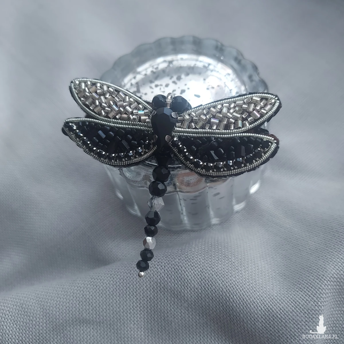 Broszka ważka w kolorze czarno-srebrnym - szaleństwo piękna i elegancji. Broszka wyszywana haftem koralikowym.