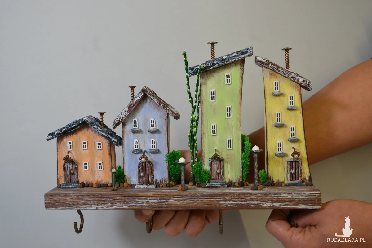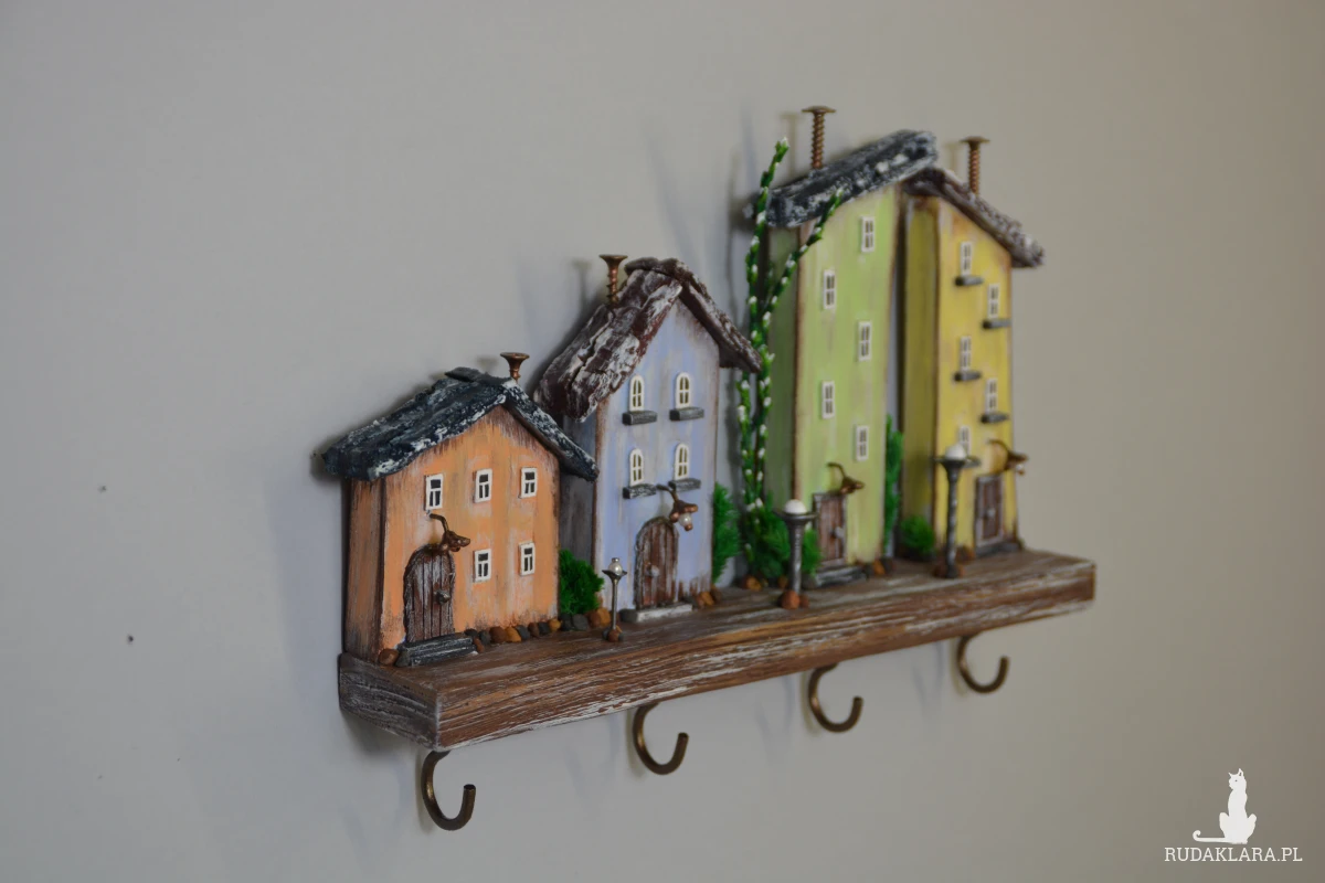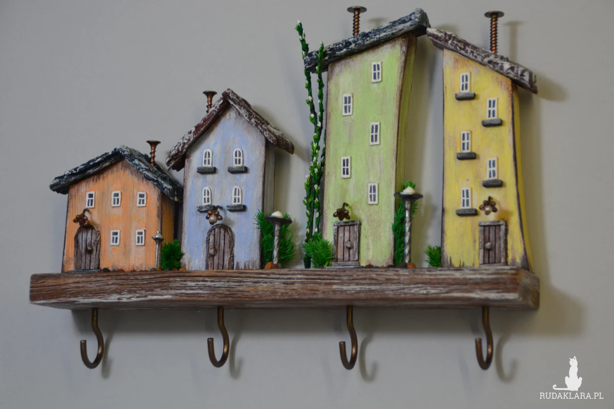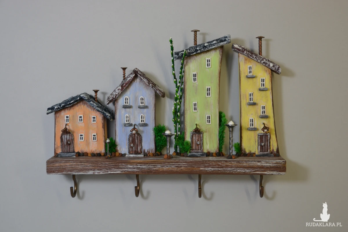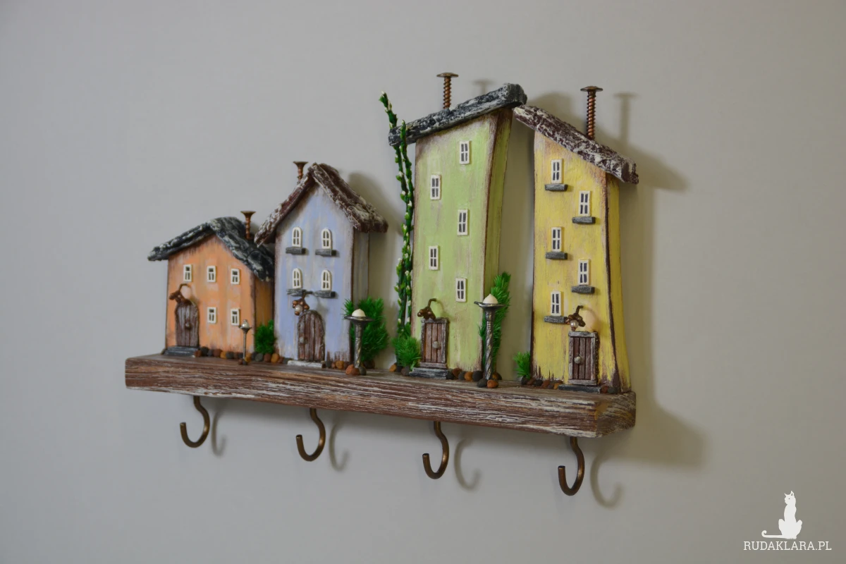 Uroczy, ręcznie wykonany drewniany wieszak na klucze w formie kolorowych domków. Każdy domek został starannie wyrzeźbiony i pomalowany, dzięki czemu całość tworzy wyjątkową dekorację ścienną w stylu rustykalnym i bajkowym.