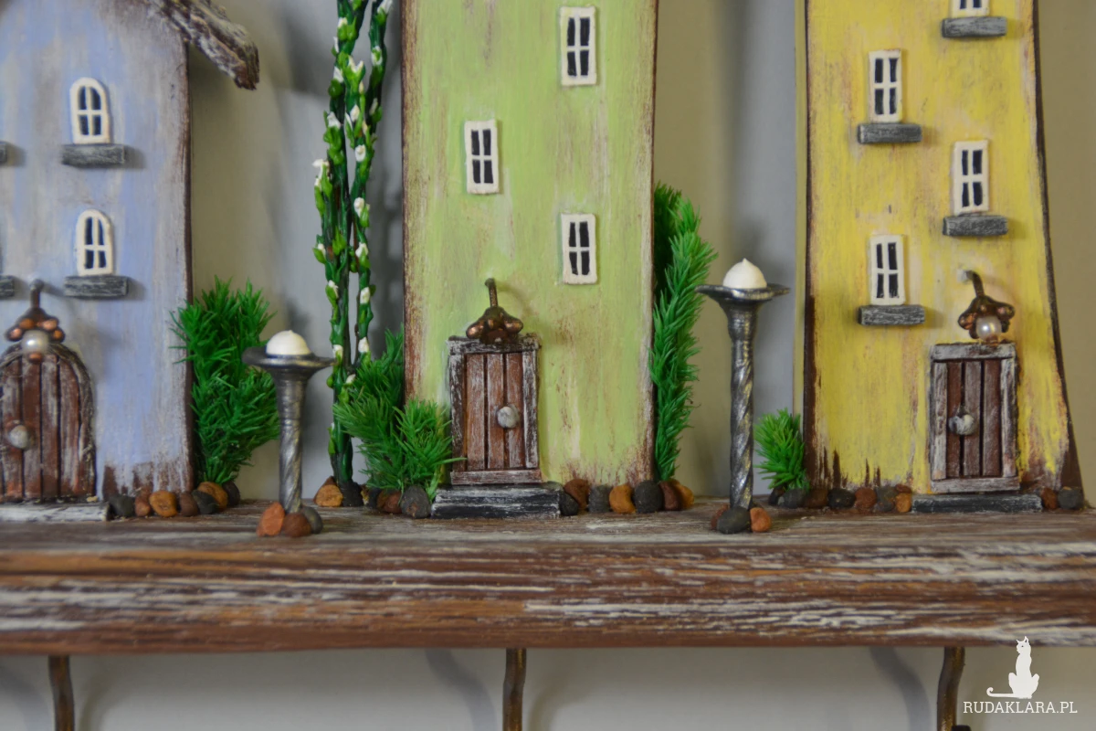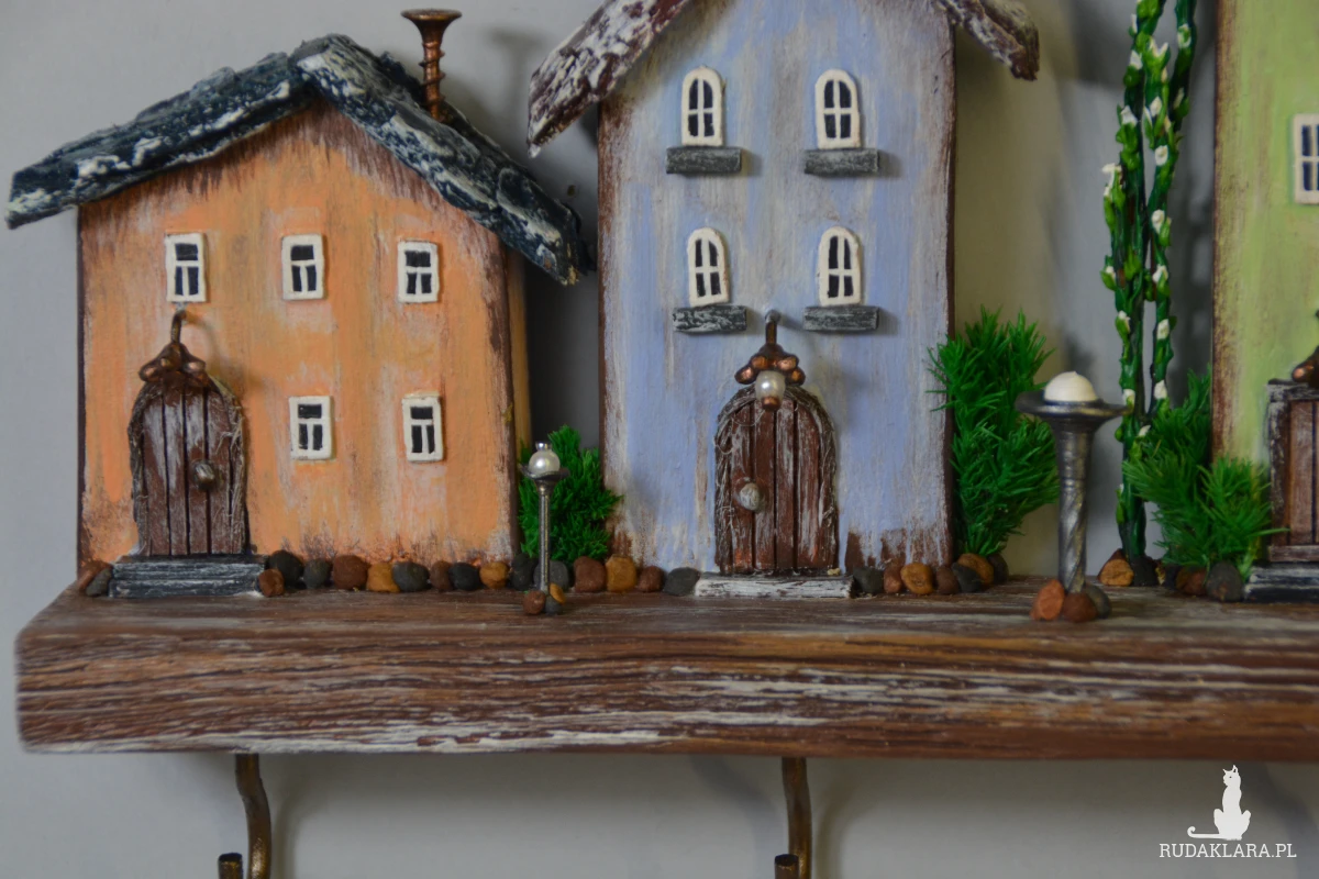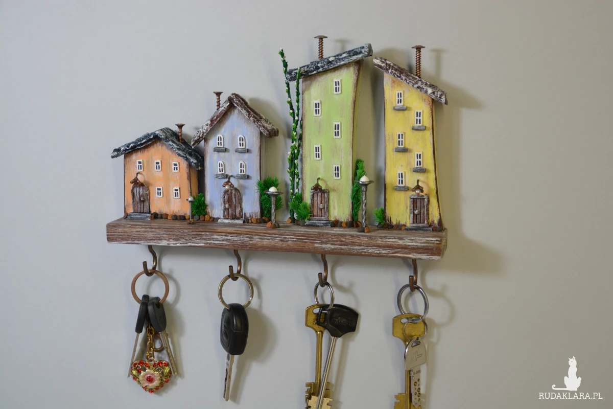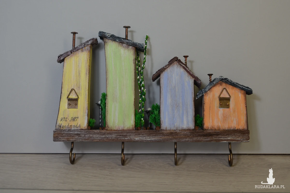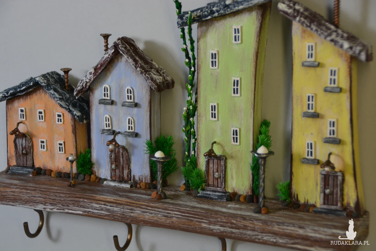 Uroczy, ręcznie wykonany drewniany wieszak na klucze w formie kolorowych domków. Każdy domek został starannie wyrzeźbiony i pomalowany, dzięki czemu całość tworzy wyjątkową dekorację ścienną w stylu rustykalnym i bajkowym.
