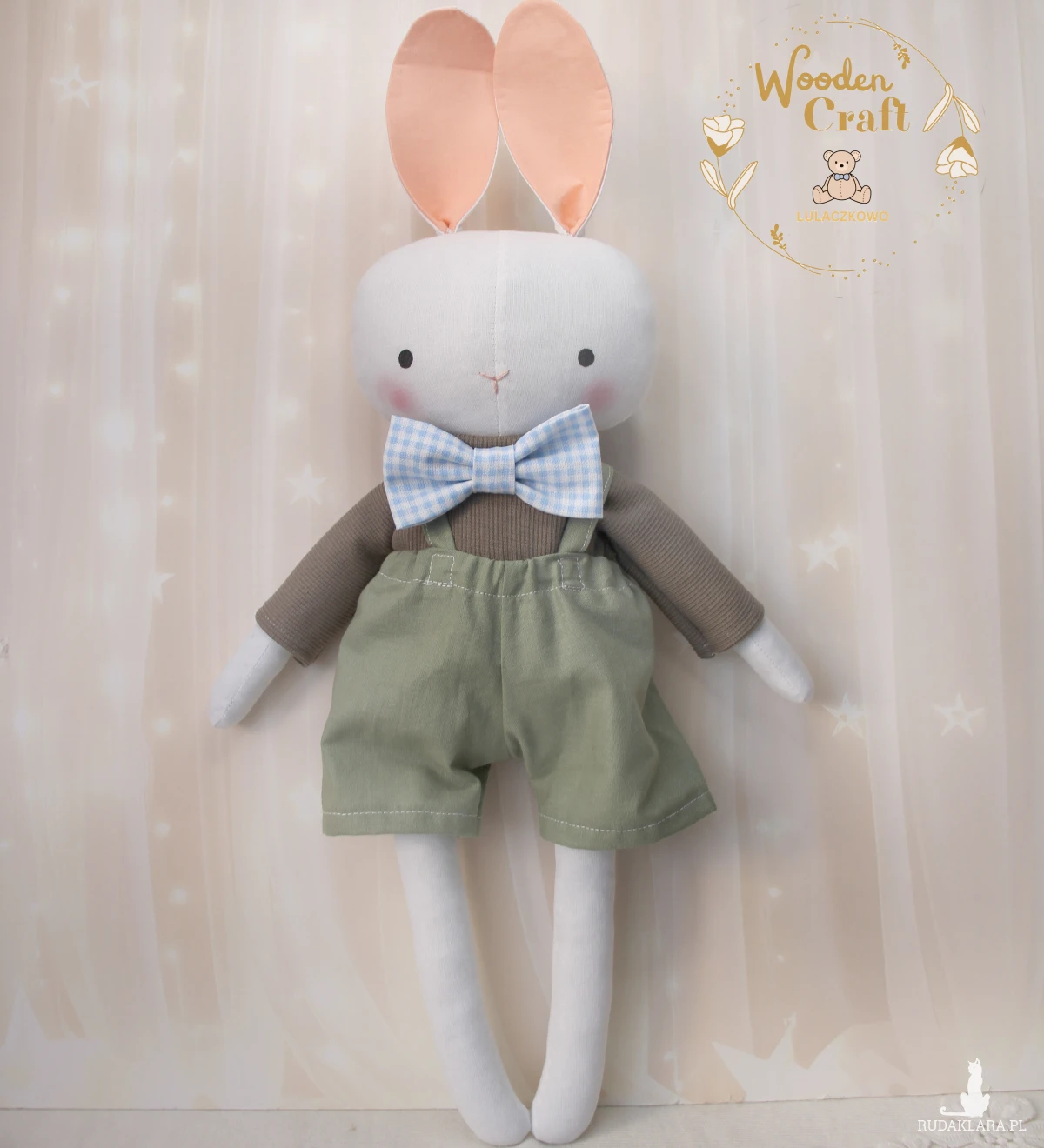 Przeurocza przytulanka, króliczek cały w bieli, uszyty ręcznie z najwyższą starannością, ubrany w brązowy sweterek, oliwkowozielone spodenki oraz błękitną muszkę w kratkę. Wykonany ze 100% bawełny, wypełniony antyalergiczną kulką silikonową. Oczka malowane wodoodpornym markerem, nosek wyszyty muliną. Spodenki, sweterek i kokardę można swobodnie zdejmować, posiadają gumeczki. Górne i dolne łapki układają się luźno, króliś siedzi z podparciem.