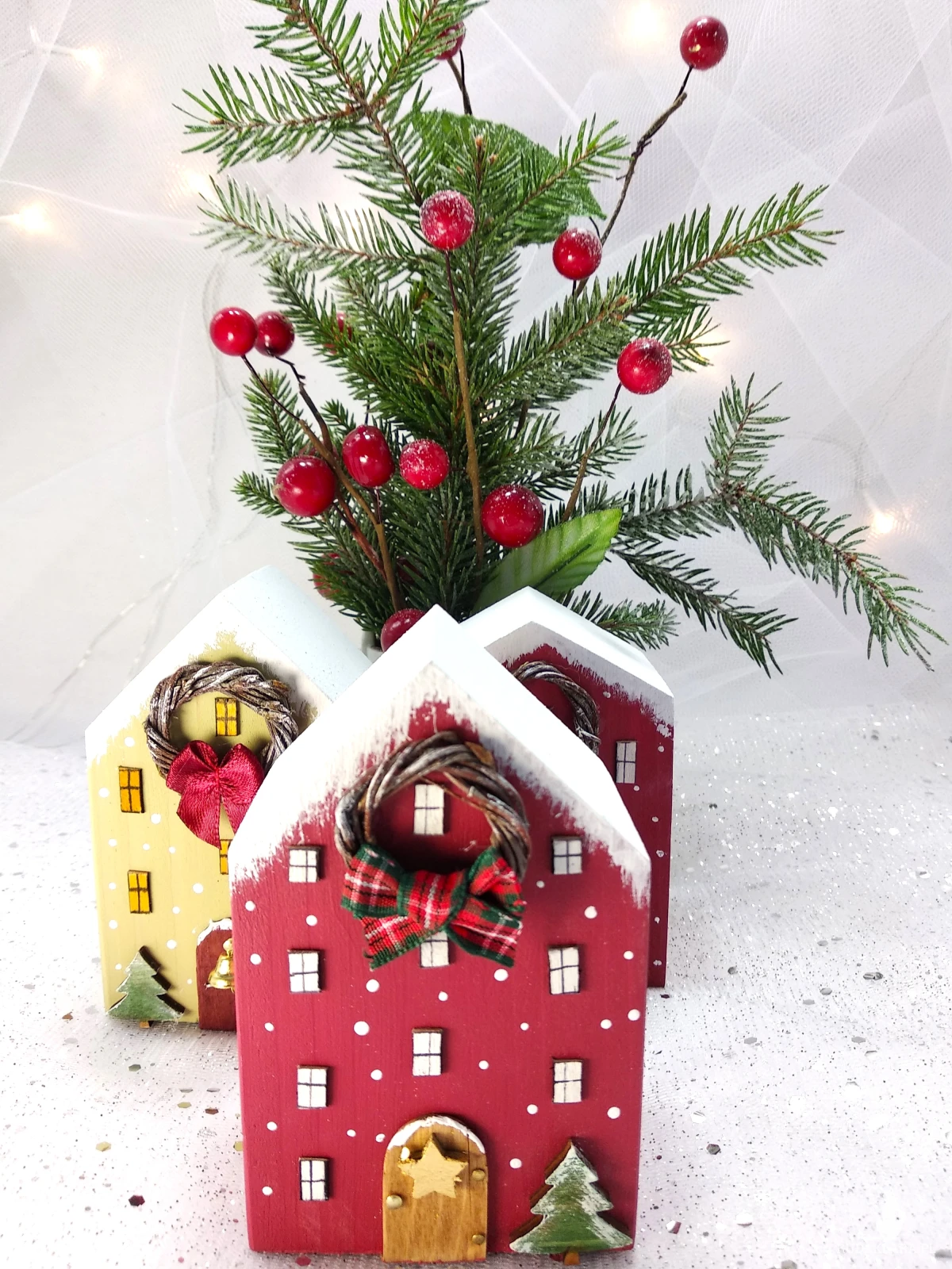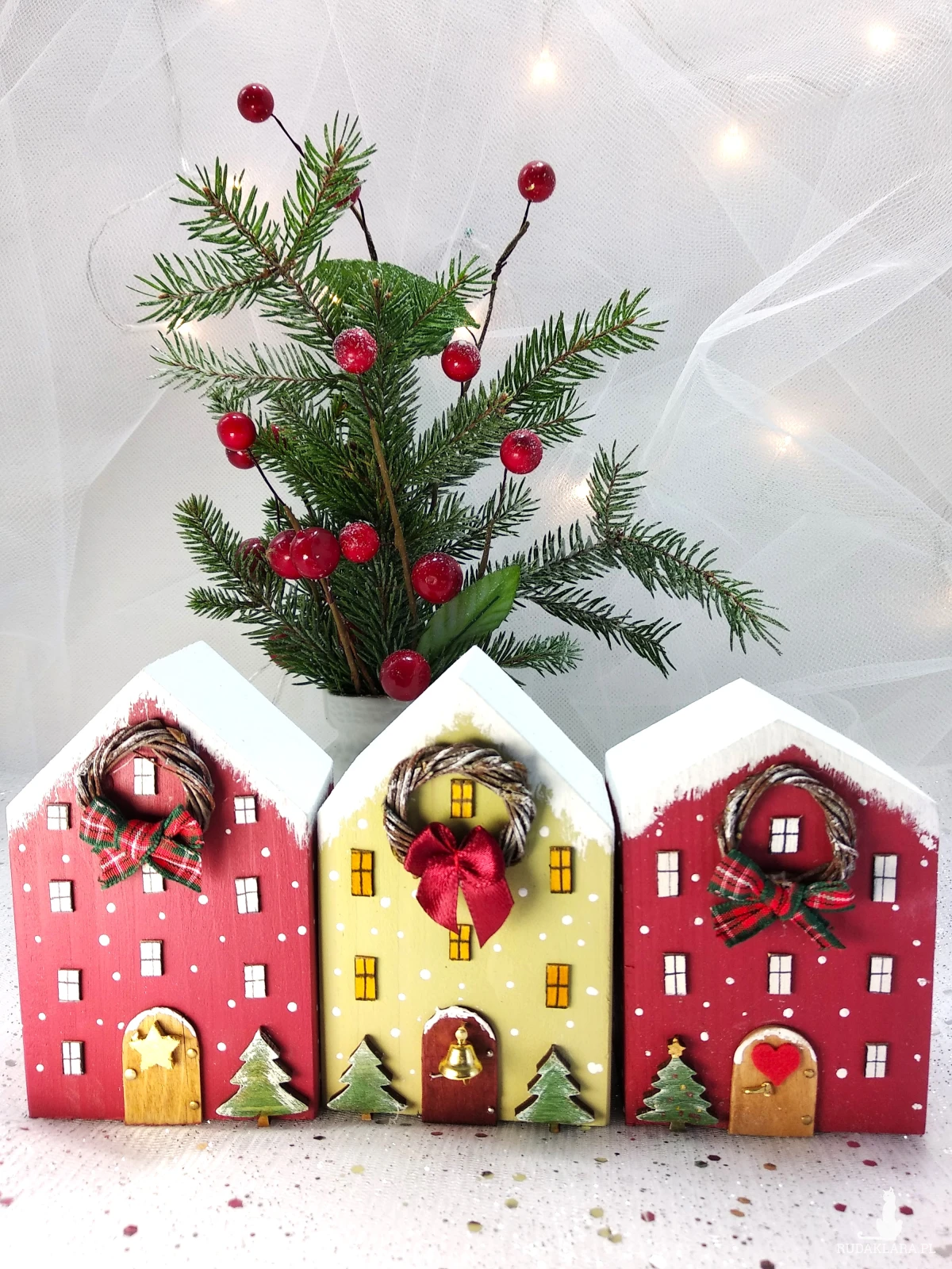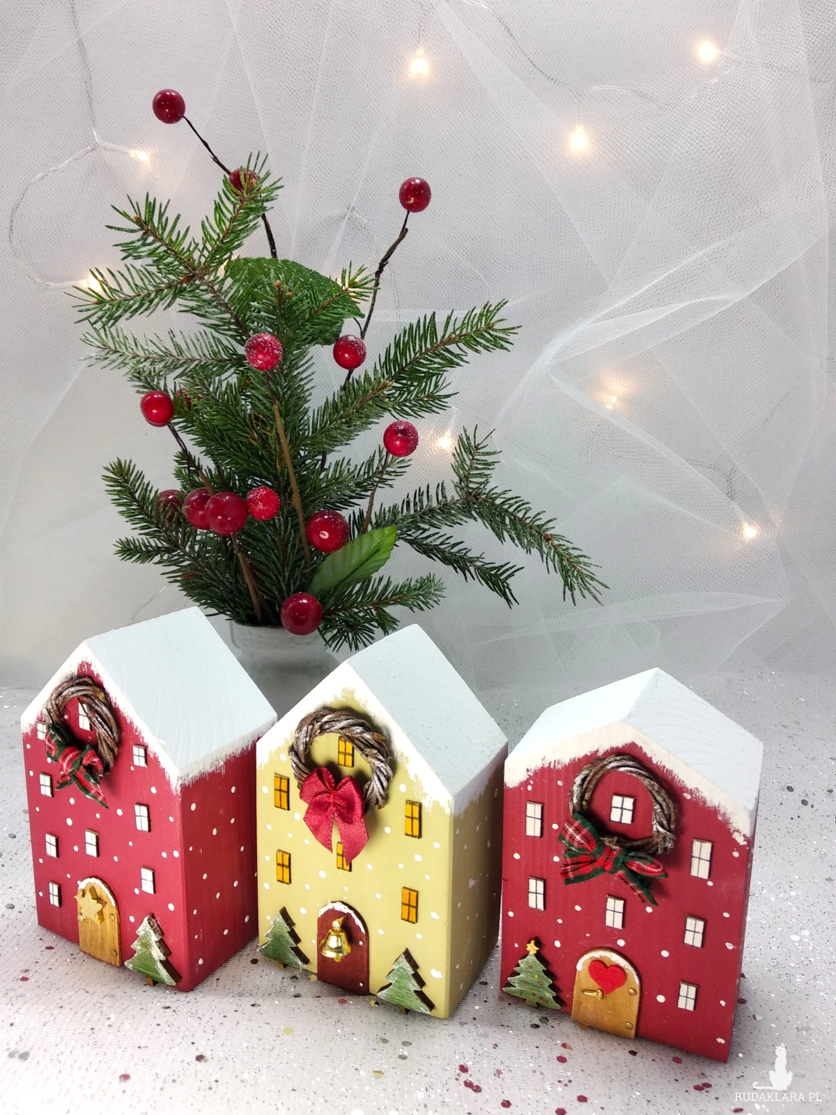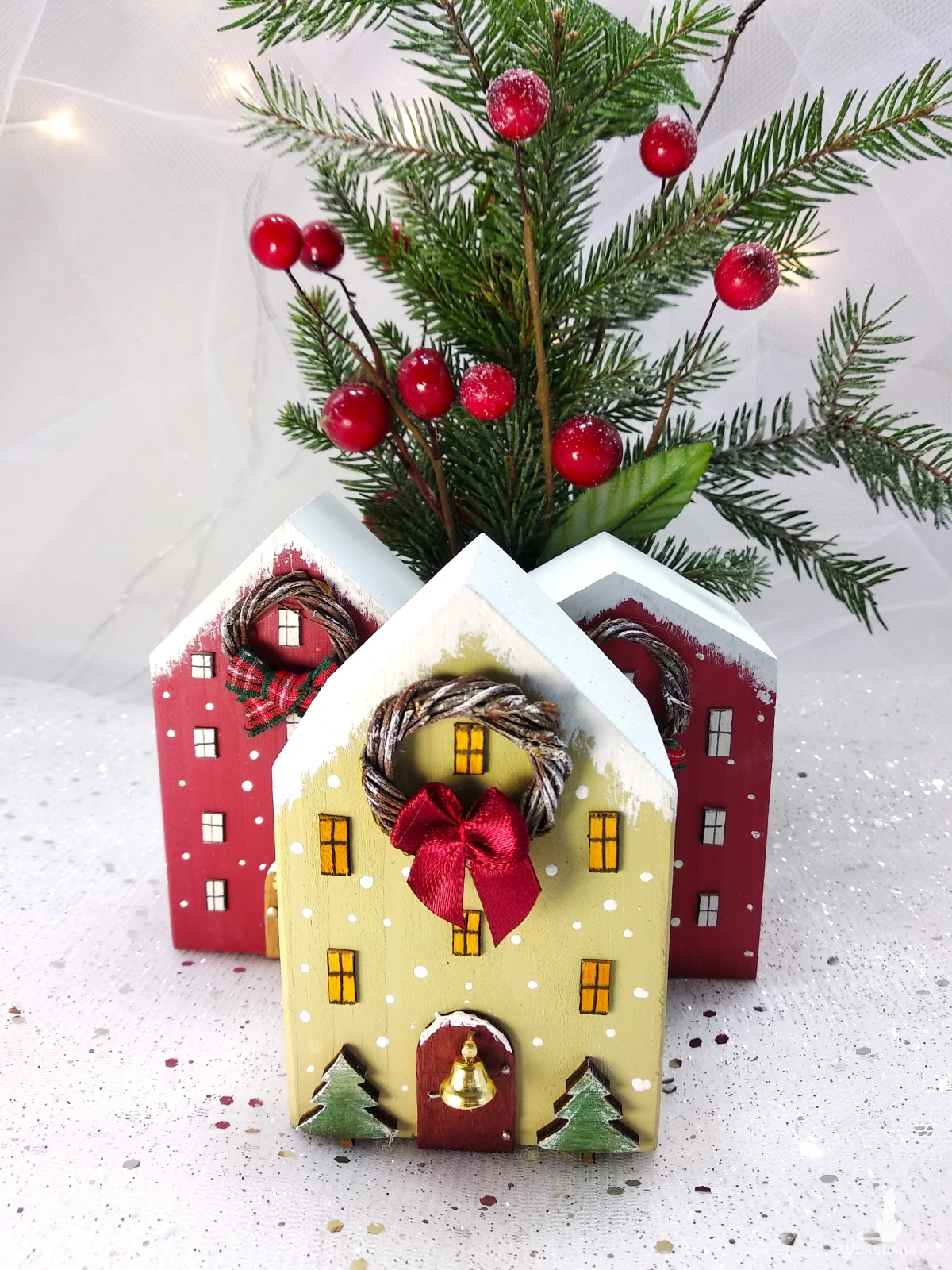 Trzy dekoracyjne domki wykonane są z drewna sosnowego i pomalowane akrylową ekologiczną farbą. Domki są uroczą i oryginalną dekoracją świąteczną, która wprowadzi do każdego wnętrza ciepłą i przytulną atmosferę. Mogą być samodzielną dekoracją, ale również elementem większej kompozycji np. postawione wsród choinek z moich innych aukcji. Świetnie prezentują się na półce, komodzie lub parapecie.