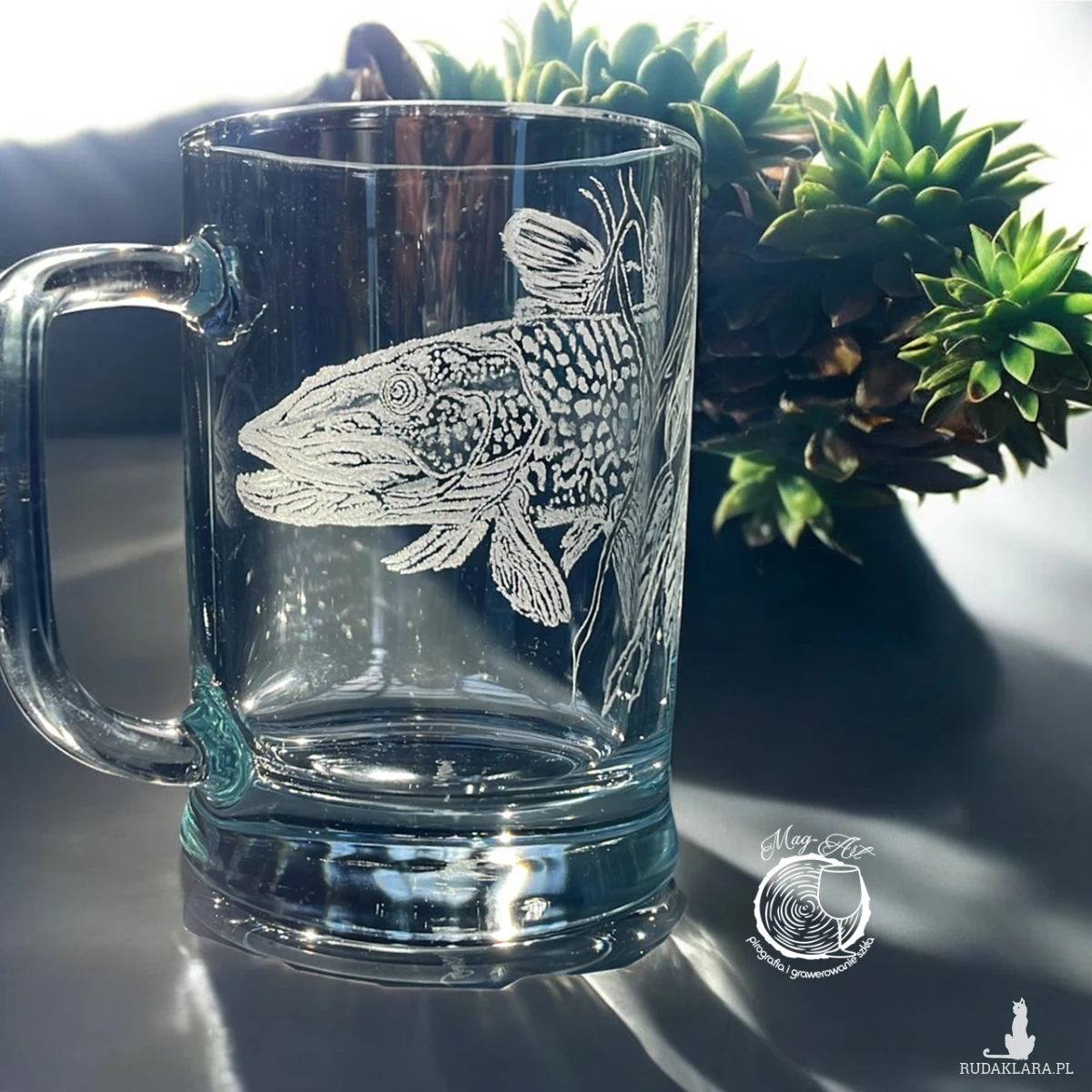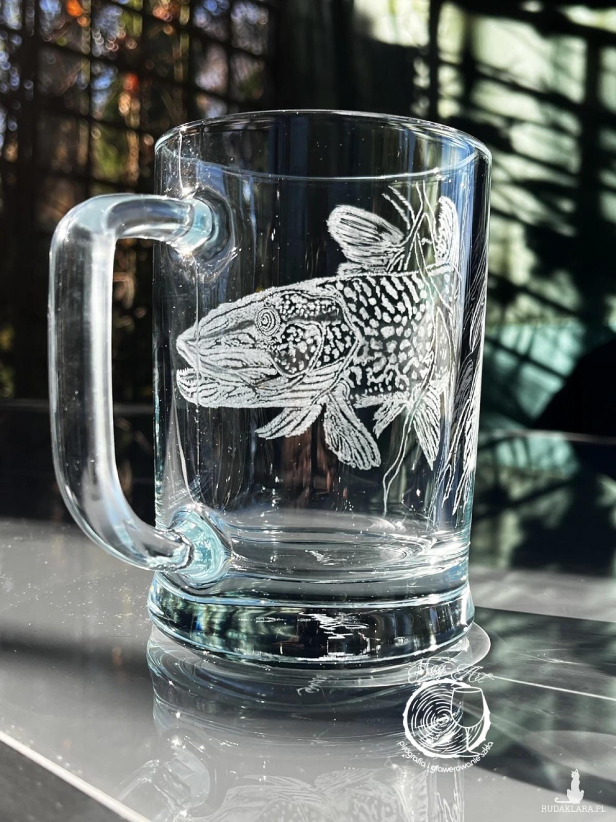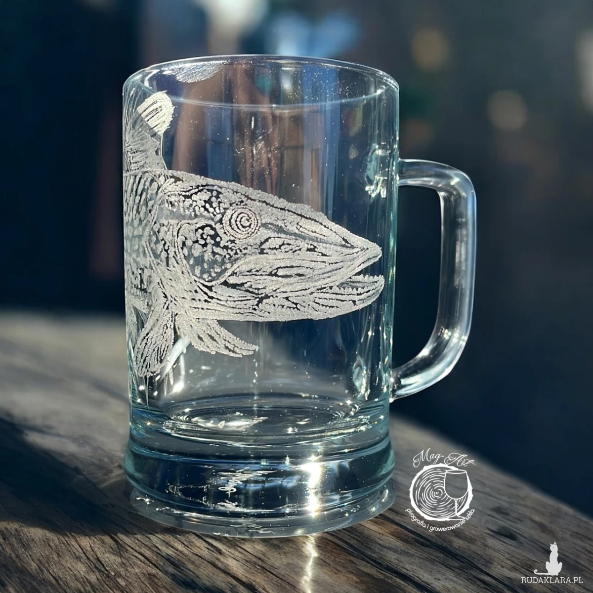 Egzemplarz został ręcznie grawerowany, dzięki czemu wzór szczupaka jest niepowtarzalny i pełen detali. Precyzyjny grawer wykonany na szkle pięknie odbija światło, nadając całości elegancki, rzemieślniczy charakter.