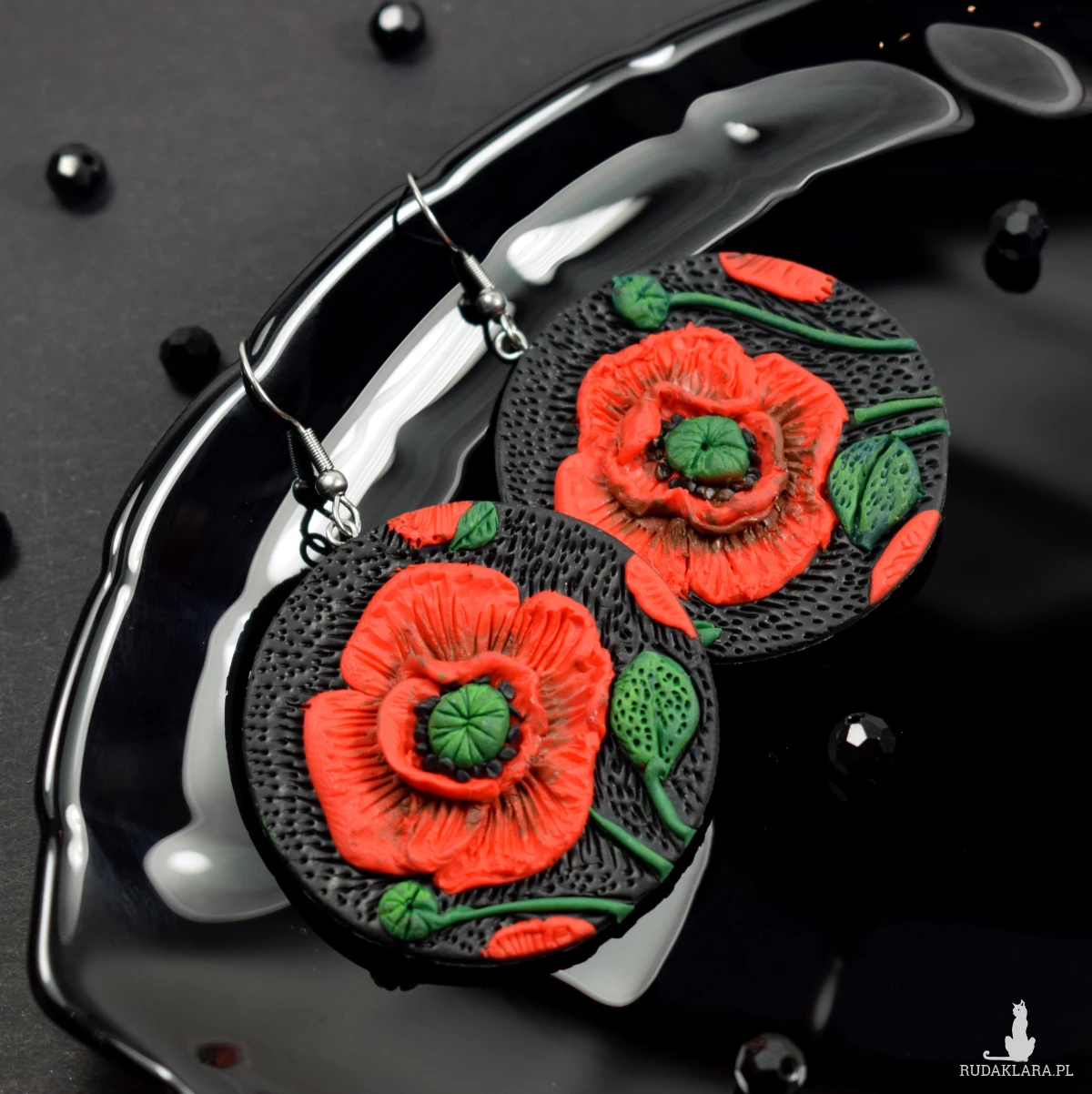 Eleganckie, duże kolczyki koła z motywem kwiatów maku. Przepiękne połączenie czerwieni i czerni z dodatkiem ziele sprawiają, że kolczyki są wyraziste i przyciągające uwagę.