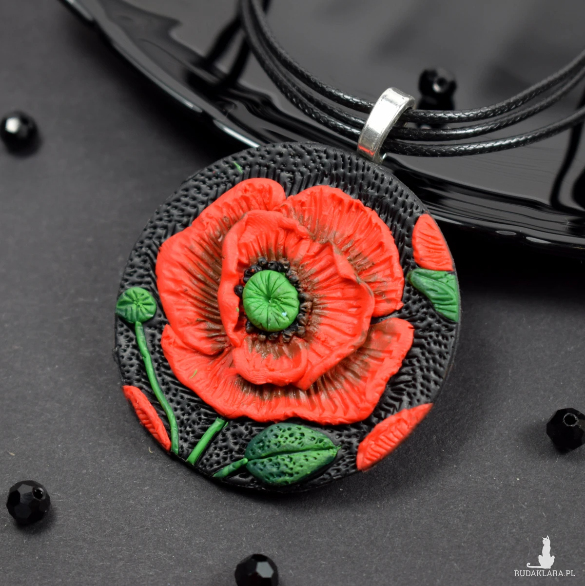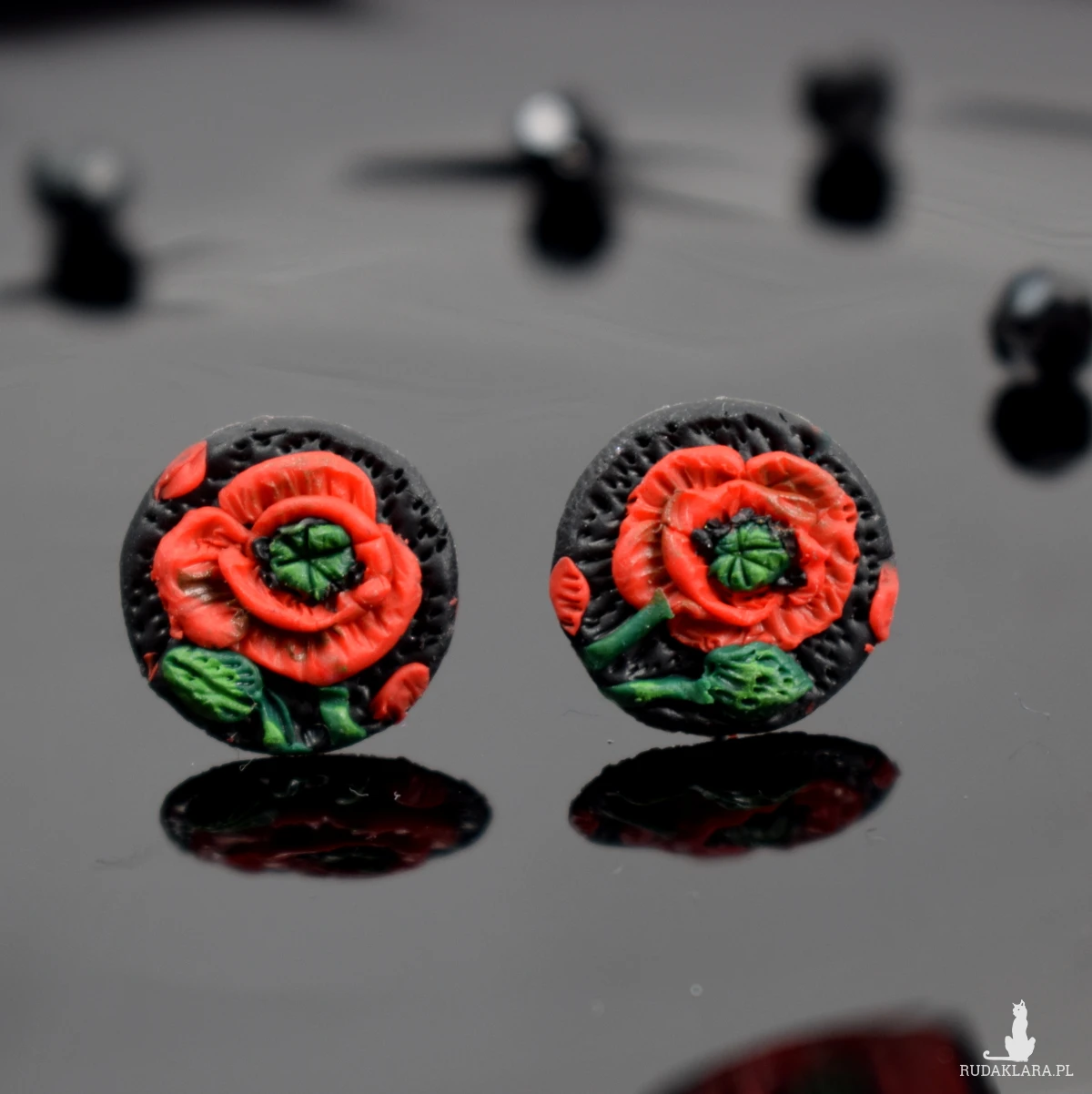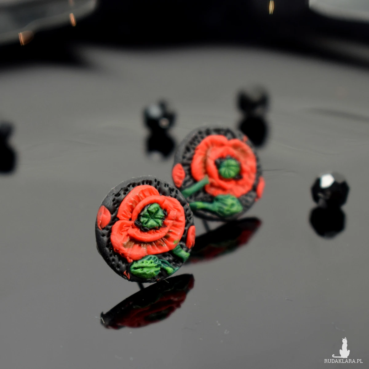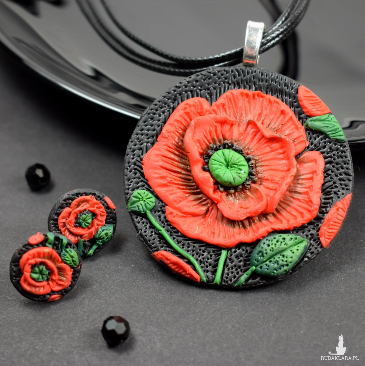 Wyjątkowy komplet biżuterii "czerwone maki", w skład którego wchodzi duży naszyjnik i kolczyki sztyfty.