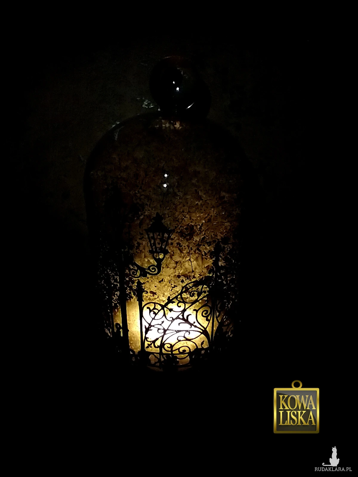 Wykonany na bazie szklanej kopułki z kulką lampion jest ozdobiony z zewnątrz elementami z czarnej folii. Zamknięte w środku prawdziwe gałązki imitują nagie drzewa. Obsypane szklanym pyłem niczym szronem, po włączeniu pięknie odbijają światło i skrzą się ciepłymi, złotymi akcentami.