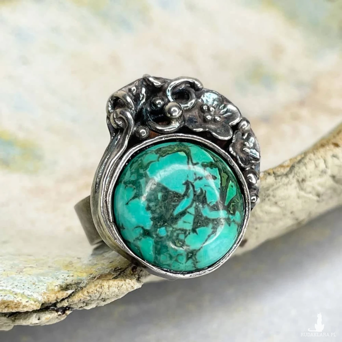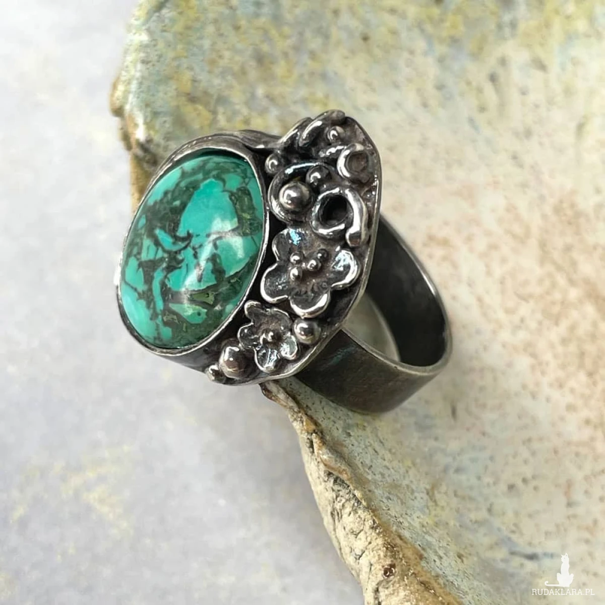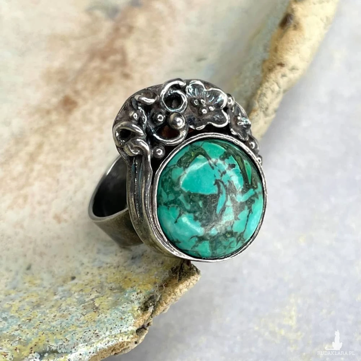 Wyjątkowy pierścień, w którym turkus afrykański o wyrazistym wzorze harmonijnie komponuje się ze srebrną oprawą, misternie zdobioną kwiatowymi motywami. Organiczne kształty i delikatne motywy kwiatowe nadają mu romantycznego charakteru, podkreślając naturalne piękno kamienia, czyniąc go efektownym dodatkiem na ważne okazje. Staranność wykonania i klasyczne wzornictwo czynią go doskonałym wyborem dla osób ceniących ponadczasową biżuterię.