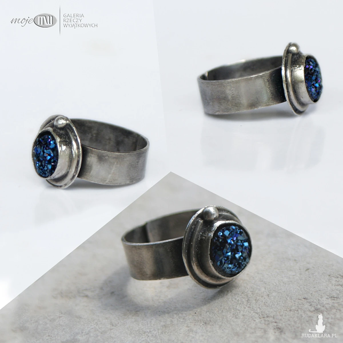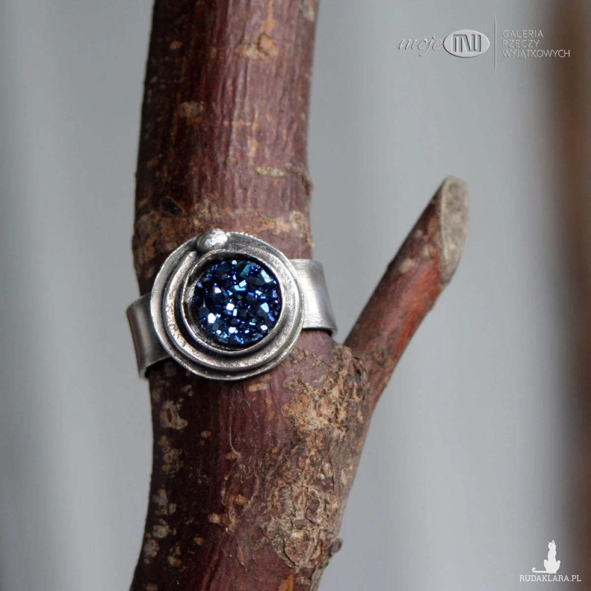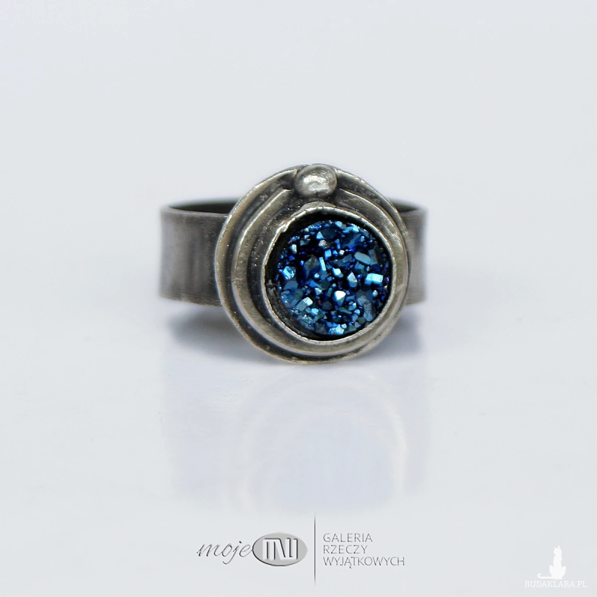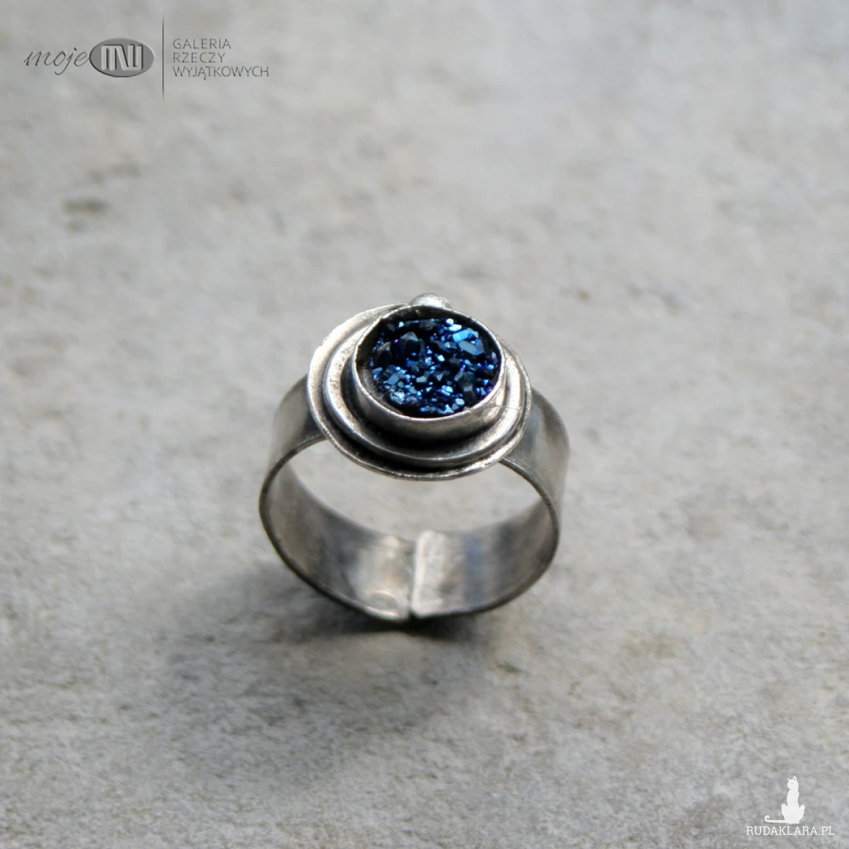 Pierścionek ze srebra z tytanową druzą. Okrągły kamień, pobłyskujący granatowo, oprawiony prosto w srebro delikatnie oksydowane.
