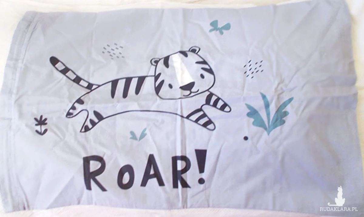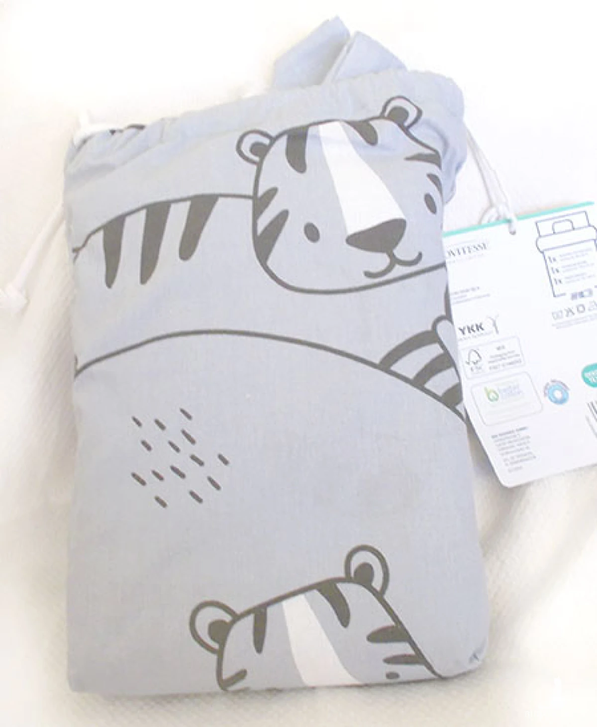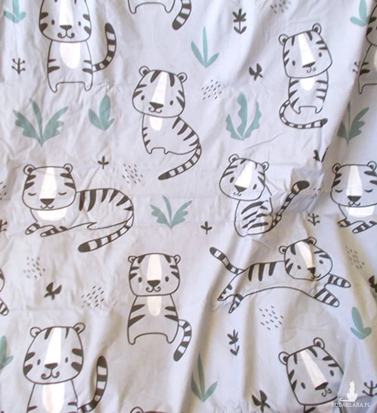 Nowy komplet pościeli dla dziecka: chłopczyka lub dziewczynki. Materiał: 100% bawełna, standard "Oeko Tex". Zapinane na zamek błyskawiczny. Wzór w tygryski. Marka "Novitesse". Zestaw zapakowany jest w bawełnianym woreczku. Wymiary: