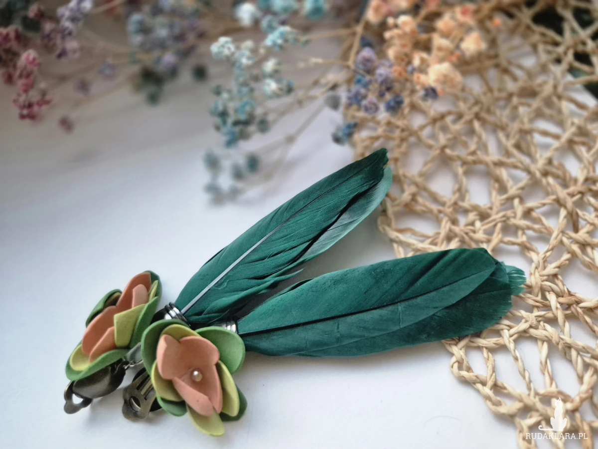 Klipsy zielone kwiaty i pióra rękodzieło wykonane w pojedynczo na egzemplarzu lekkie i duże polecam