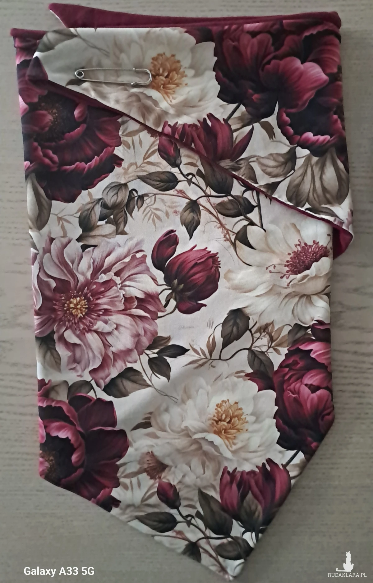 Dwustronna chusta jest uszyta z dresówki drapanej i wzorzystego jerseyu. Mitenki z dresówki drapanej.