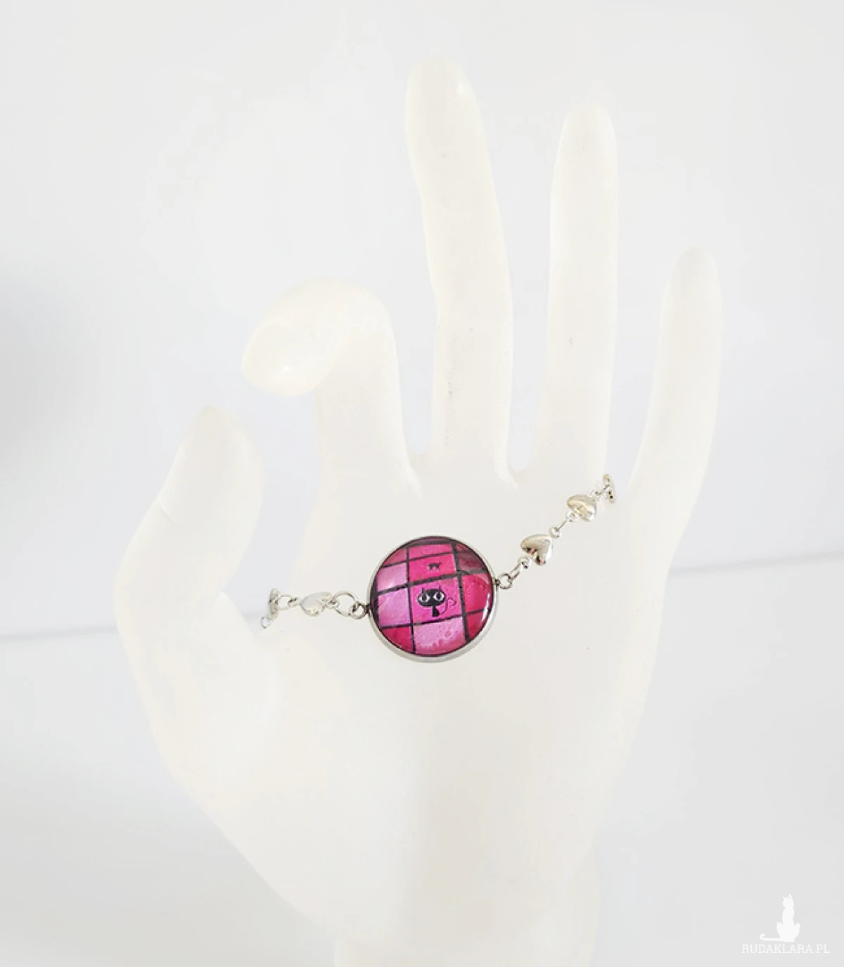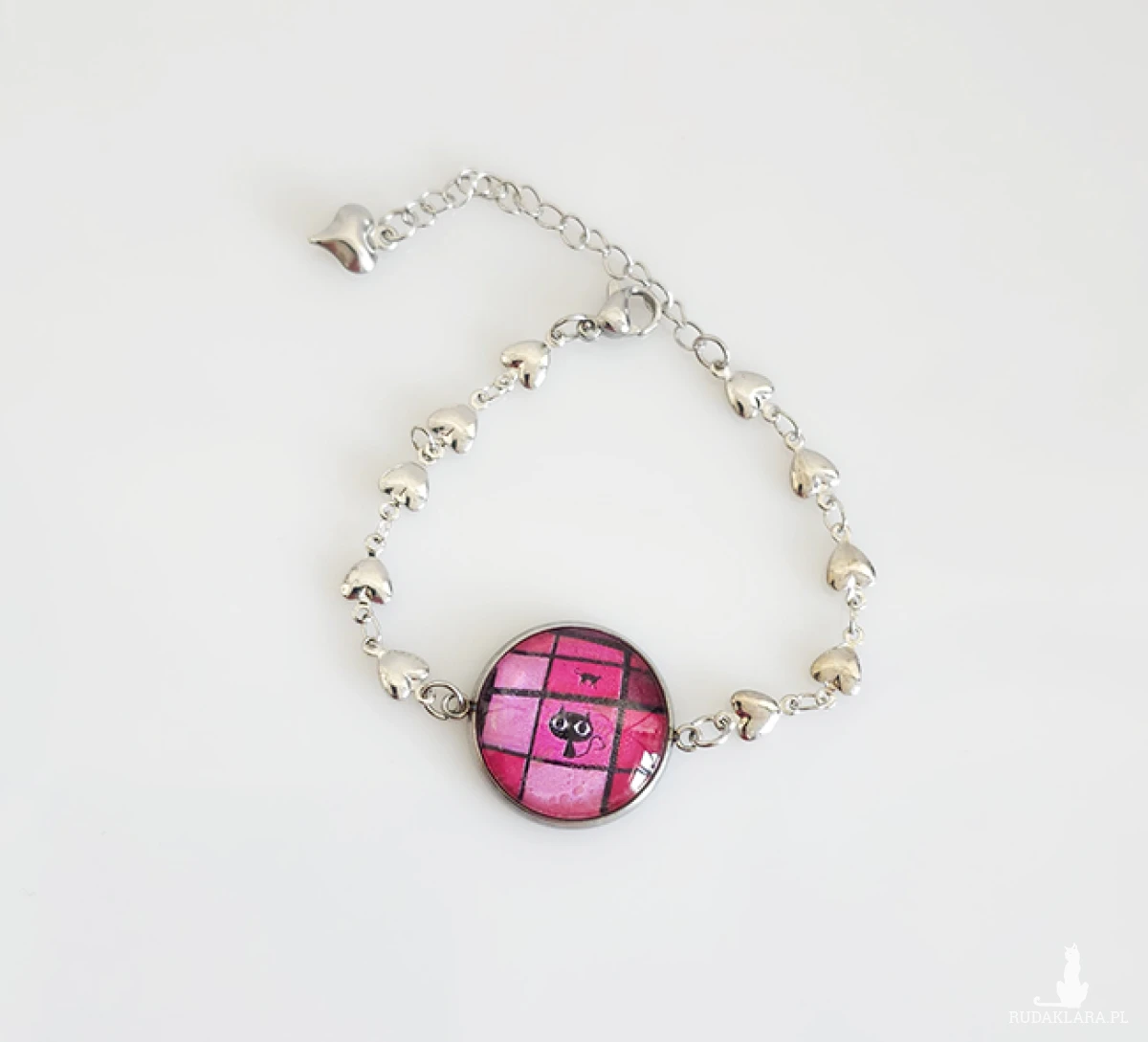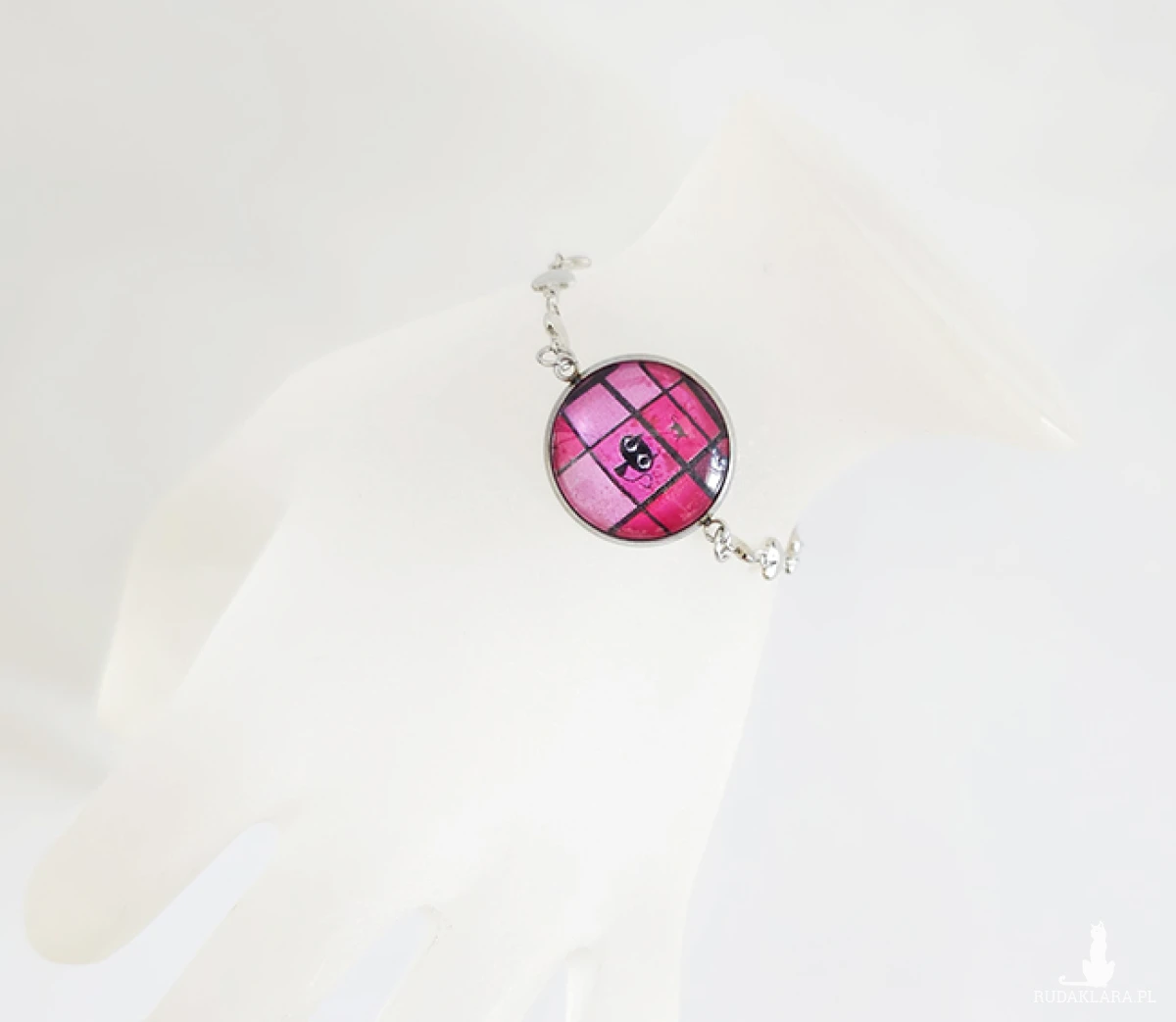 Z centralnym elementem przedstawiającym uroczego, czarnego kotka na różowym tle w kratkę, ta biżuteria doda charakteru każdej stylizacji.